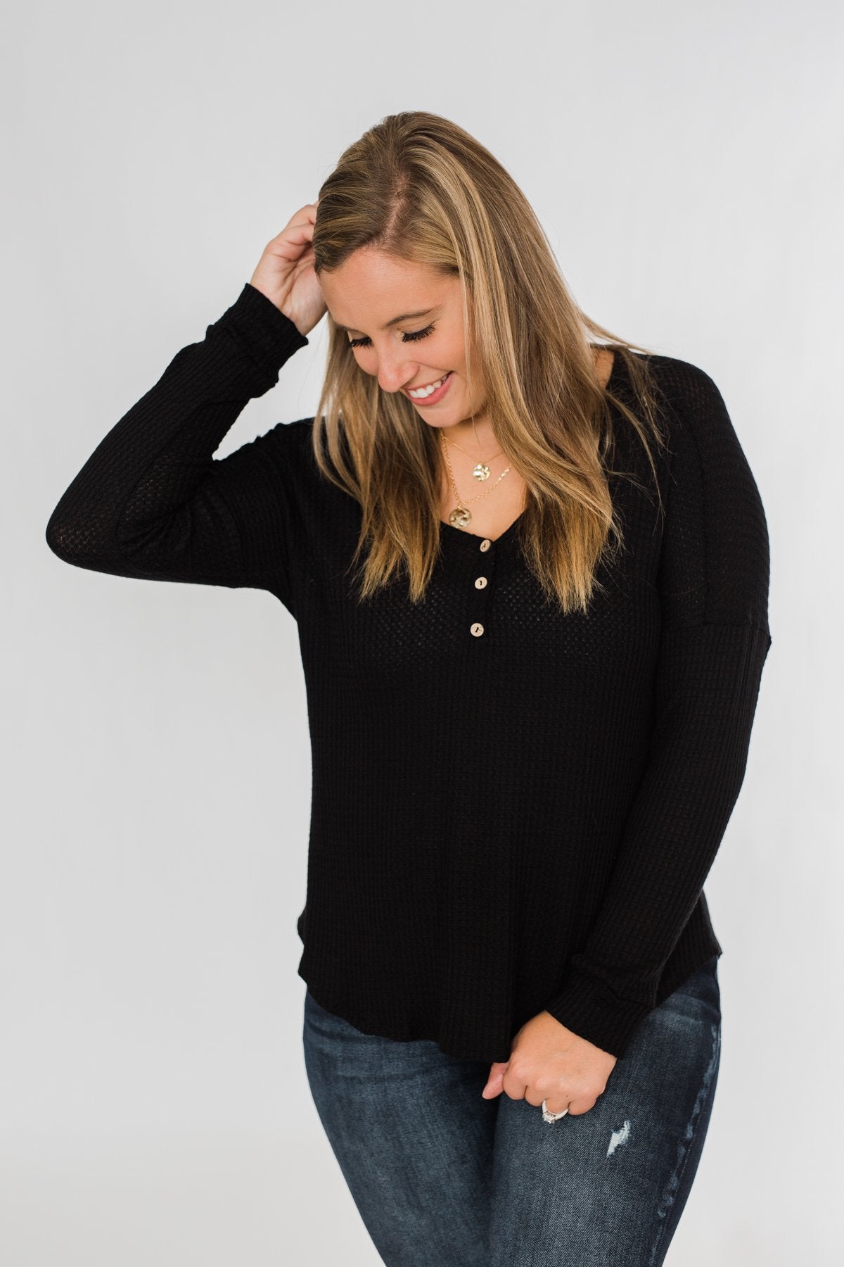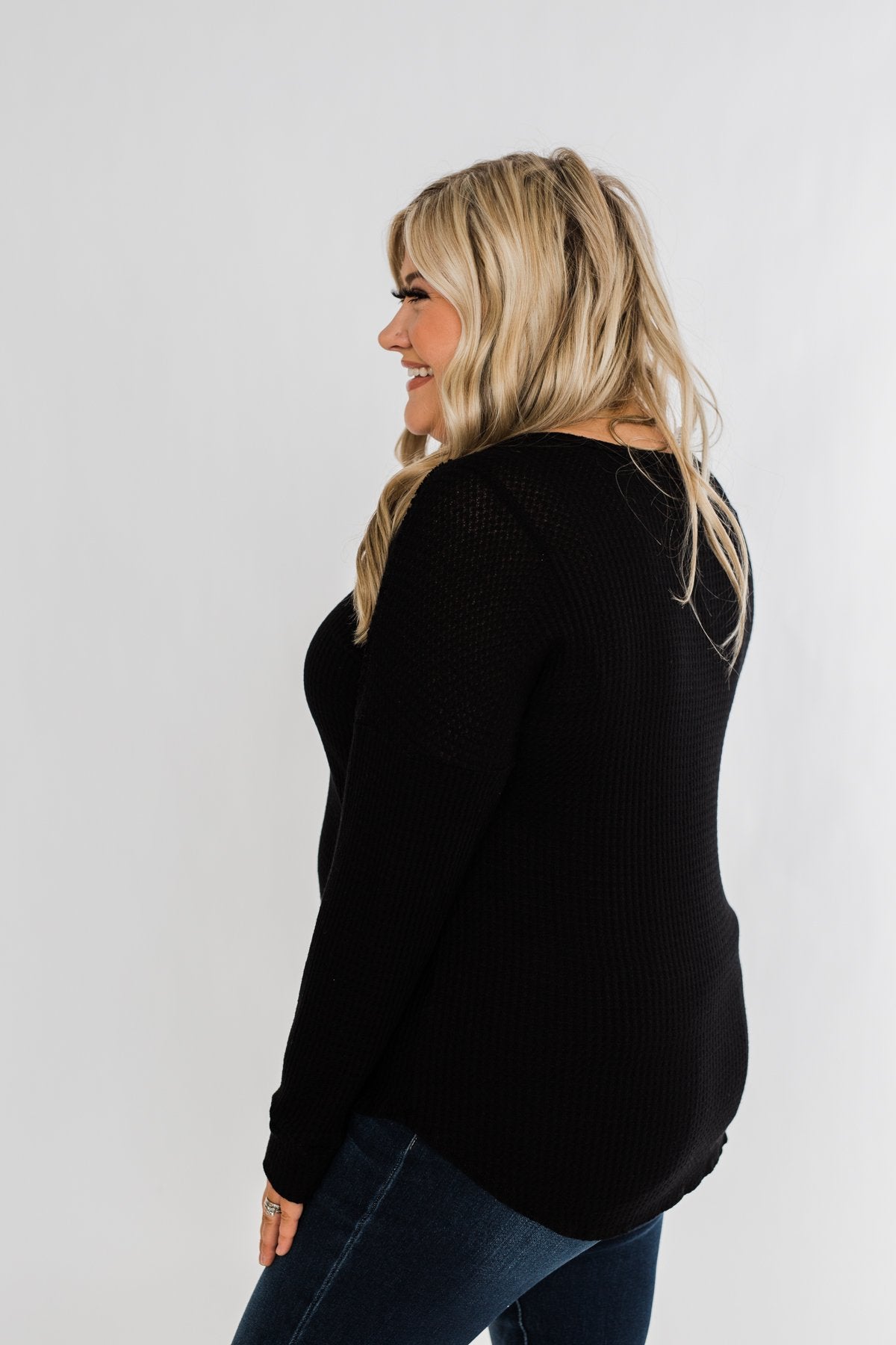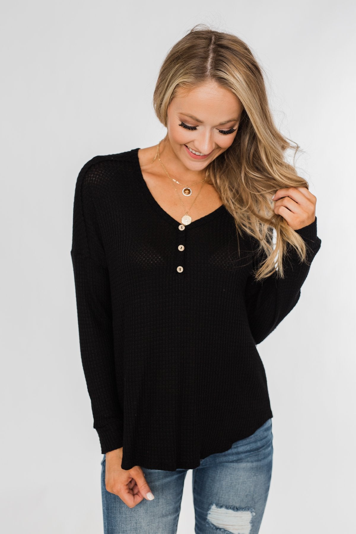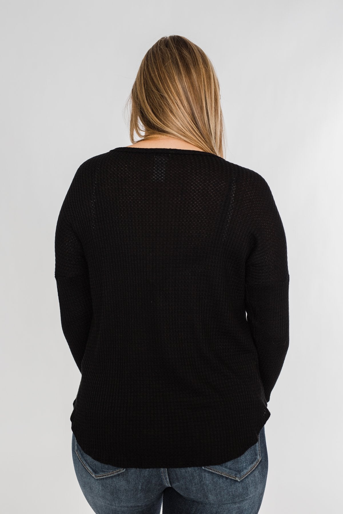 Take on the day with this cute and casual long sleeve top! Featuring a non-functional button neckline on a soft, breathable waffle knit material that is sure to keep a smile on your face all day long. Pair this with a denim jacket and some bold booties for the ultimate outfit for the upcoming seasons! This charming top is the perfect mixture of cute and casual making it the ideal top to add to your seasonal wardrobe!
