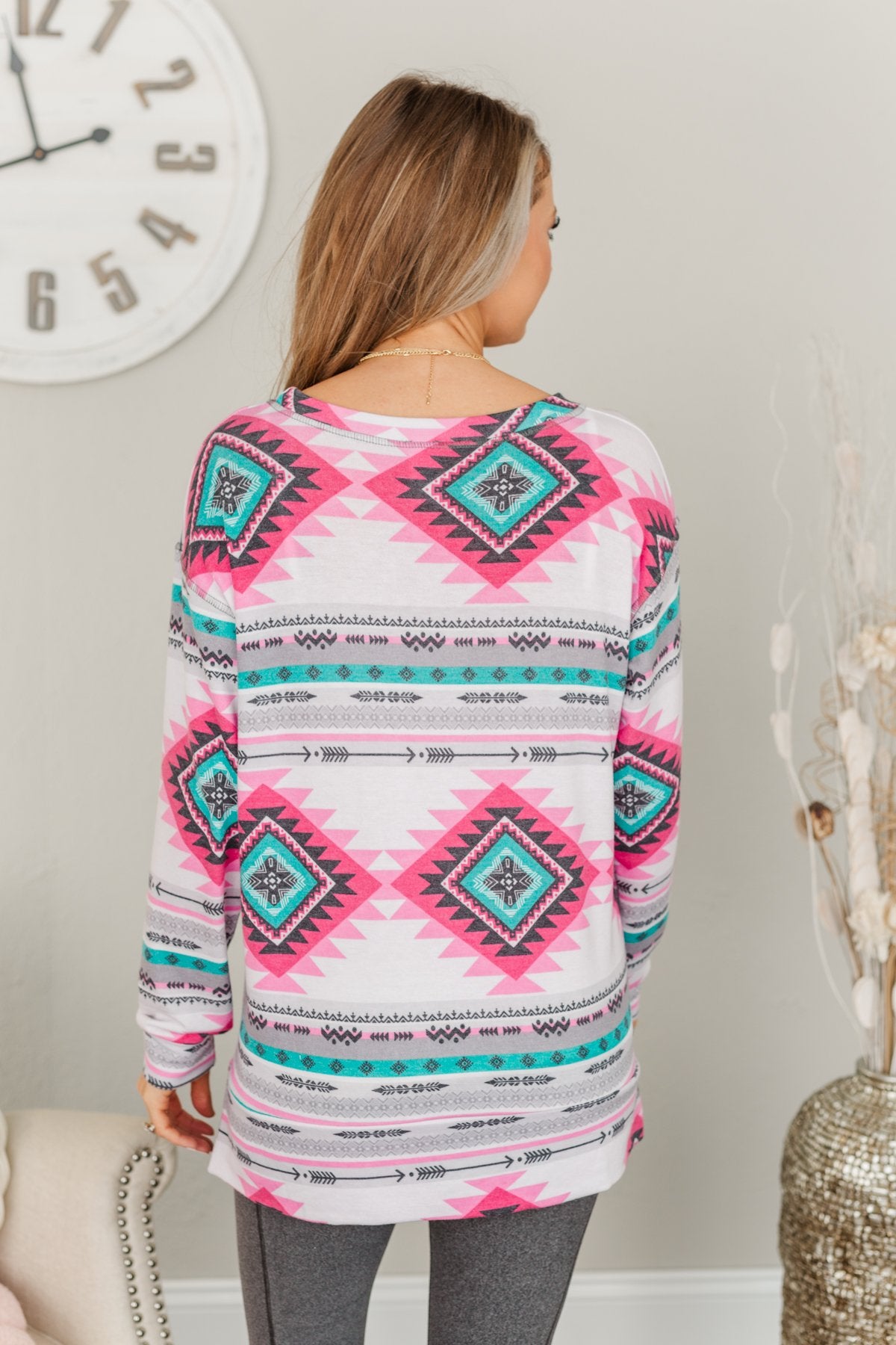 Live For The Adventure Aztec Top- Ivory, Fuchsia, & Teal