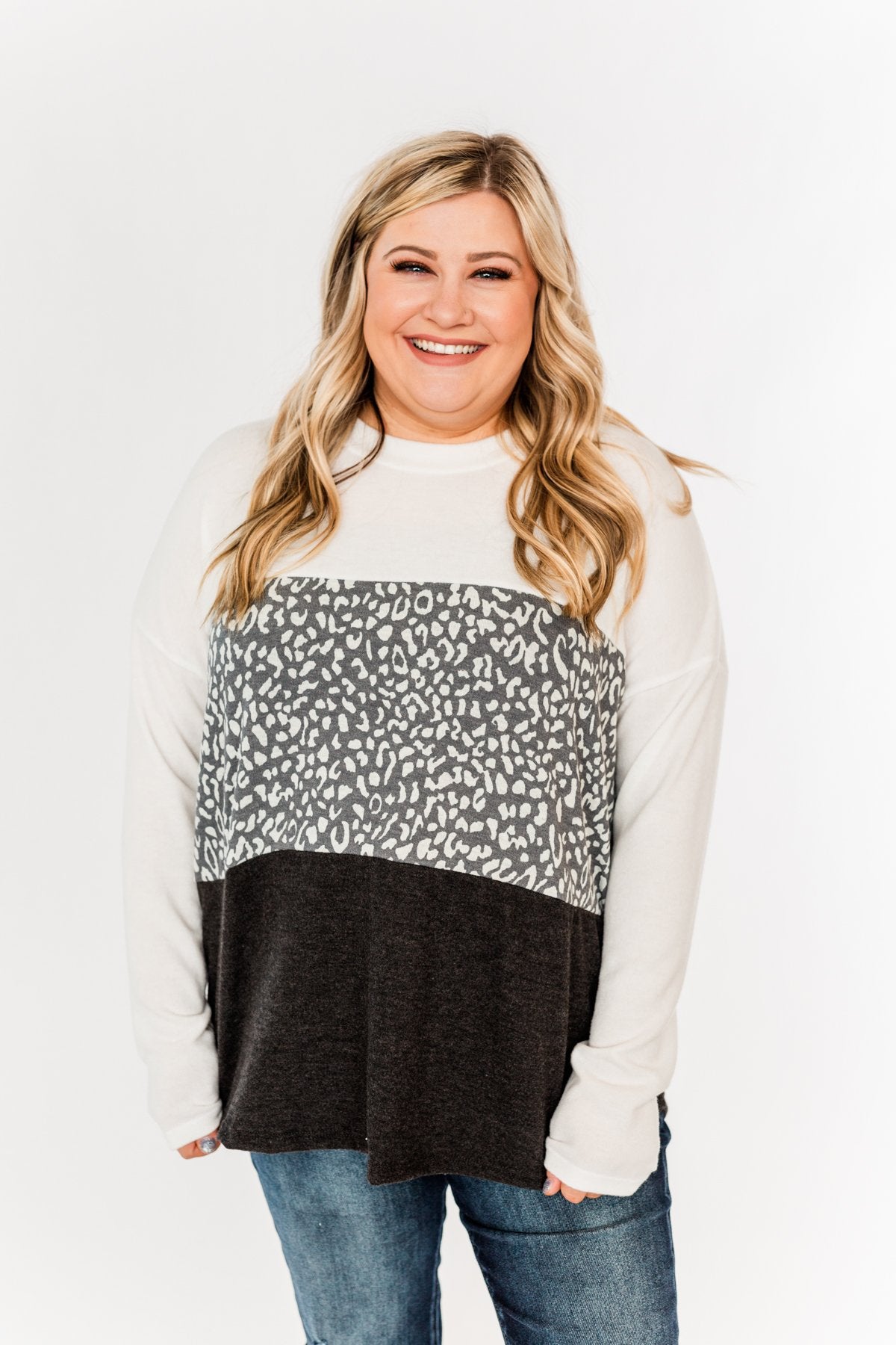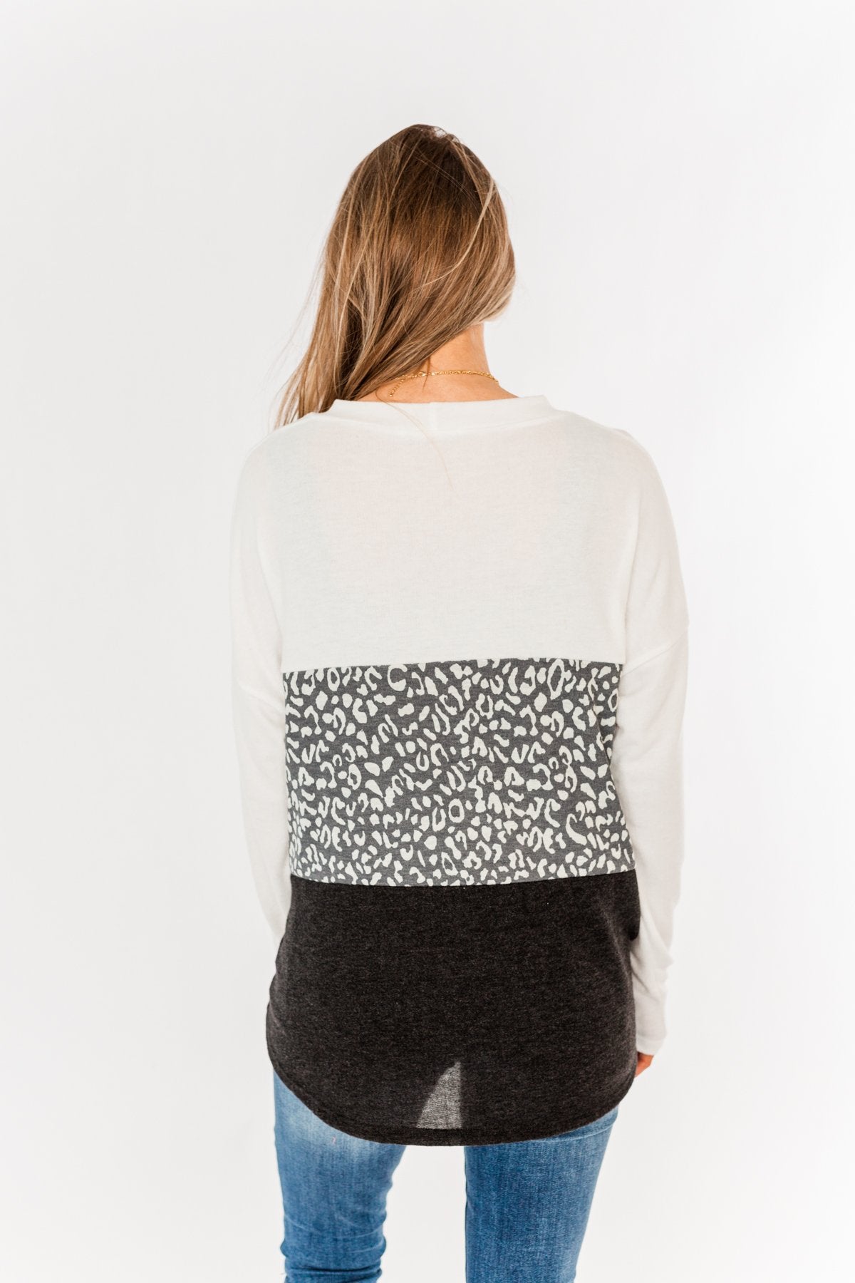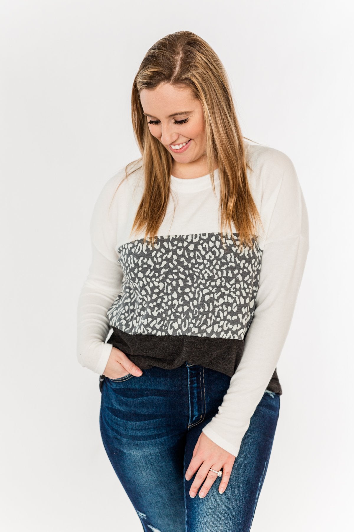Spice up your seasonal wardrobe with something sweet in this long sleeve leopard top! Showcasing small details such as the scoop neckline, color block style and lively leopard print that will add that touch of simplistic style you've been looking for. The neutral color palette also makes this top pair perfectly with just about any color!