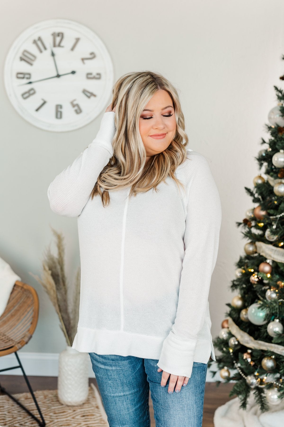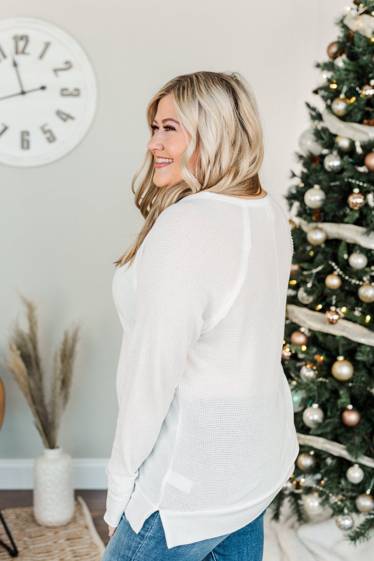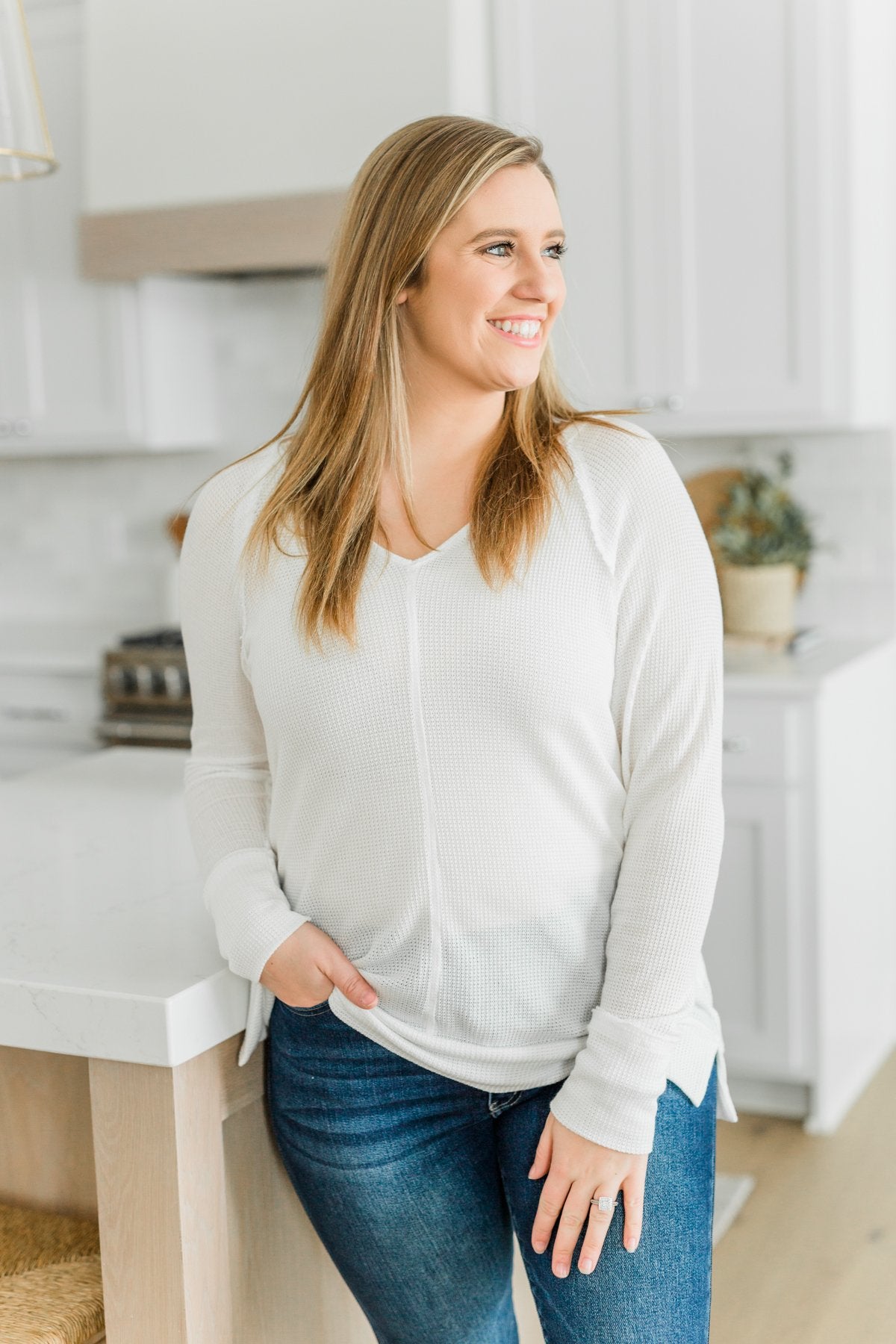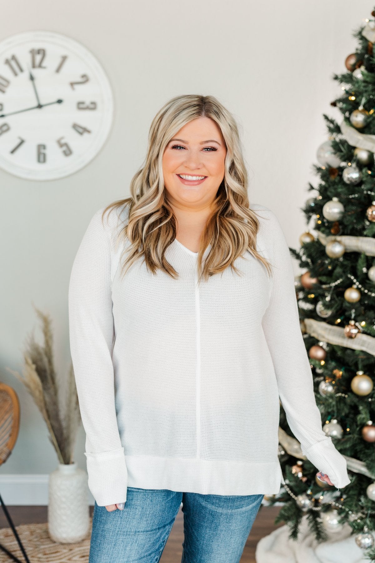 Enjoy the wonders of Winter with this adorable thermal knit, long sleeve top! Featuring all the details you're looking for such as a notched v-neckline, a raw center seam detail and small side slits! Pair this oversized top with your favorite high waisted jeans and booties for an essential Fall look!