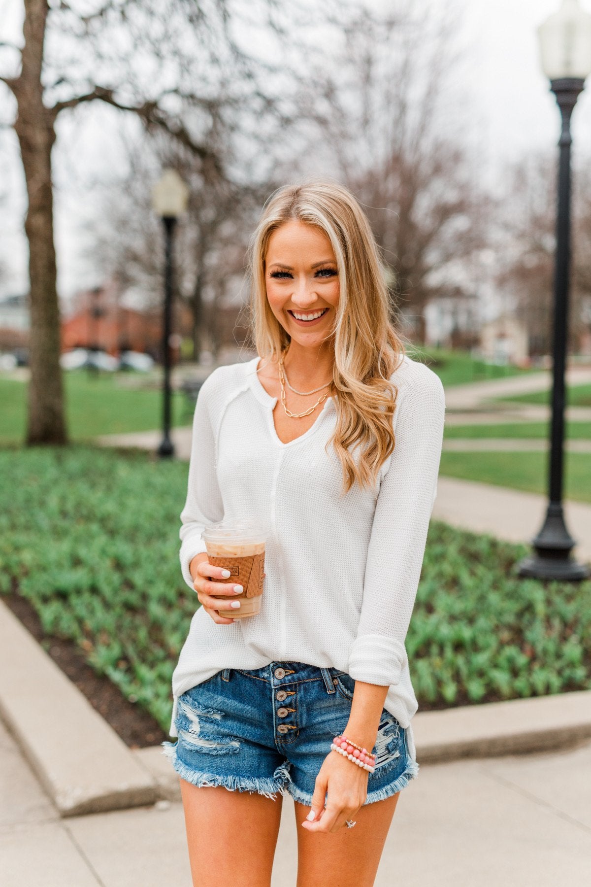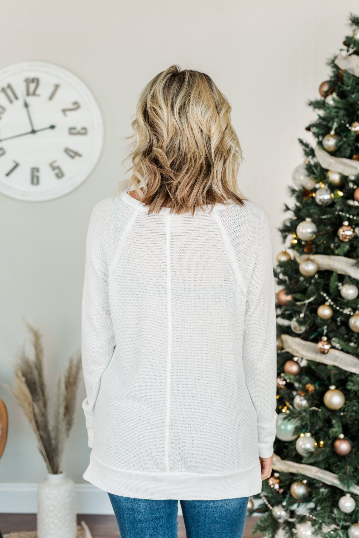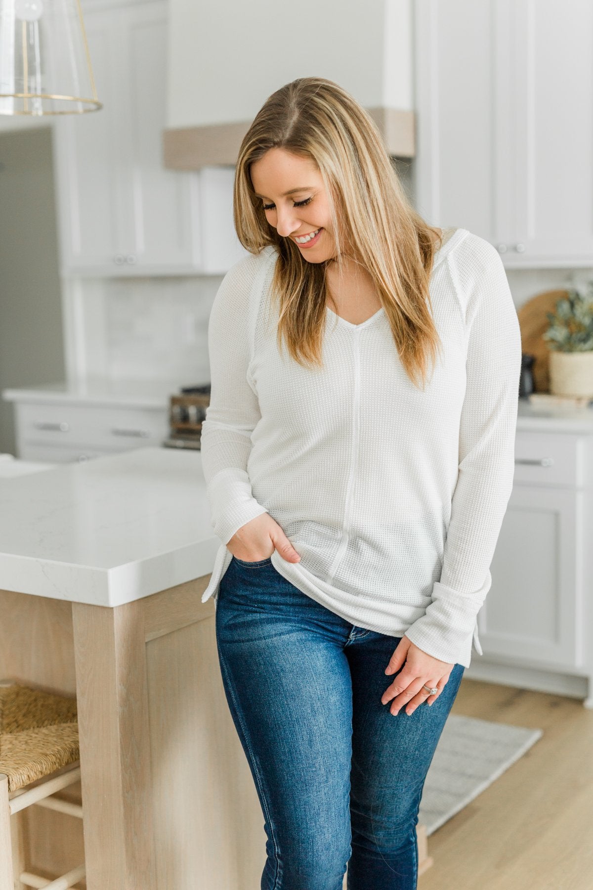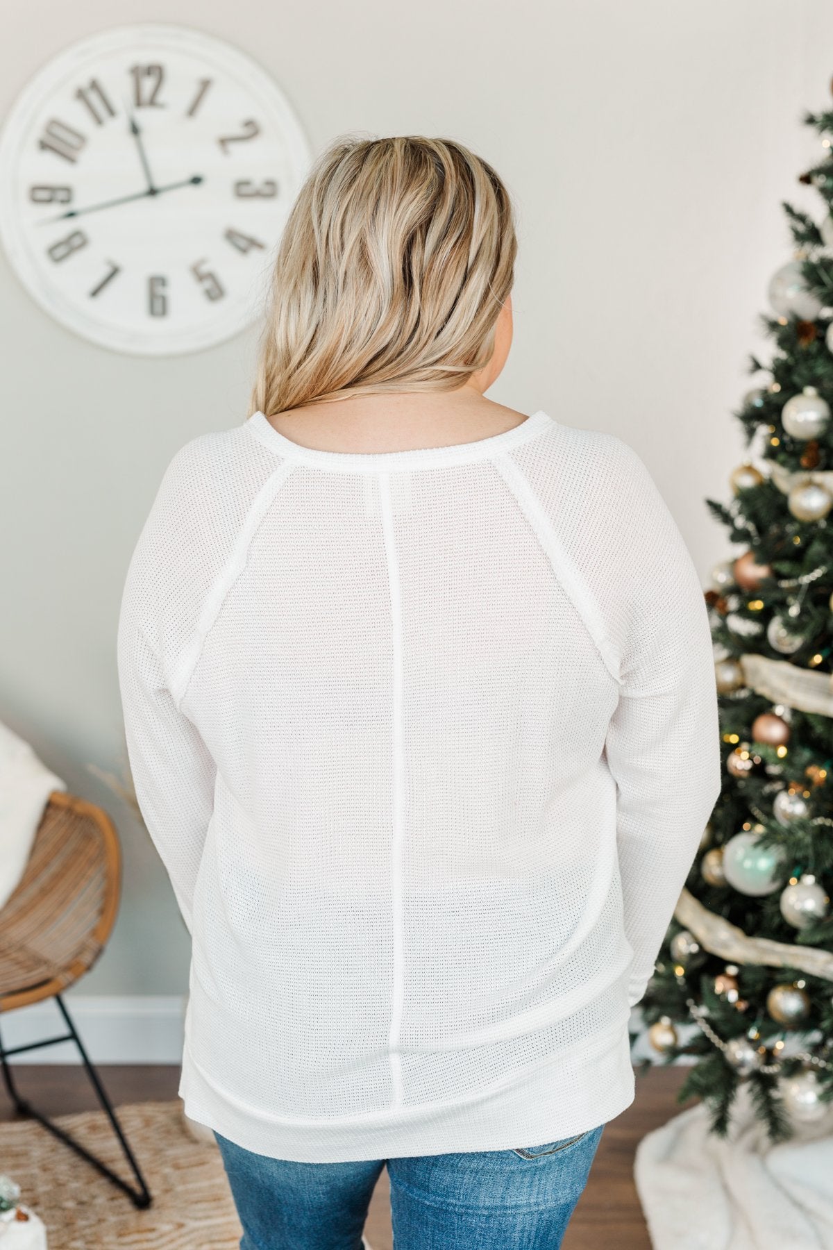 Enjoy the wonders of Winter with this adorable thermal knit, long sleeve top! Featuring all the details you're looking for such as a notched v-neckline, a raw center seam detail and small side slits! Pair this oversized top with your favorite high waisted jeans and booties for an essential Fall look!