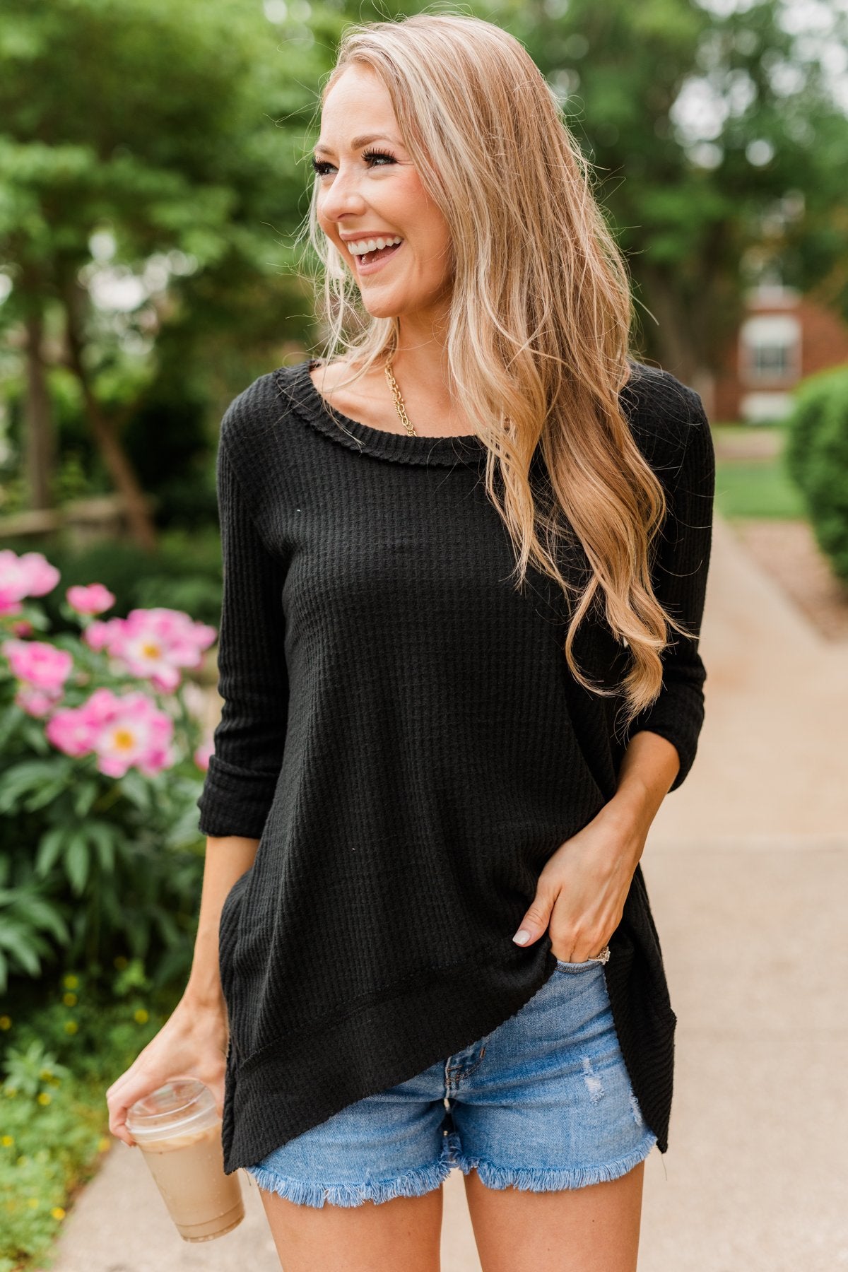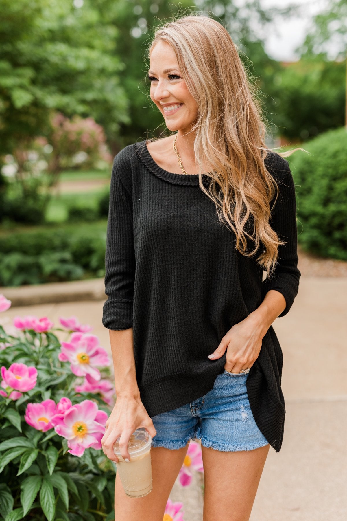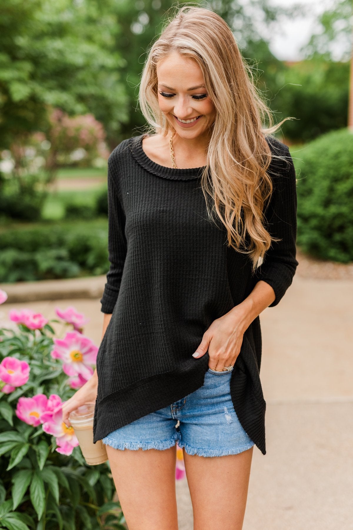 Start your day off right with this black long sleeve thermal top! The featured raw seams will spice up your look and the versatile black color pairs well with any outfit! Perfect for those days where you just need a grab and go item to complete your look this coming winter season!