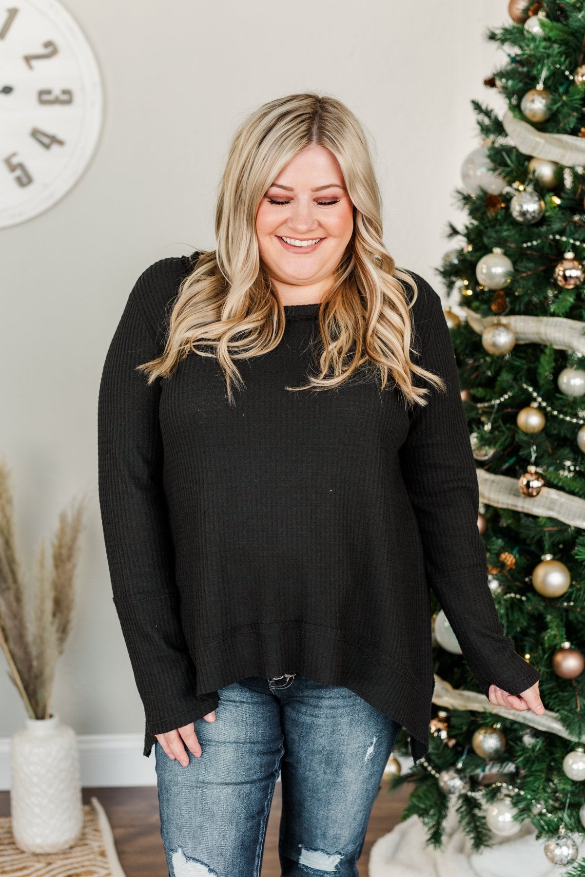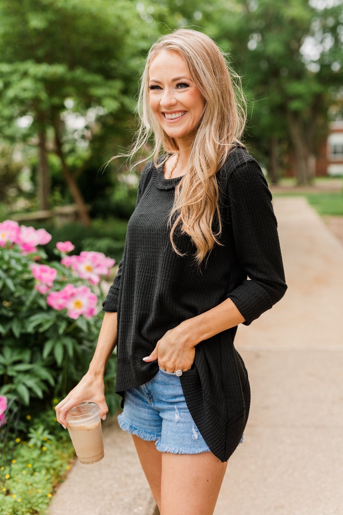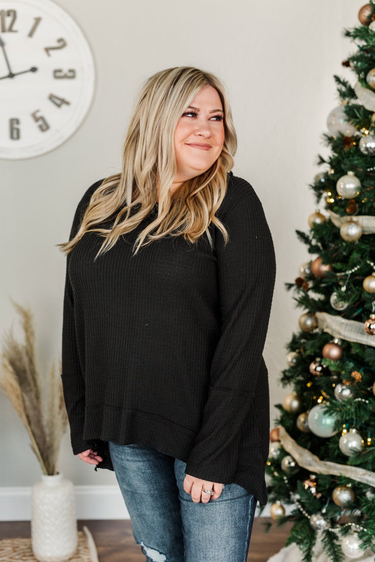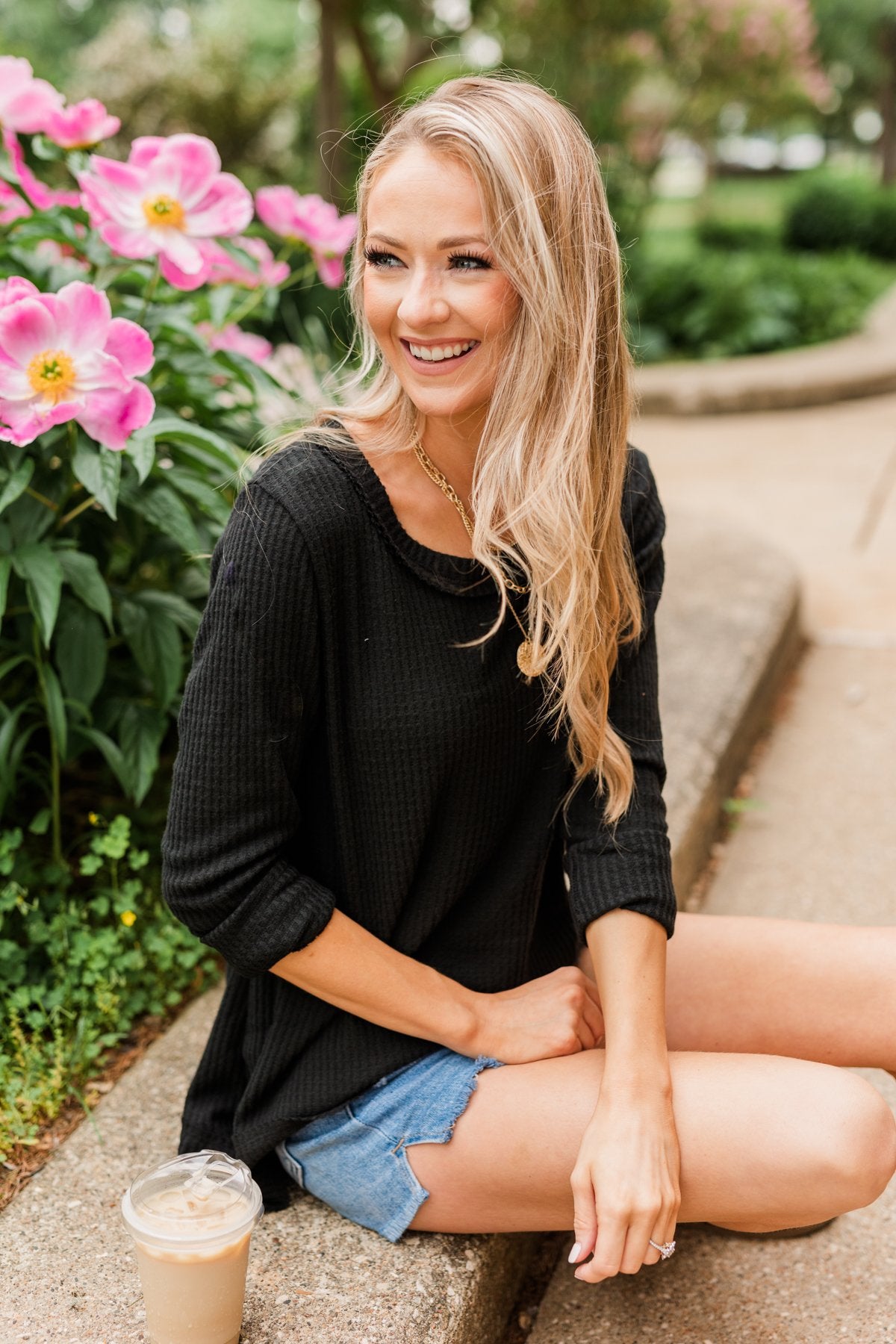 Start your day off right with this black long sleeve thermal top! The featured raw seams will spice up your look and the versatile black color pairs well with any outfit! Perfect for those days where you just need a grab and go item to complete your look this coming winter season!