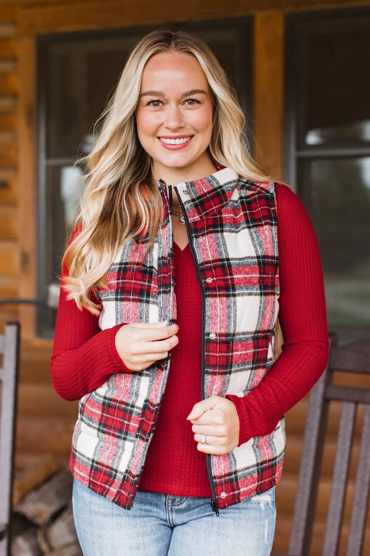 For You Always Plaid Puffer Vest- Red & White