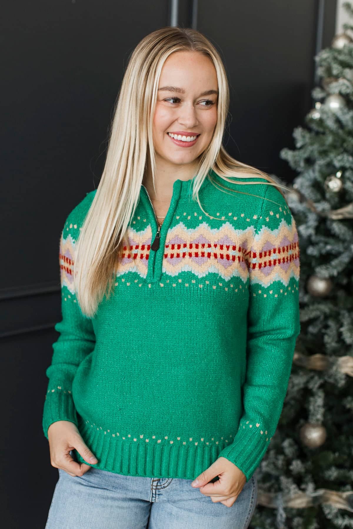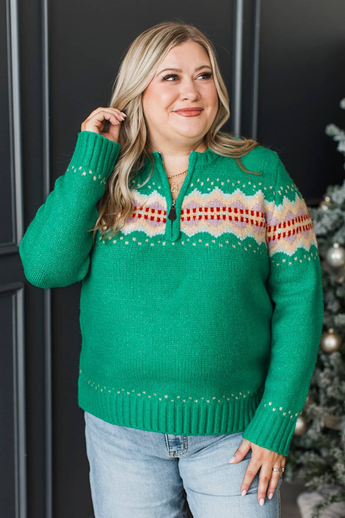 Cozy Getaway Quarter Zip Knit Sweater- Green