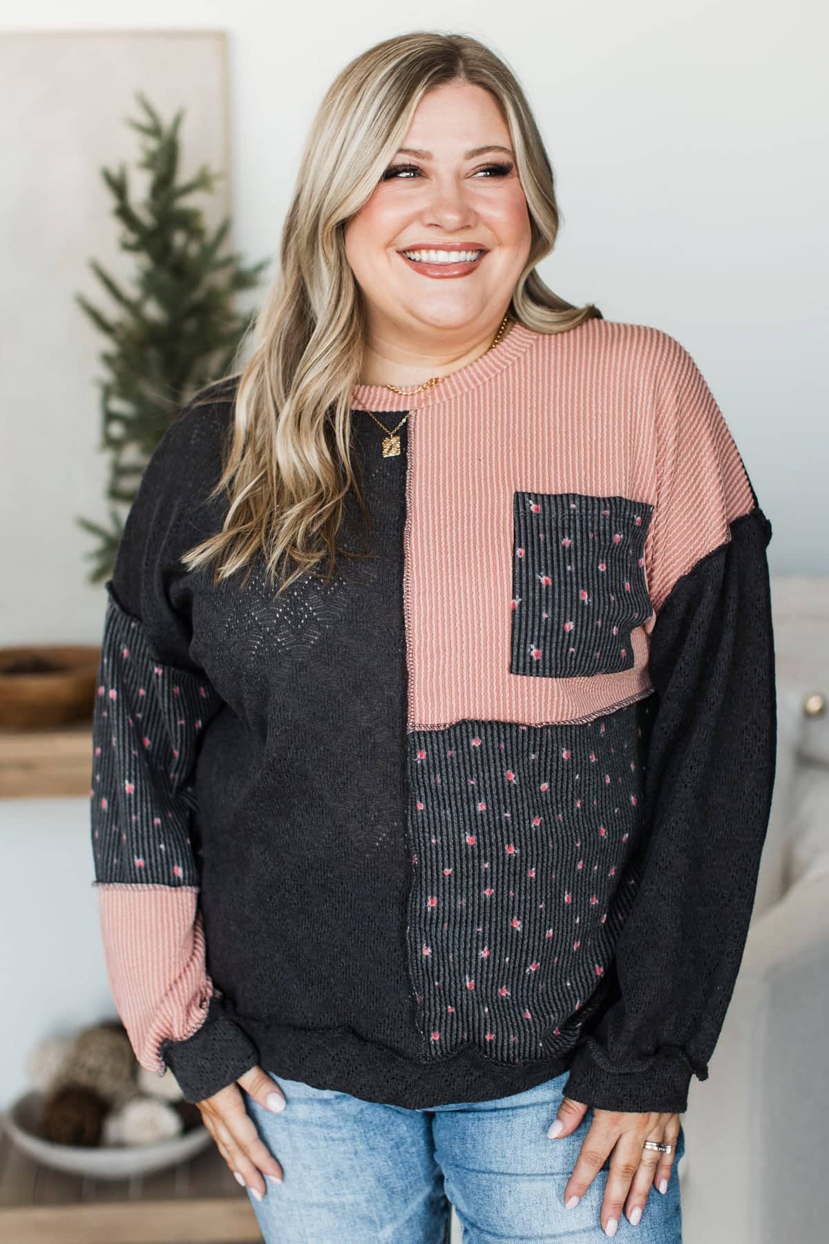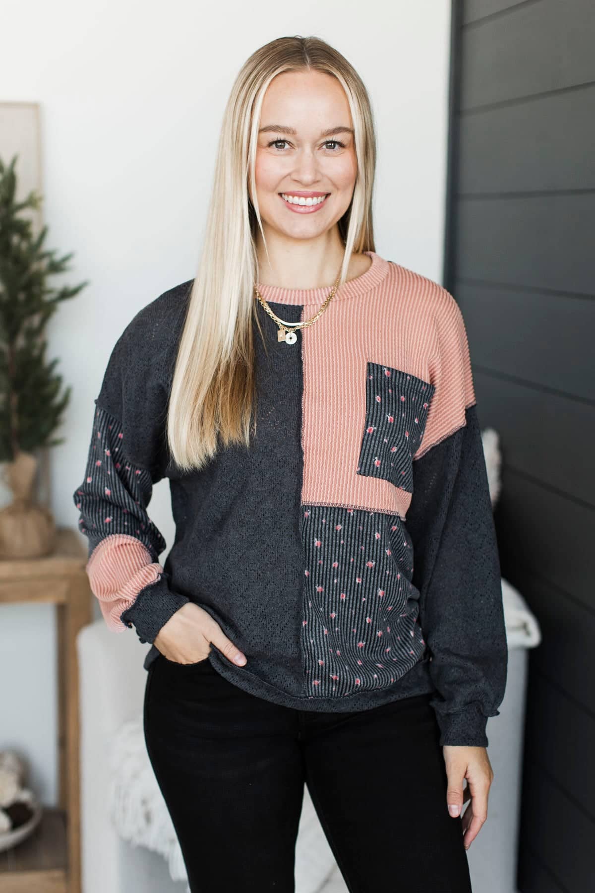 Greedy For Love Fabric Block Pullover Top- Charcoal