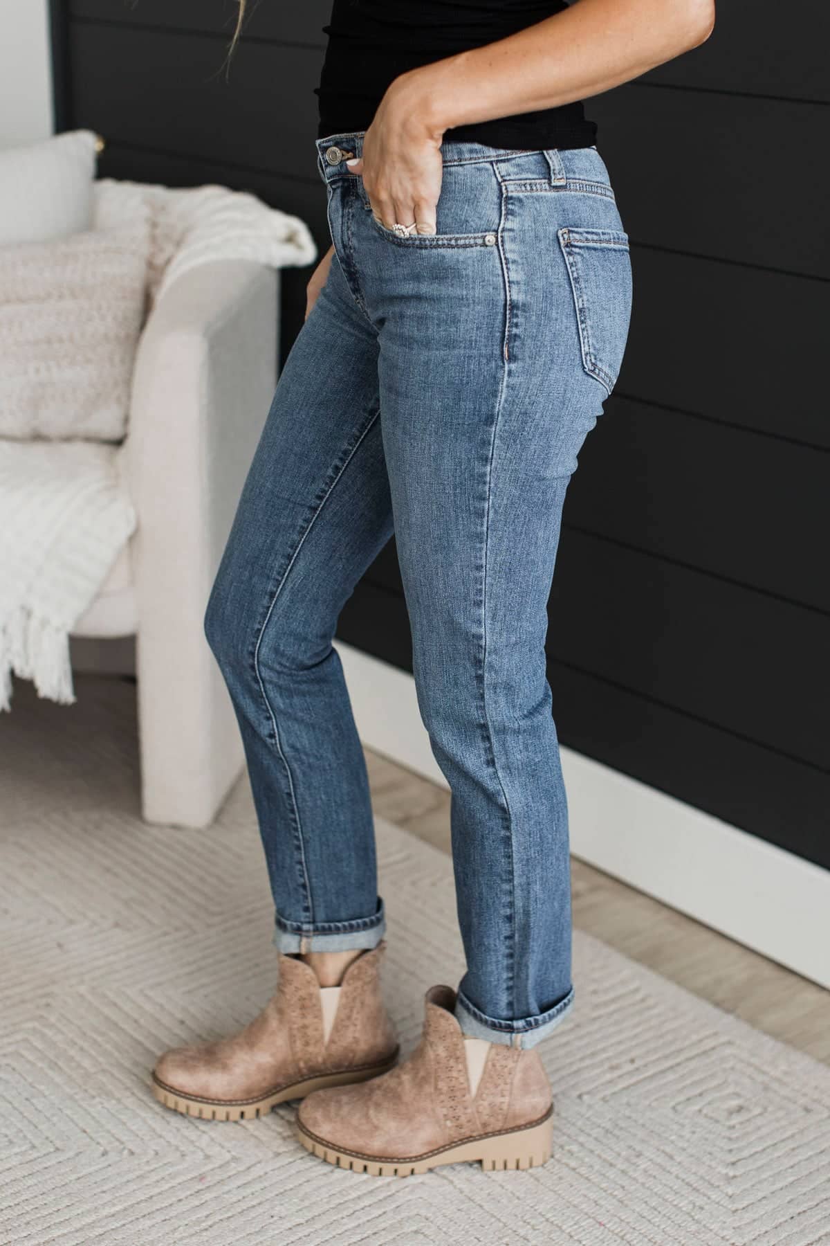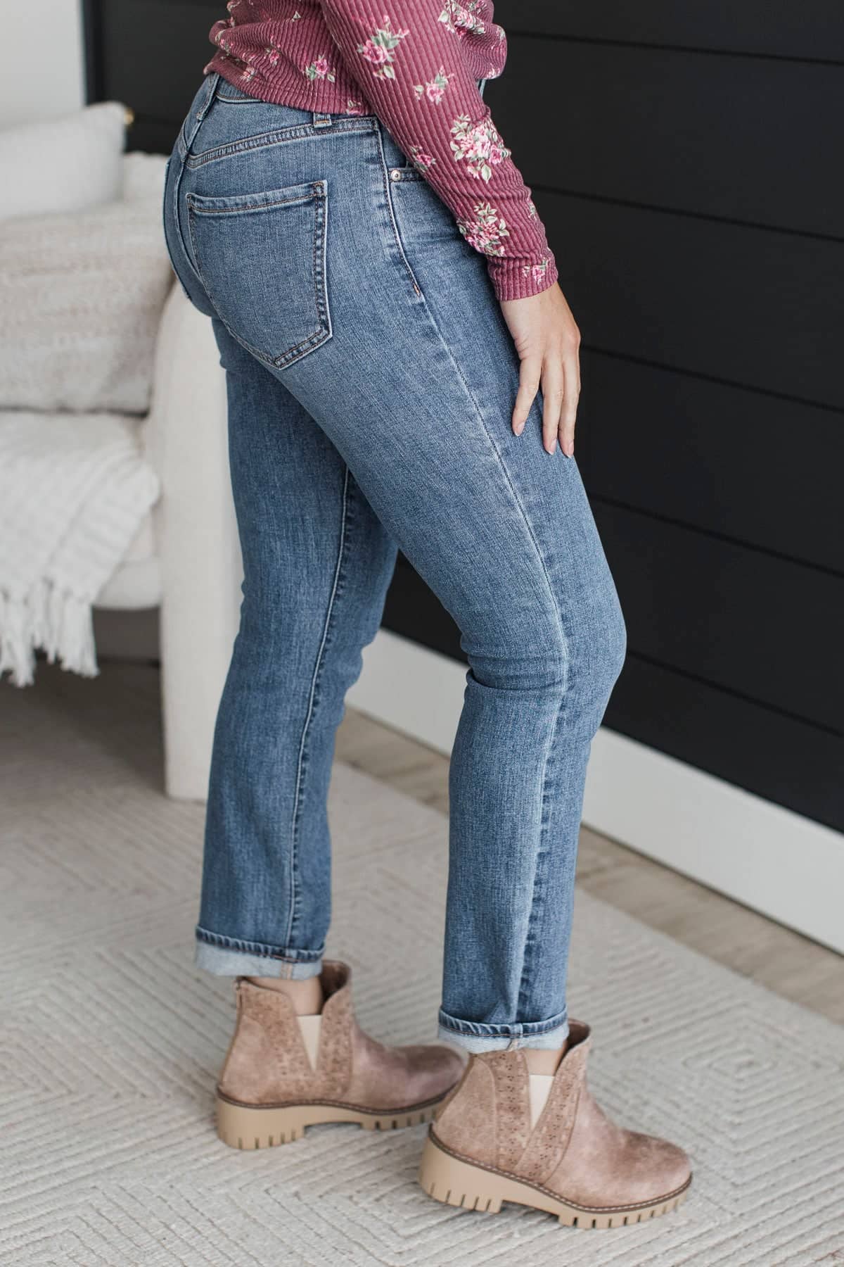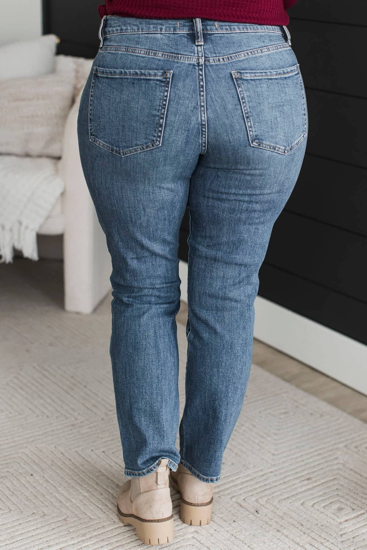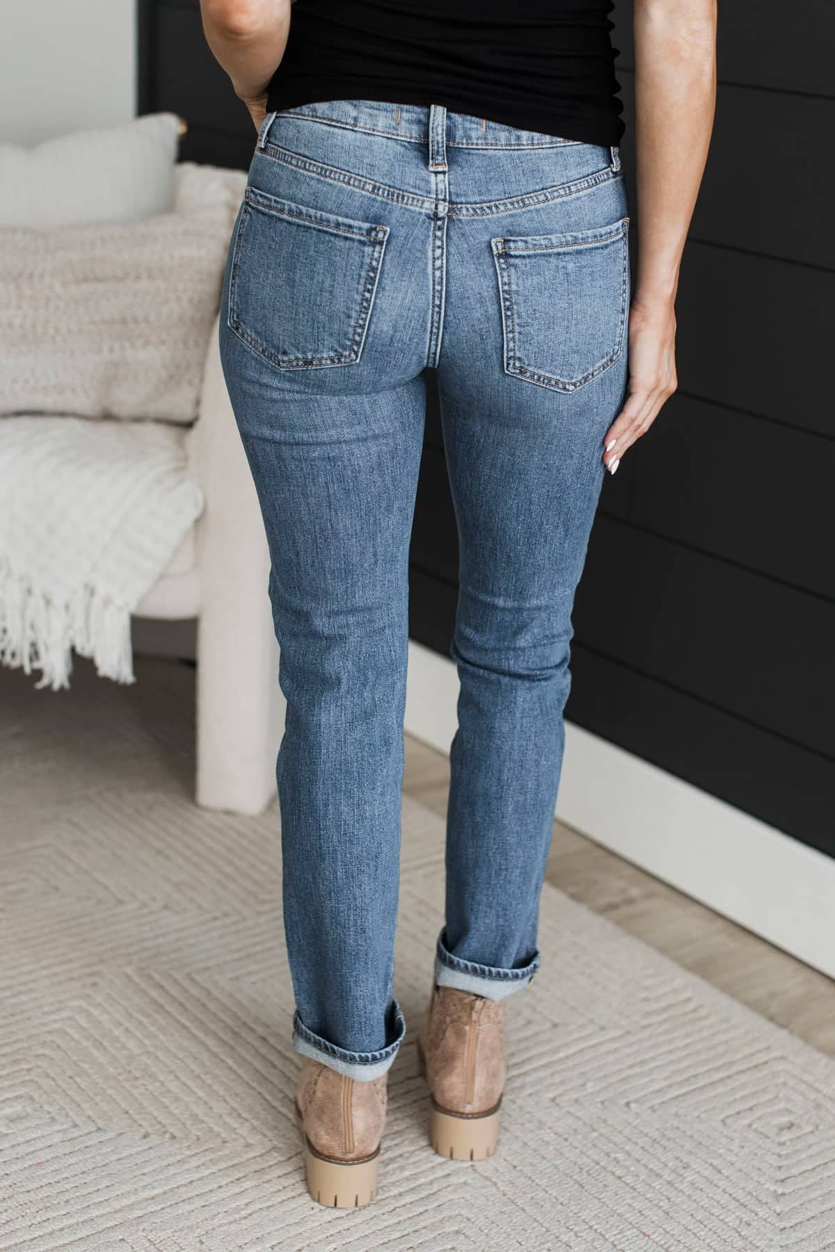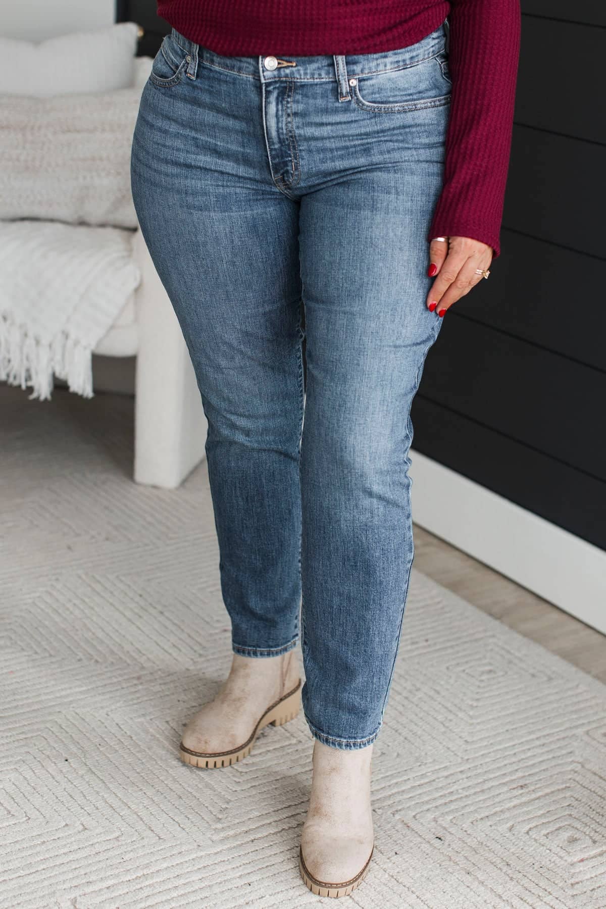 • Mid-rise straight leg jeans
