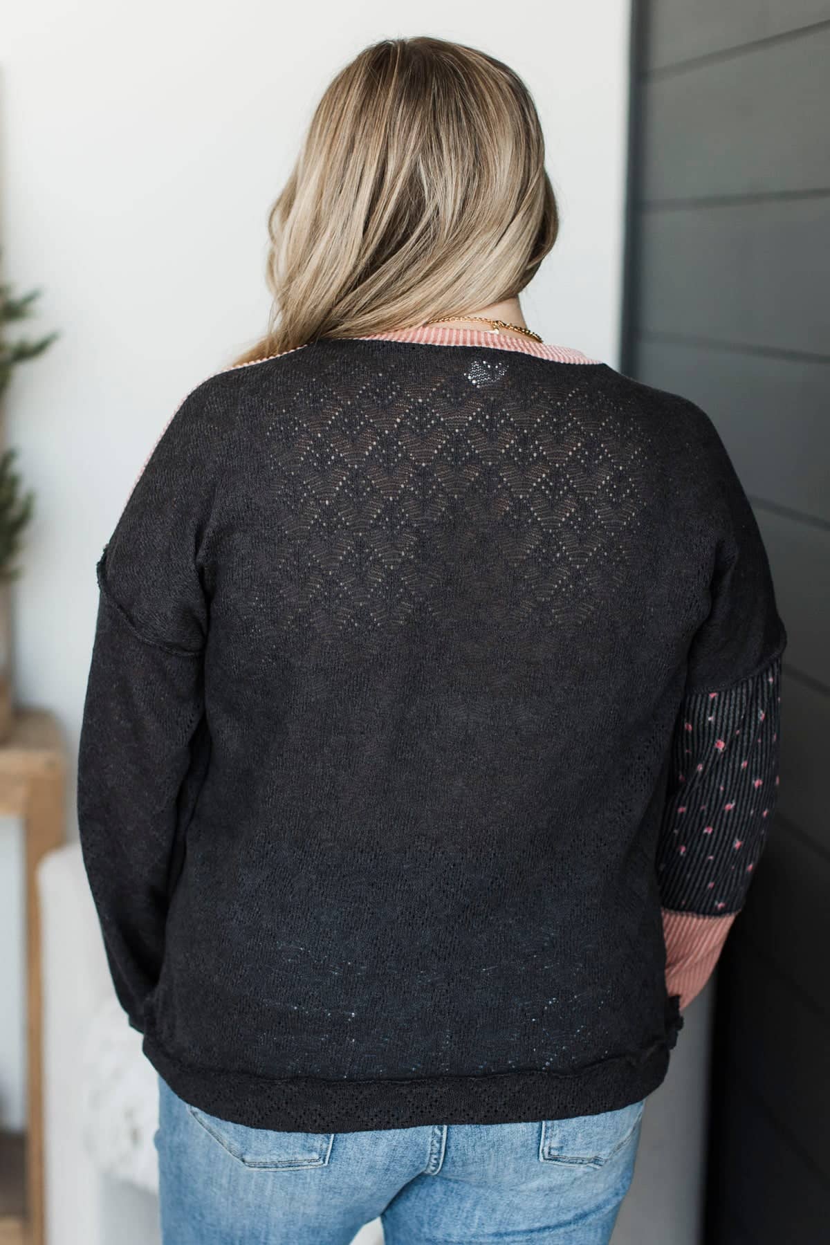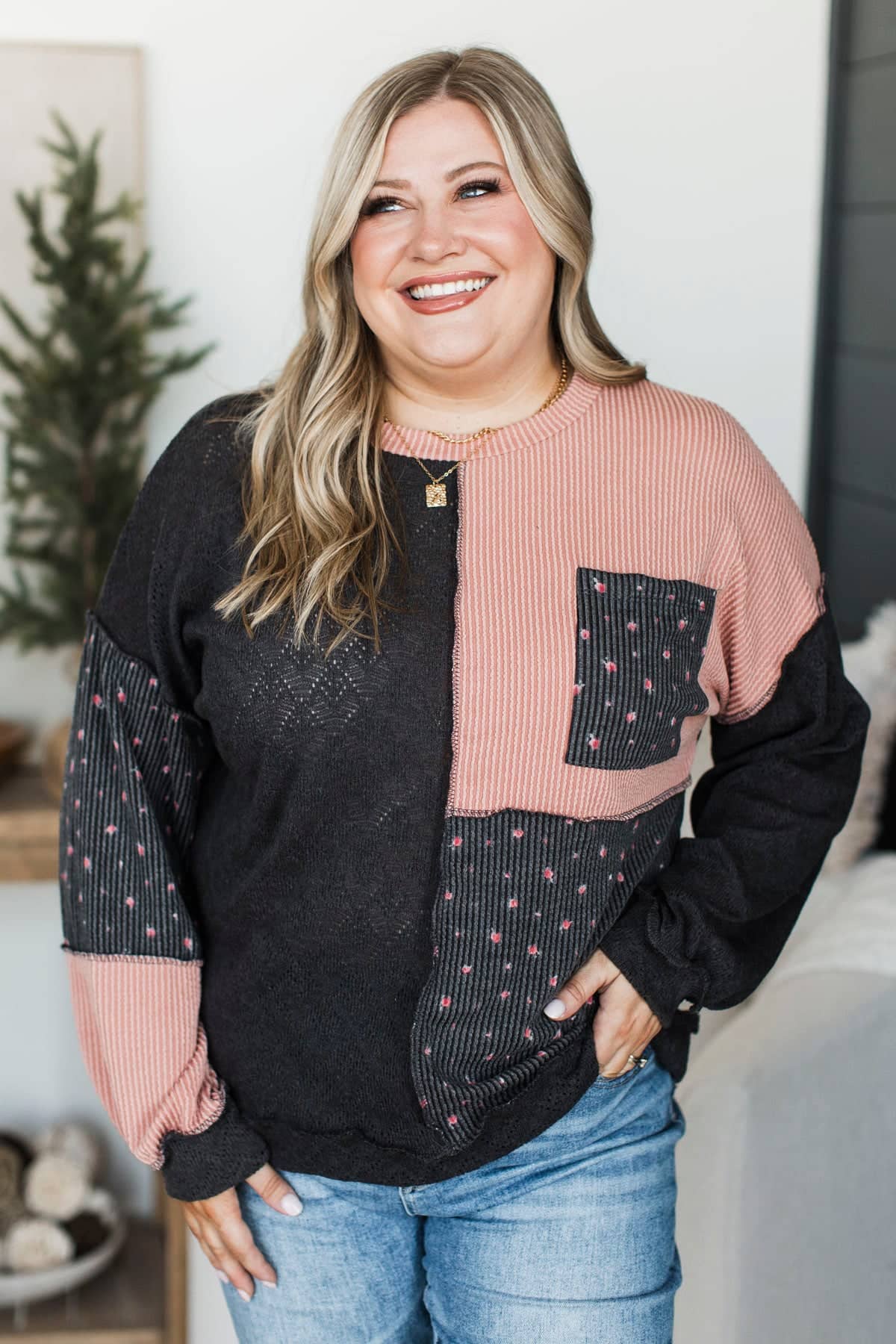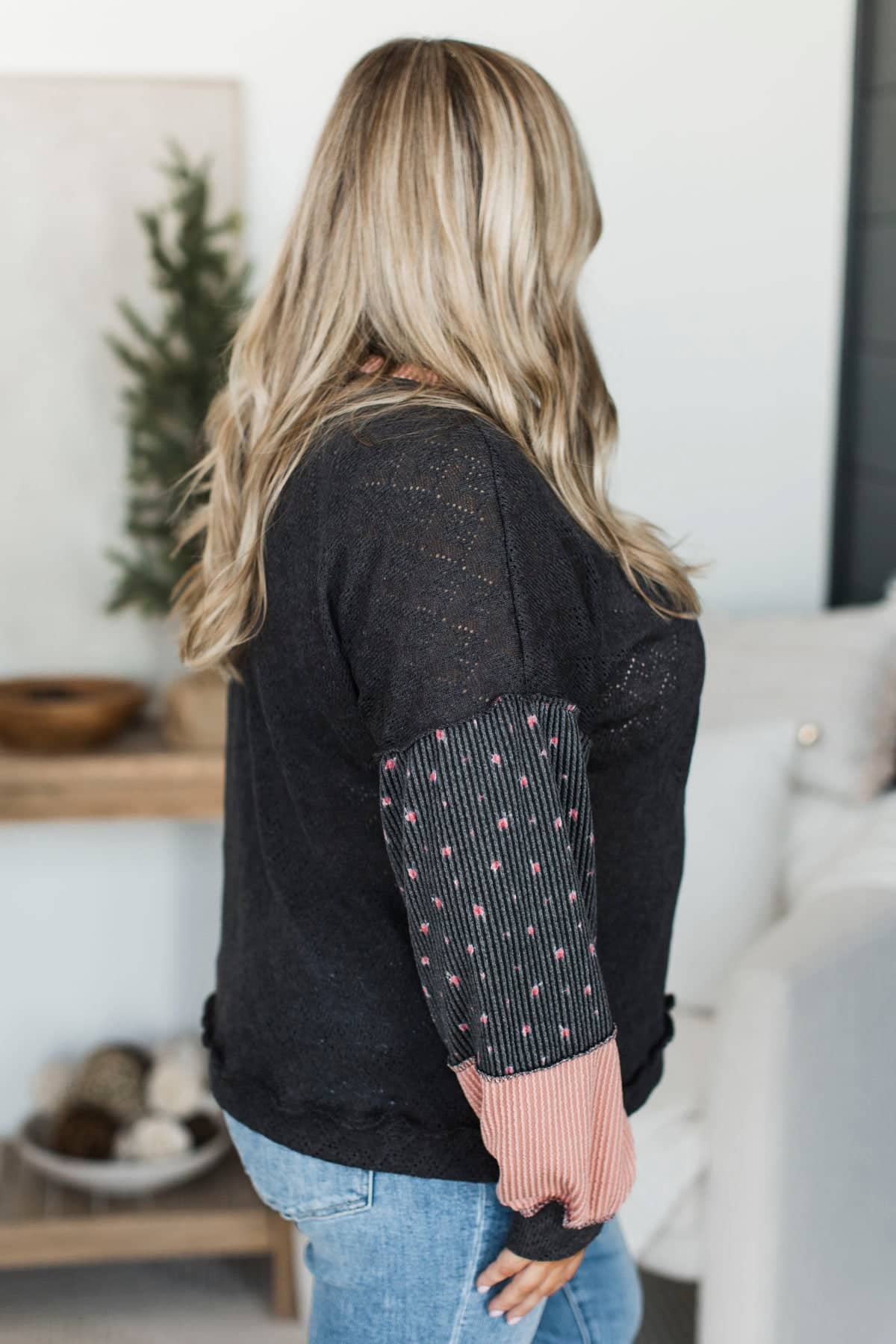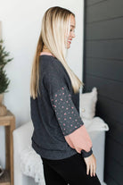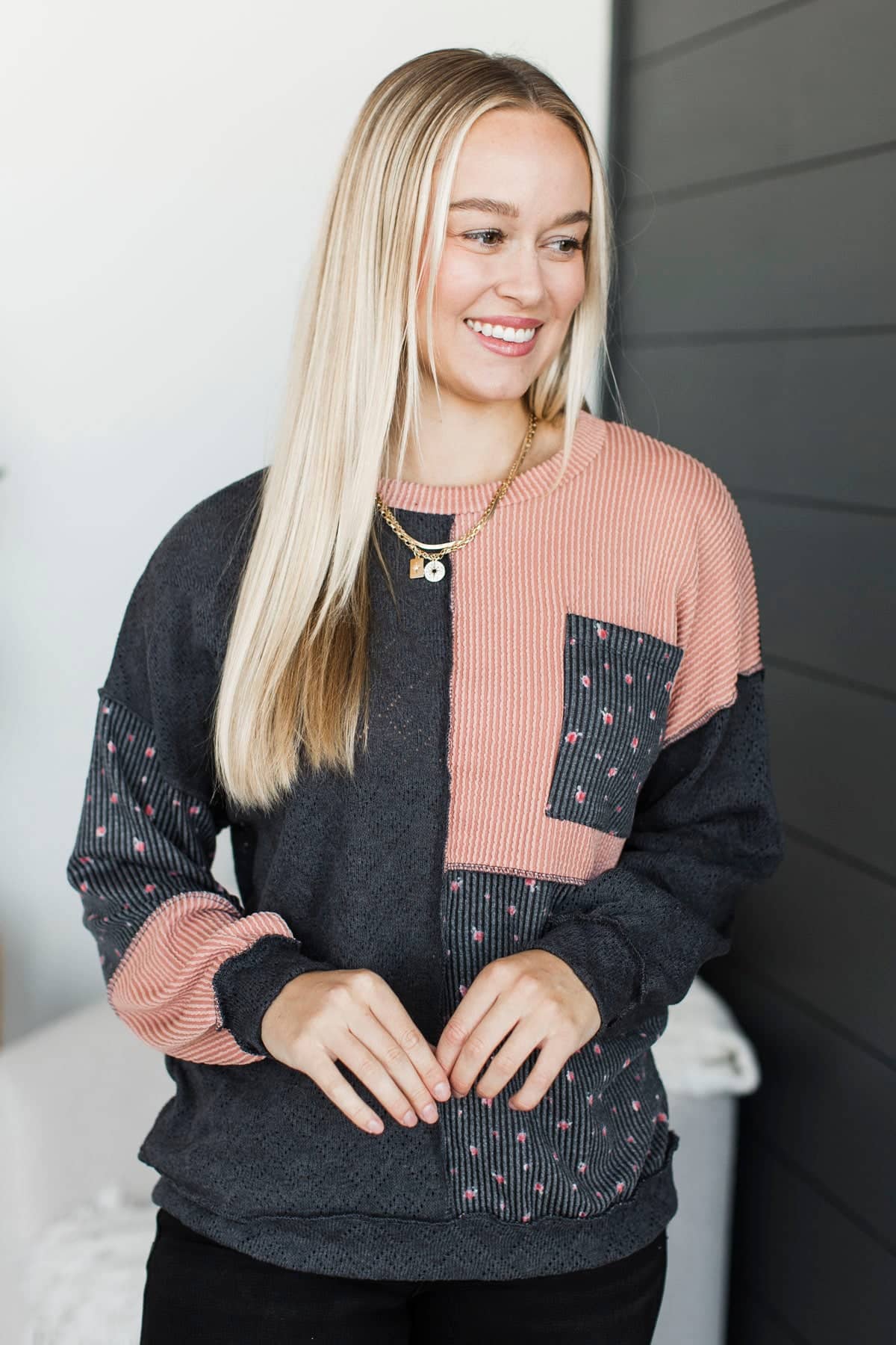 Greedy For Love Fabric Block Pullover Top- Charcoal