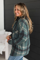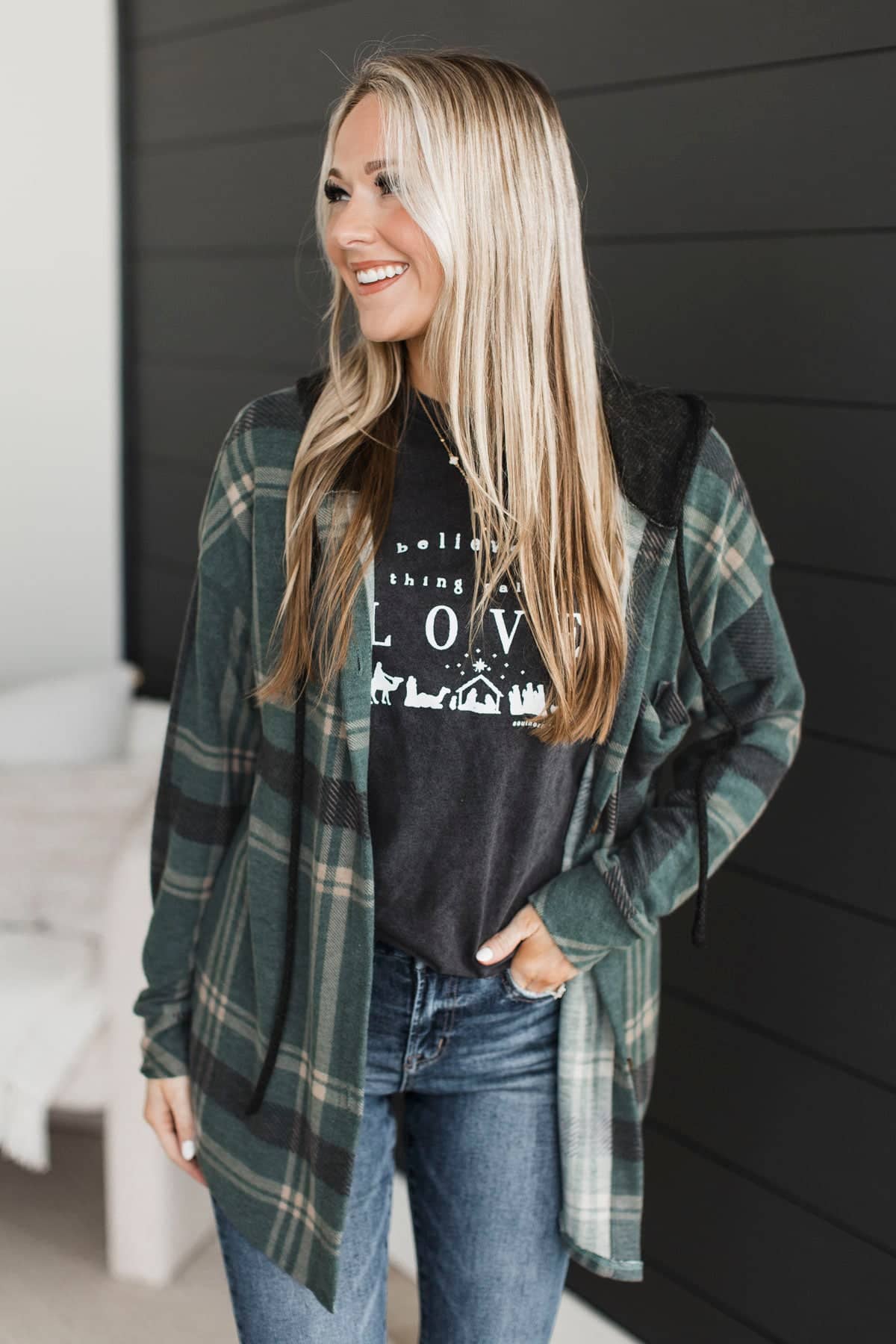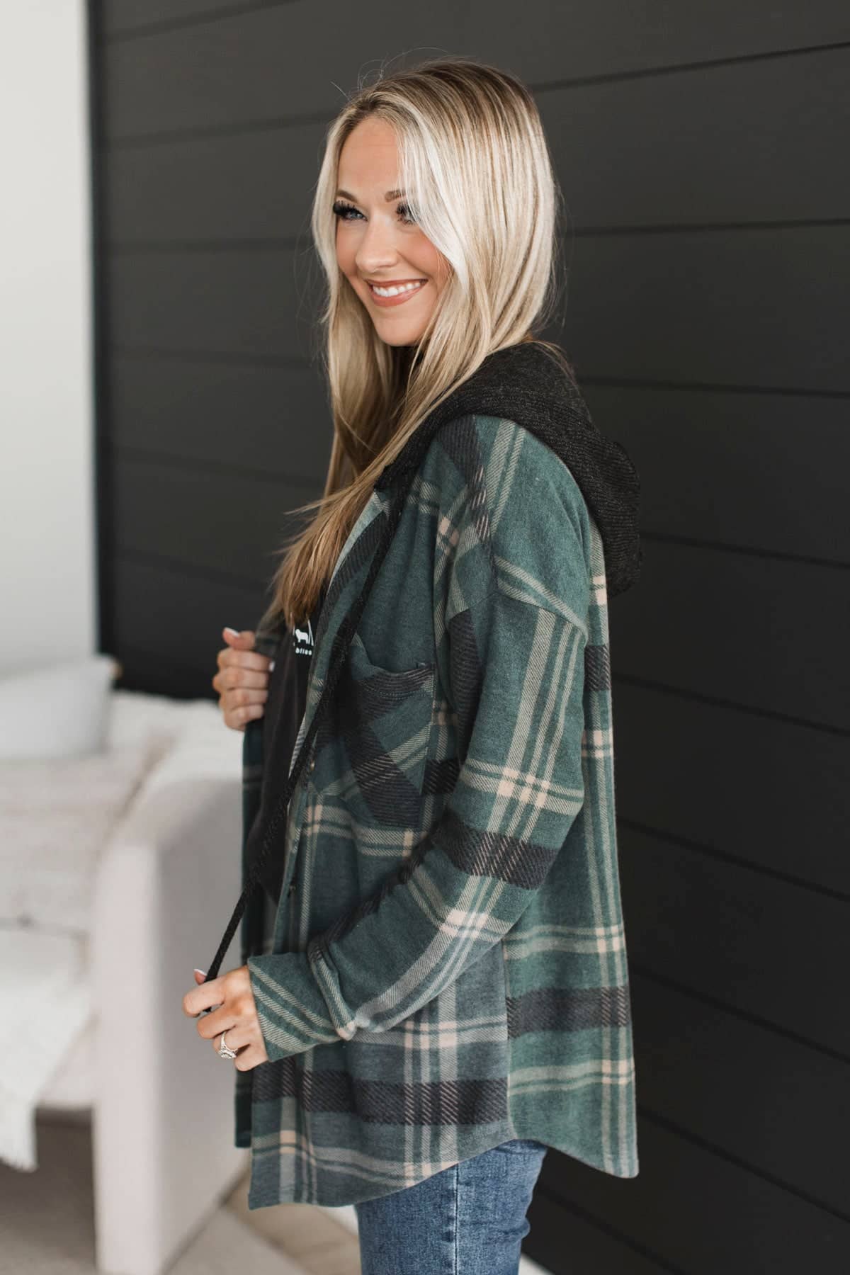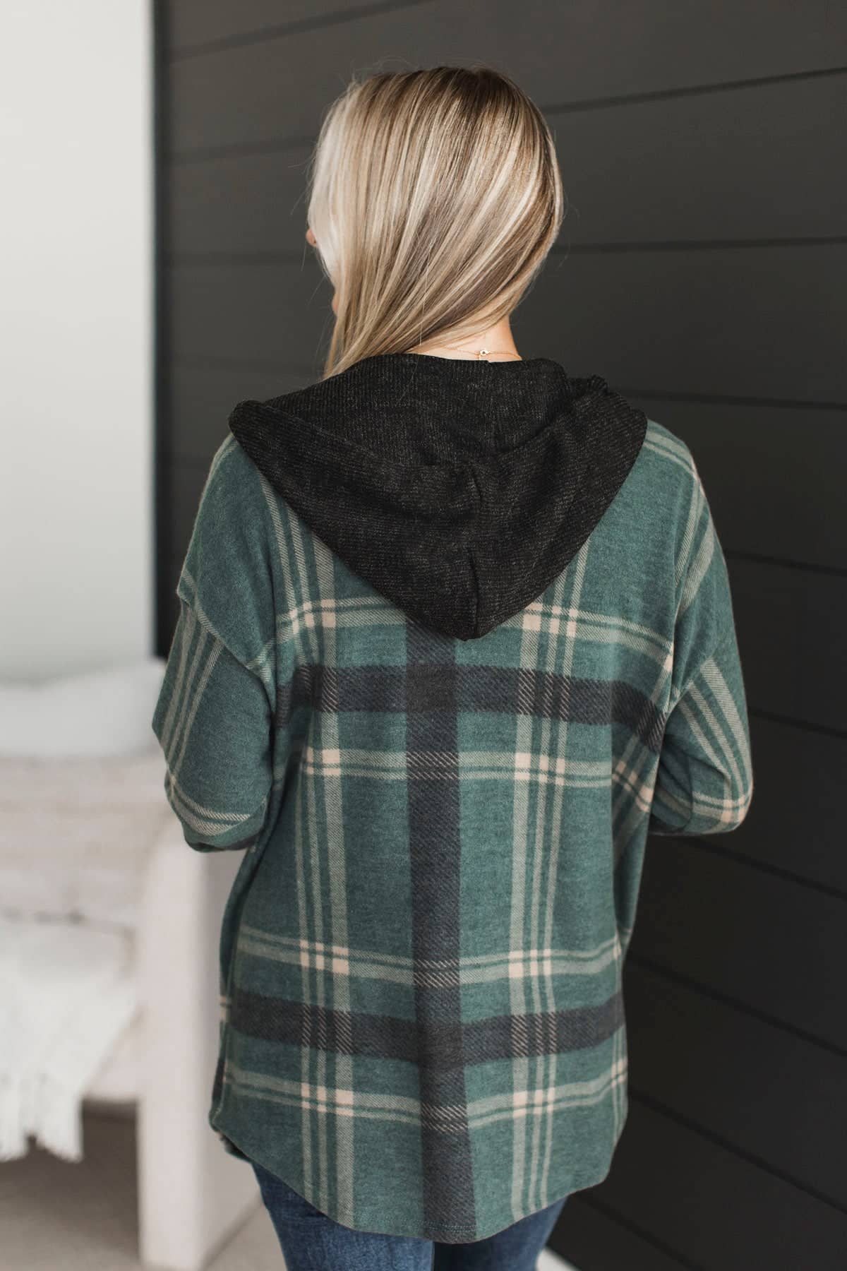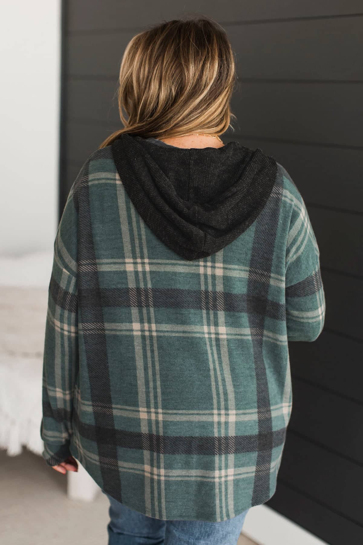 Hopeful Smiles Hooded Plaid Button Top- Dusty Jade & Black