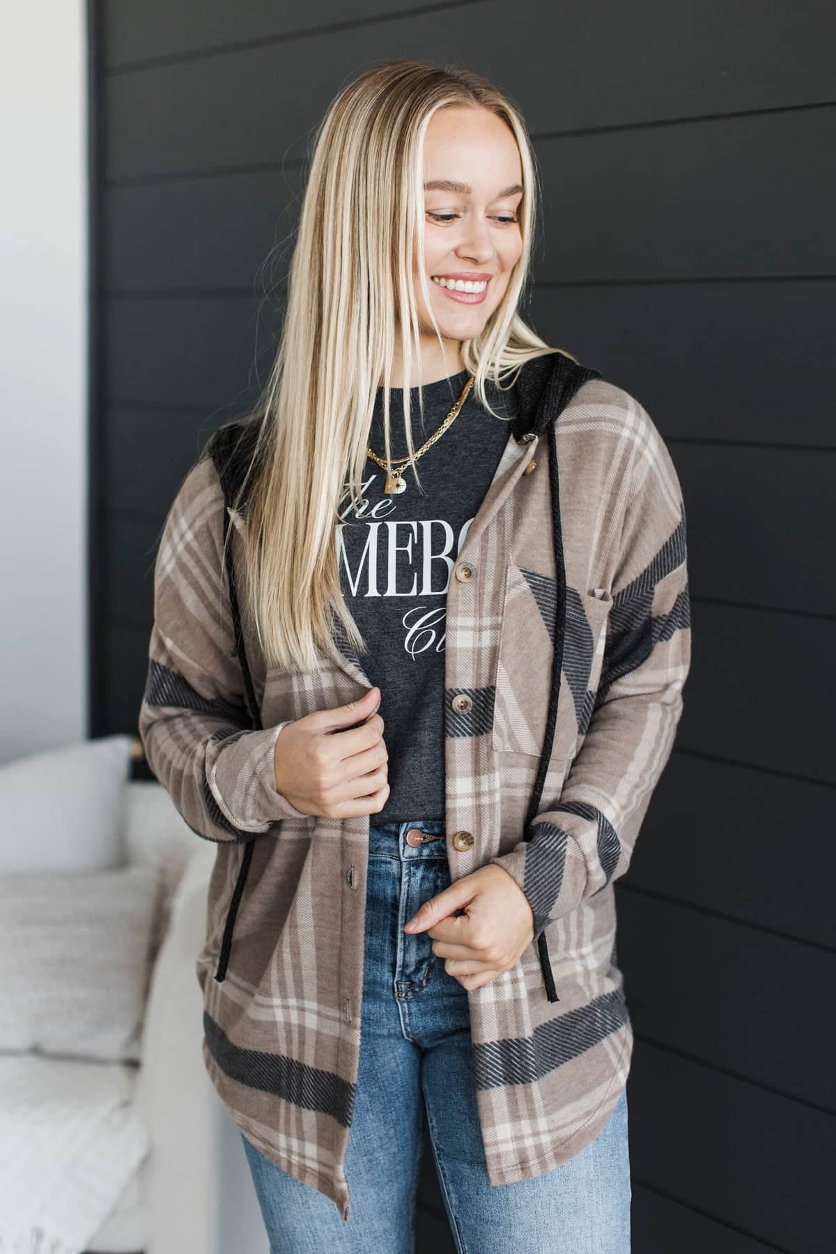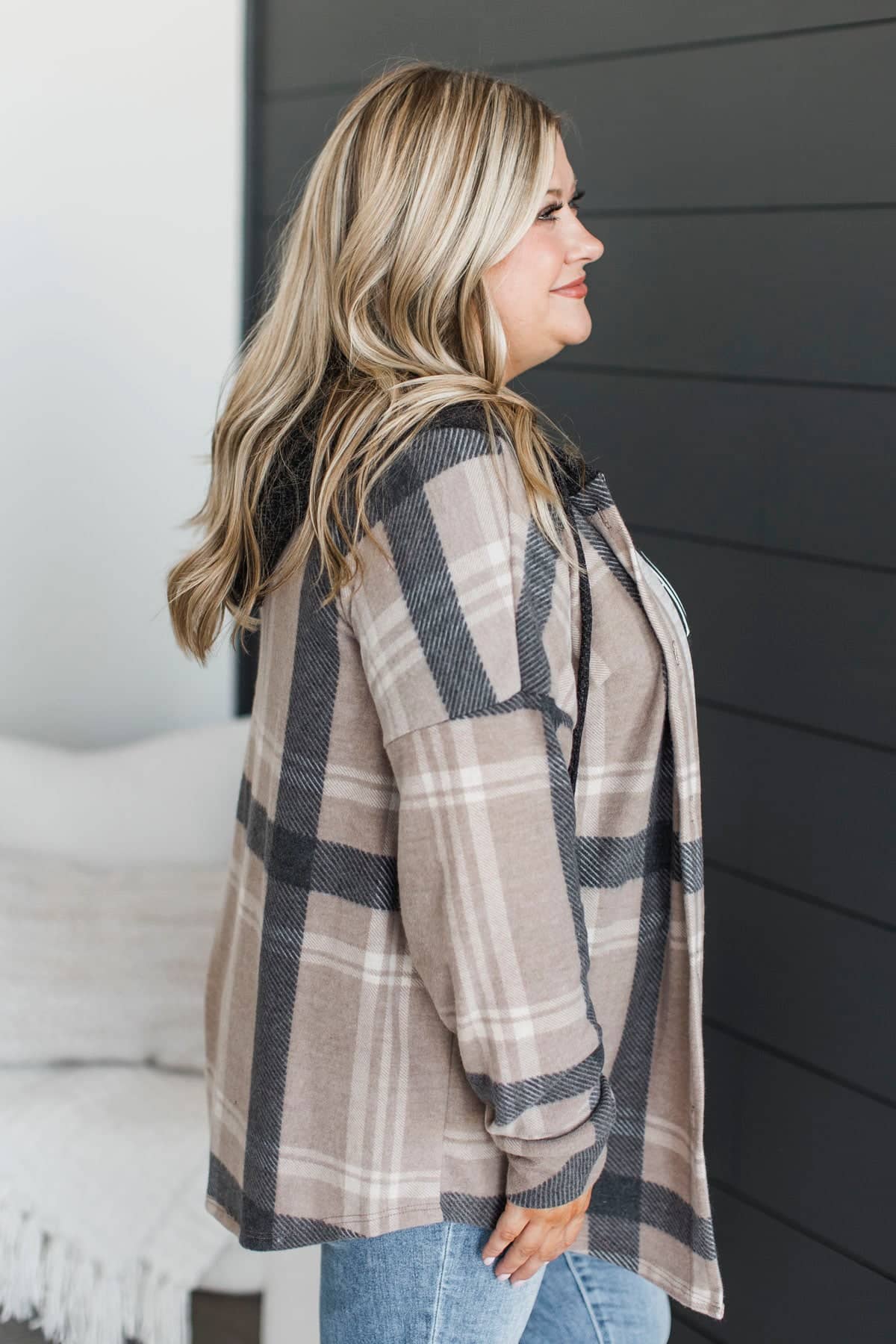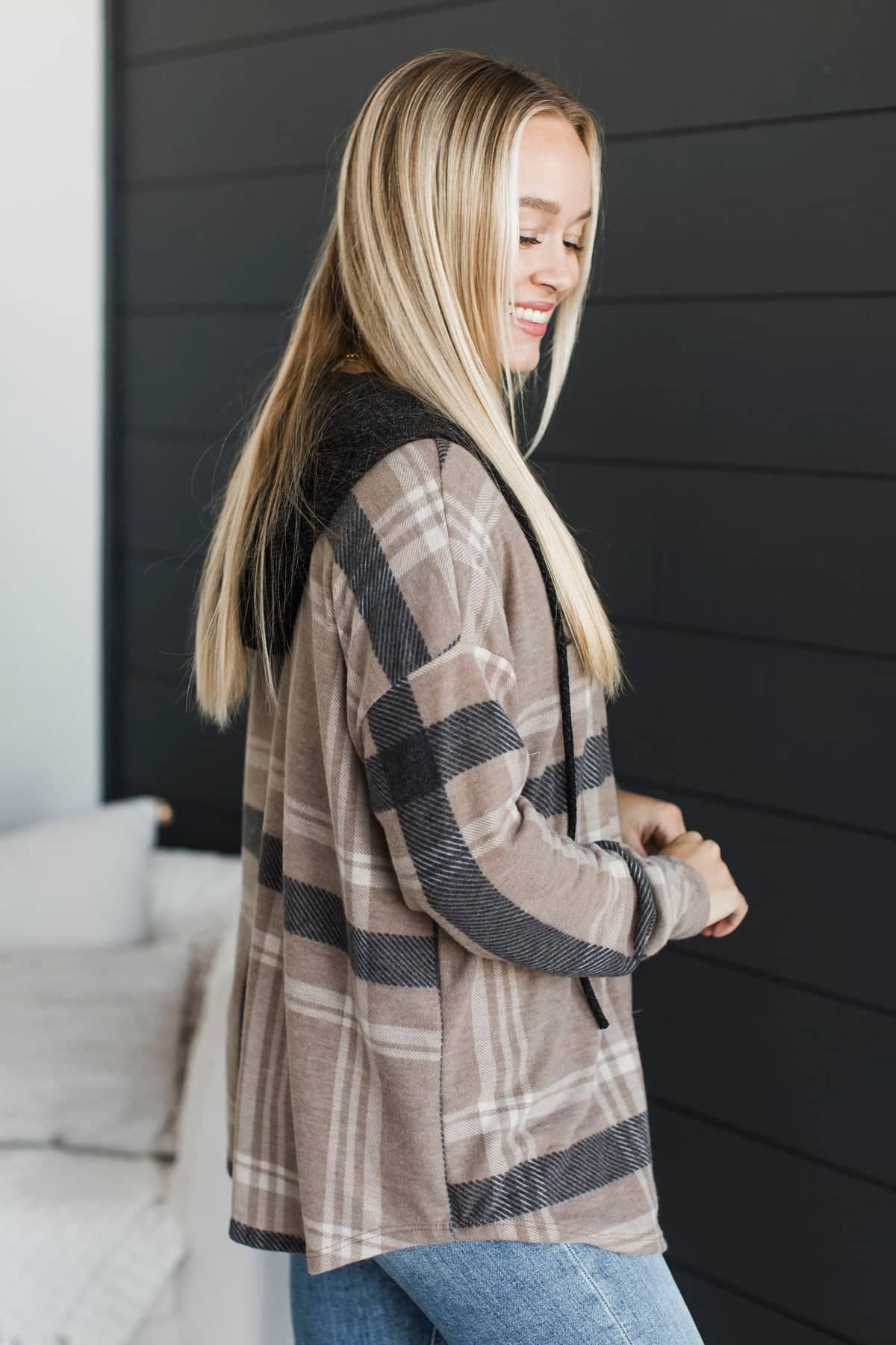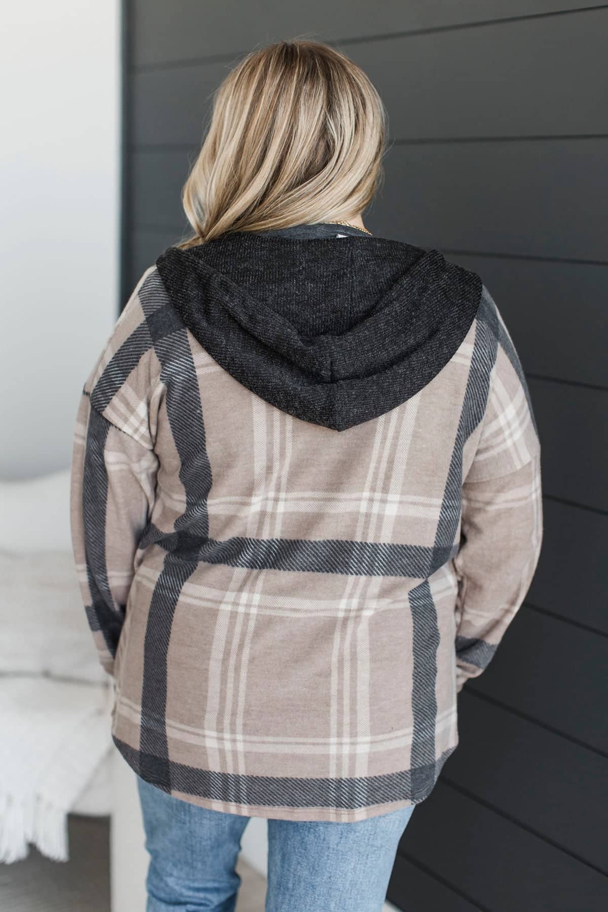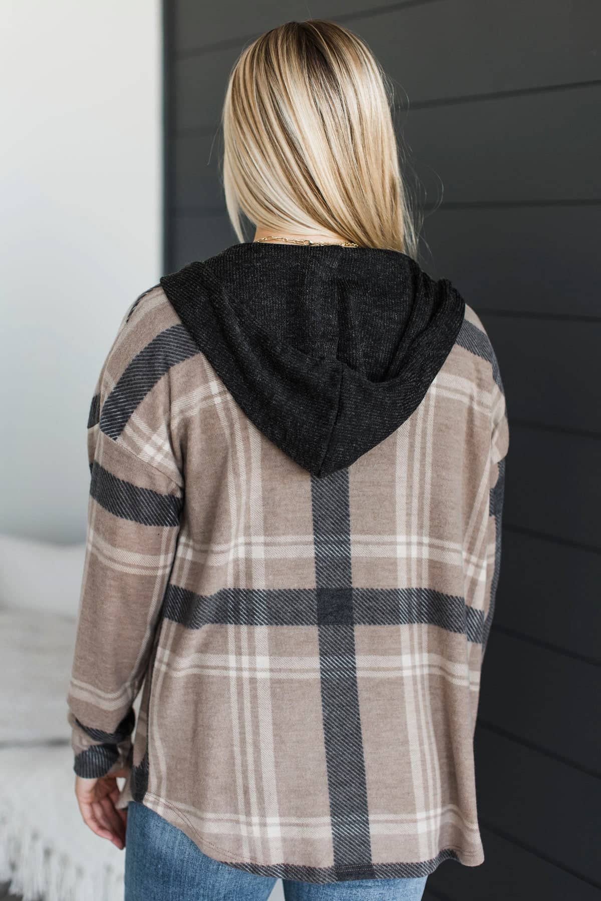 Hopeful Smiles Hooded Plaid Button Top- Mocha & Black