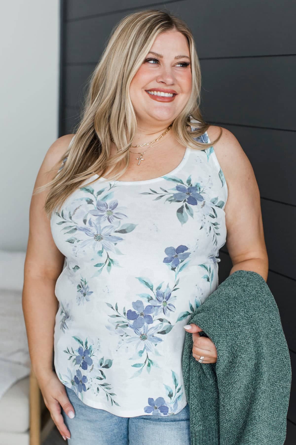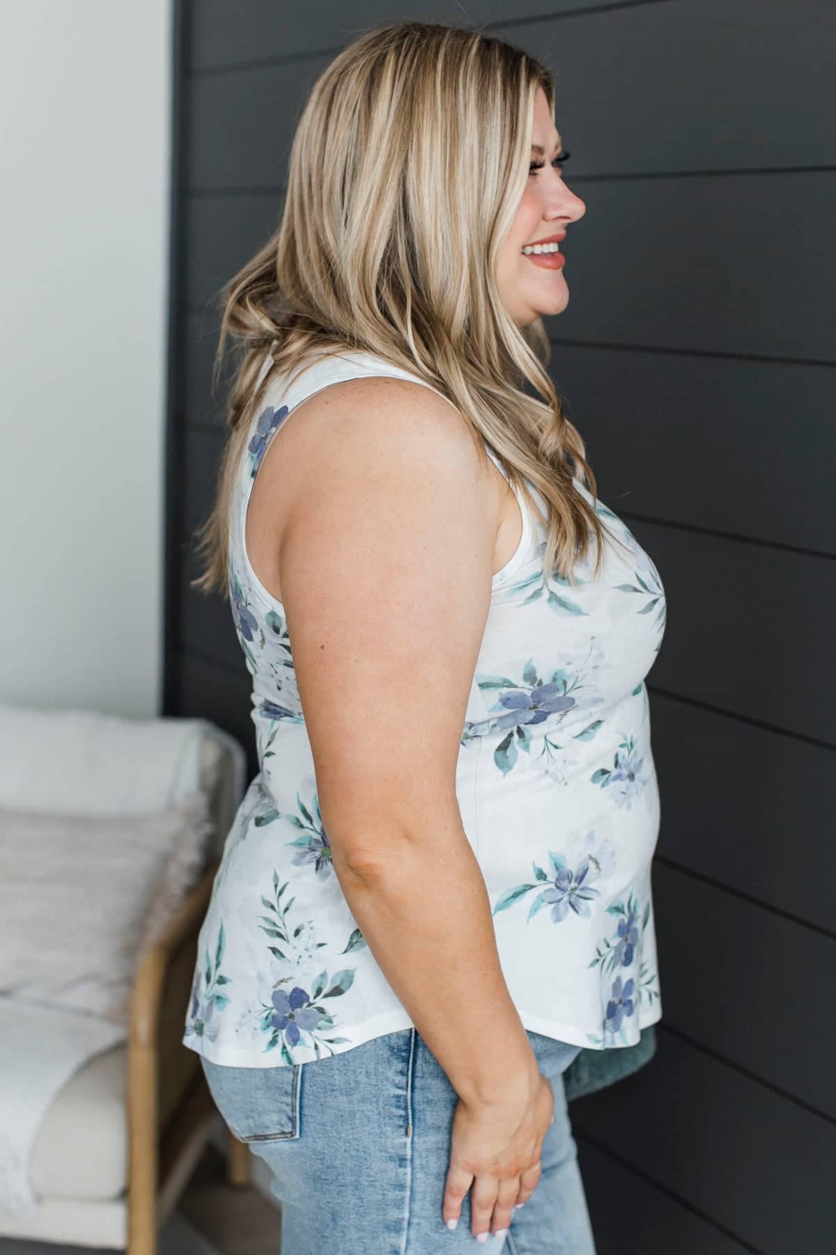 Isn't It Grand Floral Tank Top- Ivory & Indigo Blue