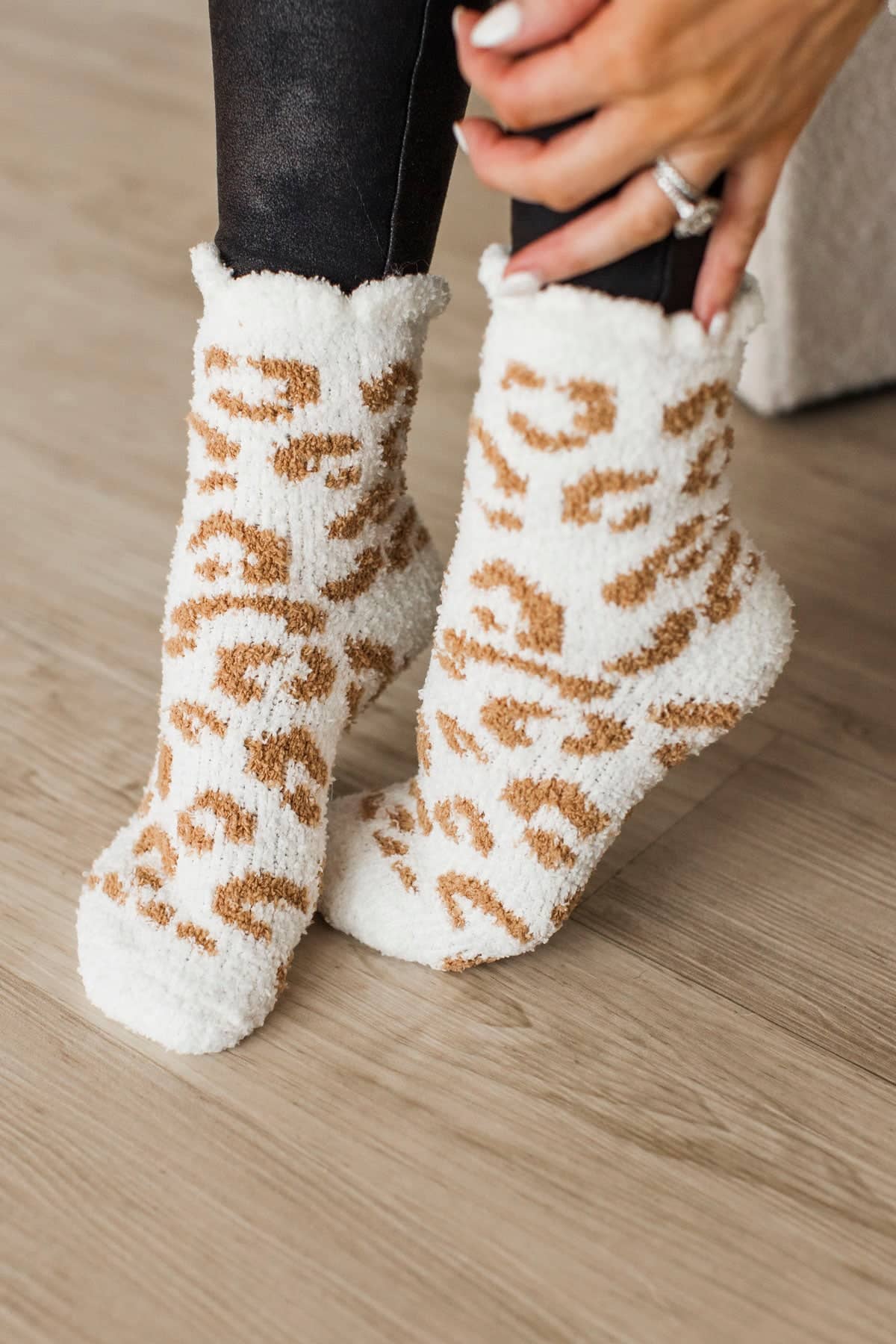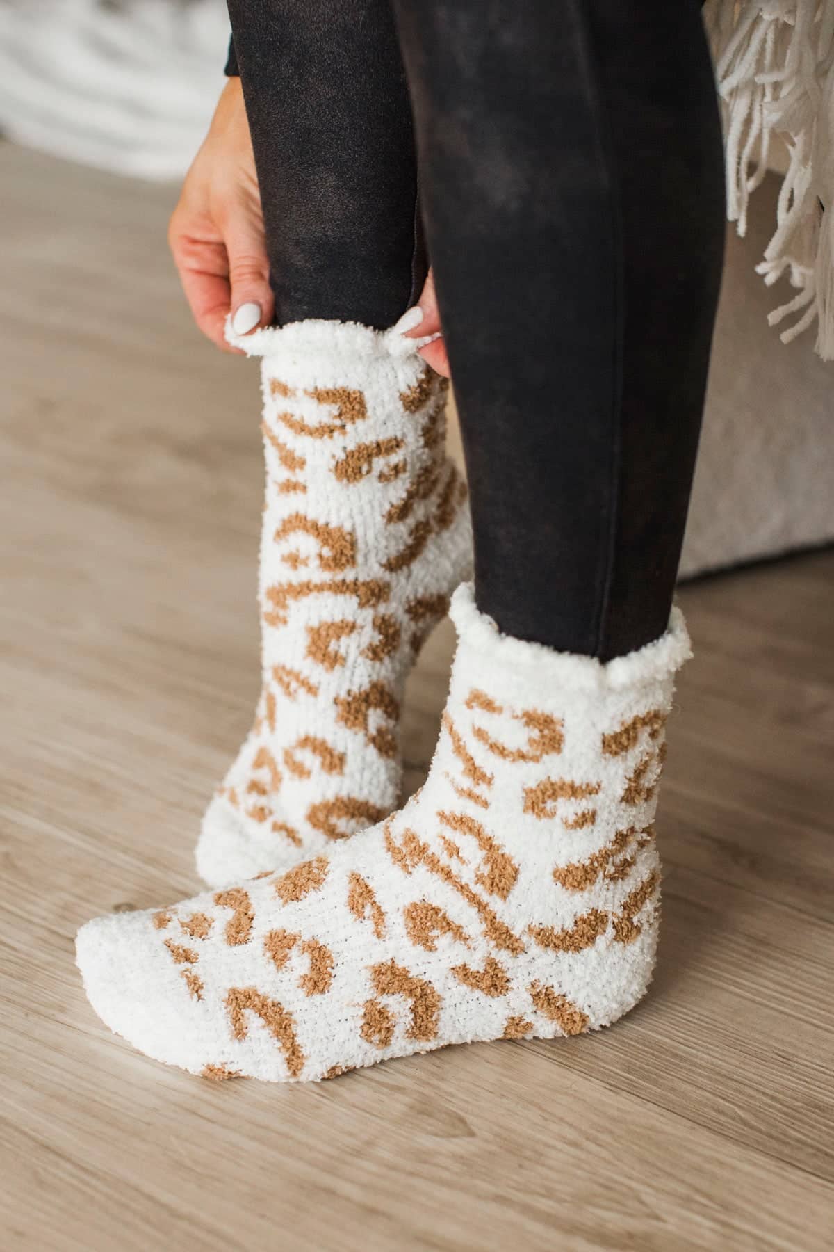 Majorly Cozy Fuzzy Knit Socks- Ivory Leopard