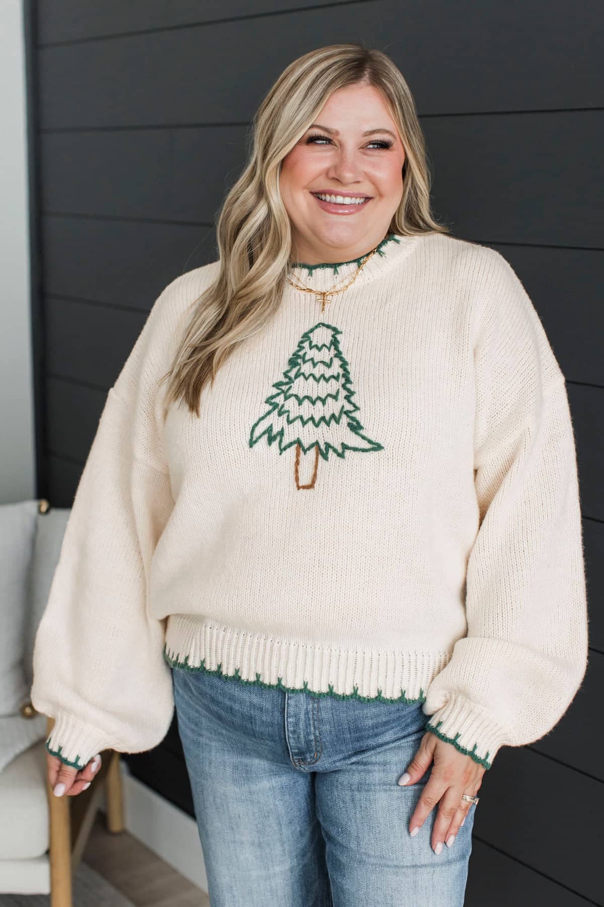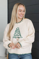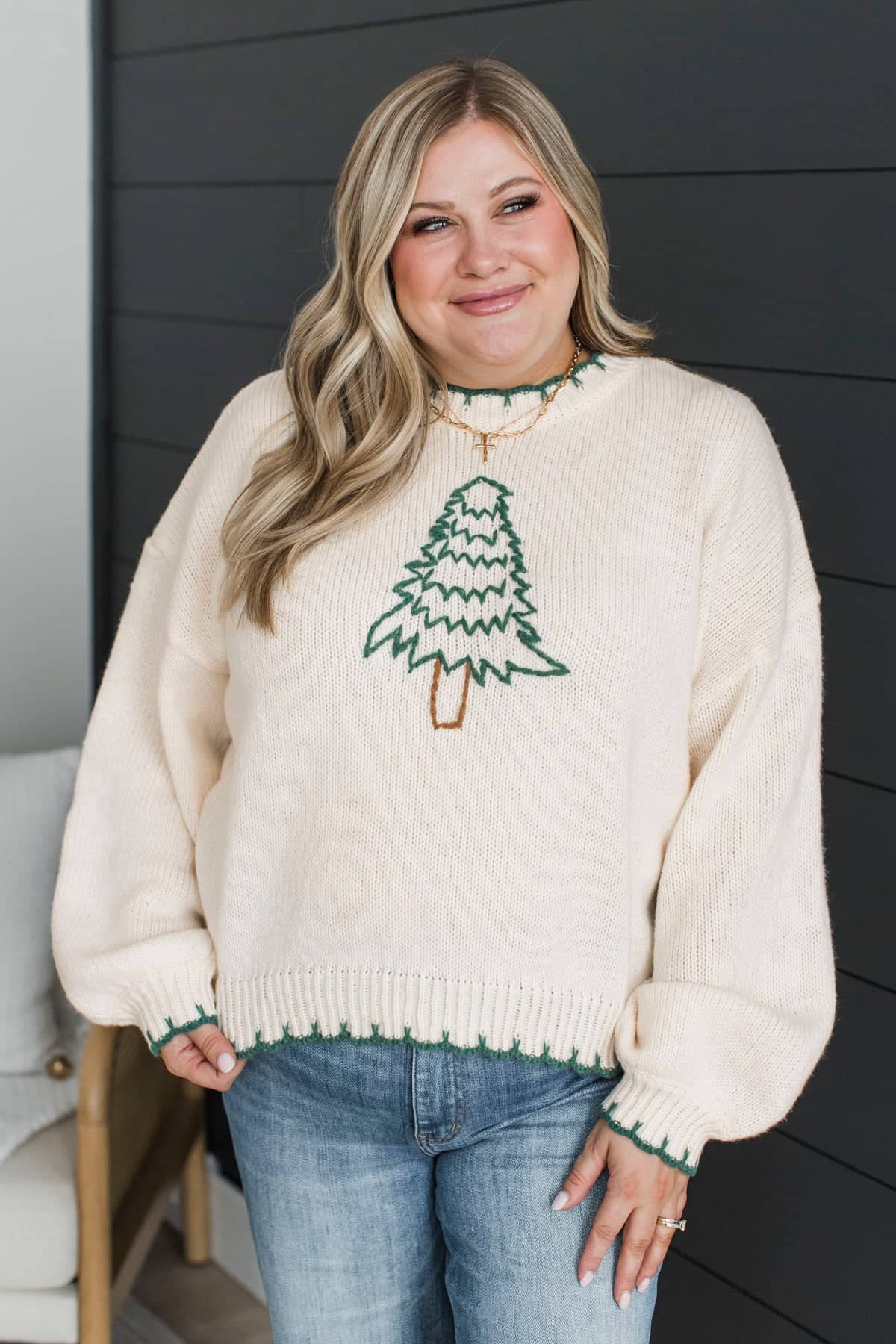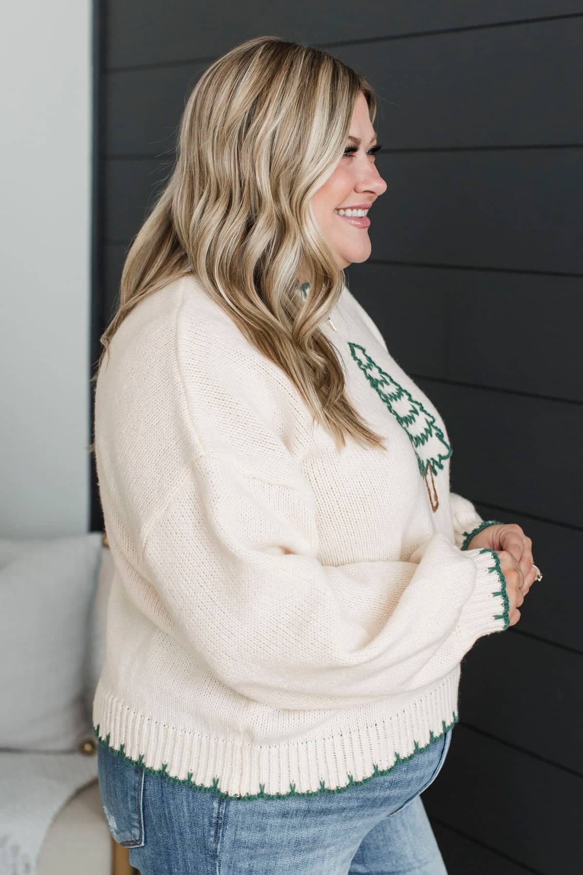 Settle Into Winter Embroidered Tree Knit Sweater- Ivory