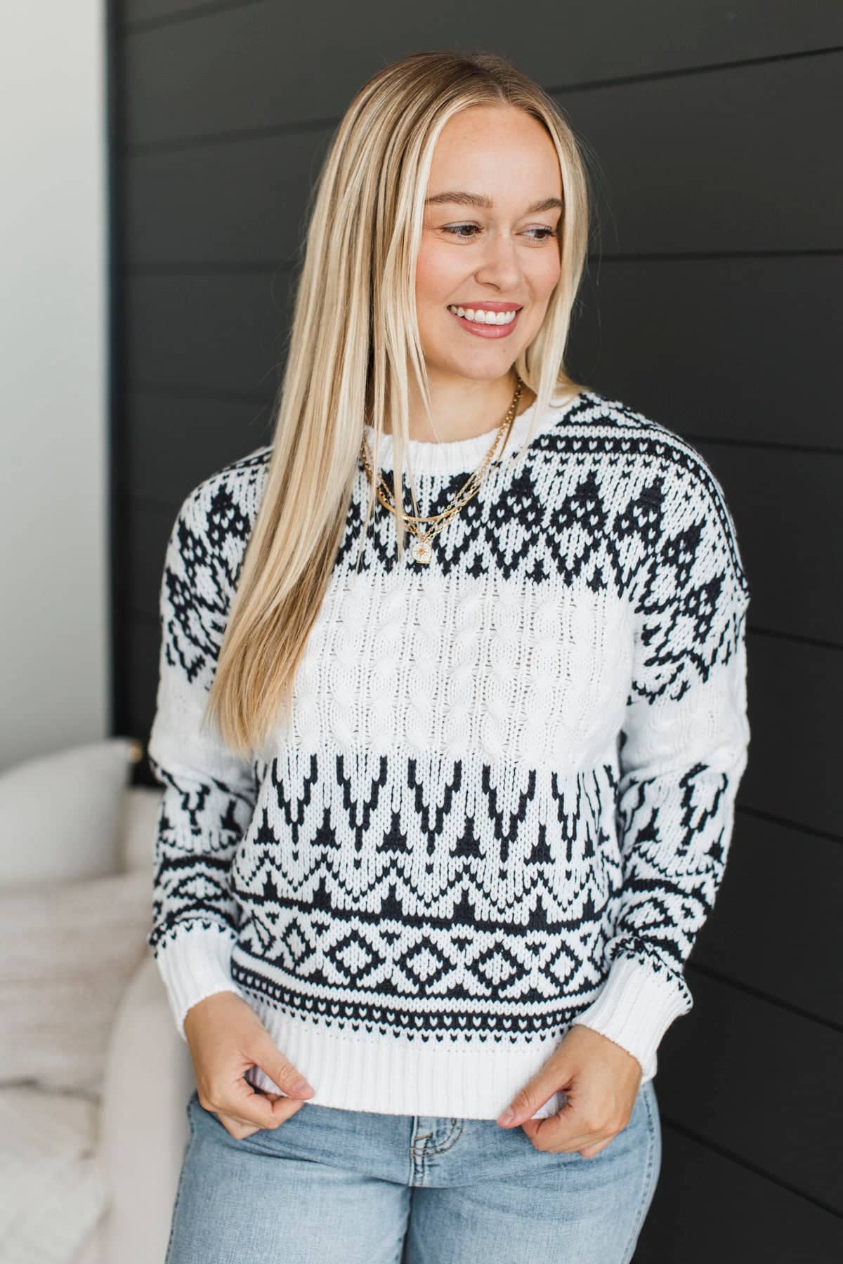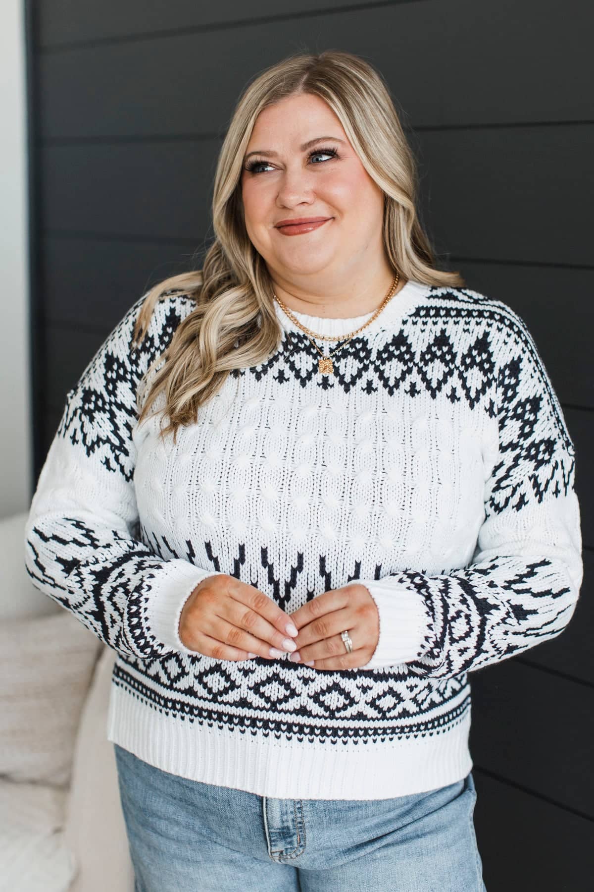 Holiday Festivities Fair Isle Knit Sweater- White & Dark Navy