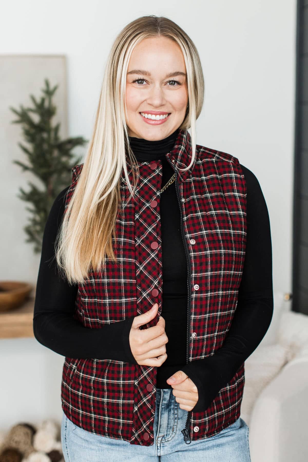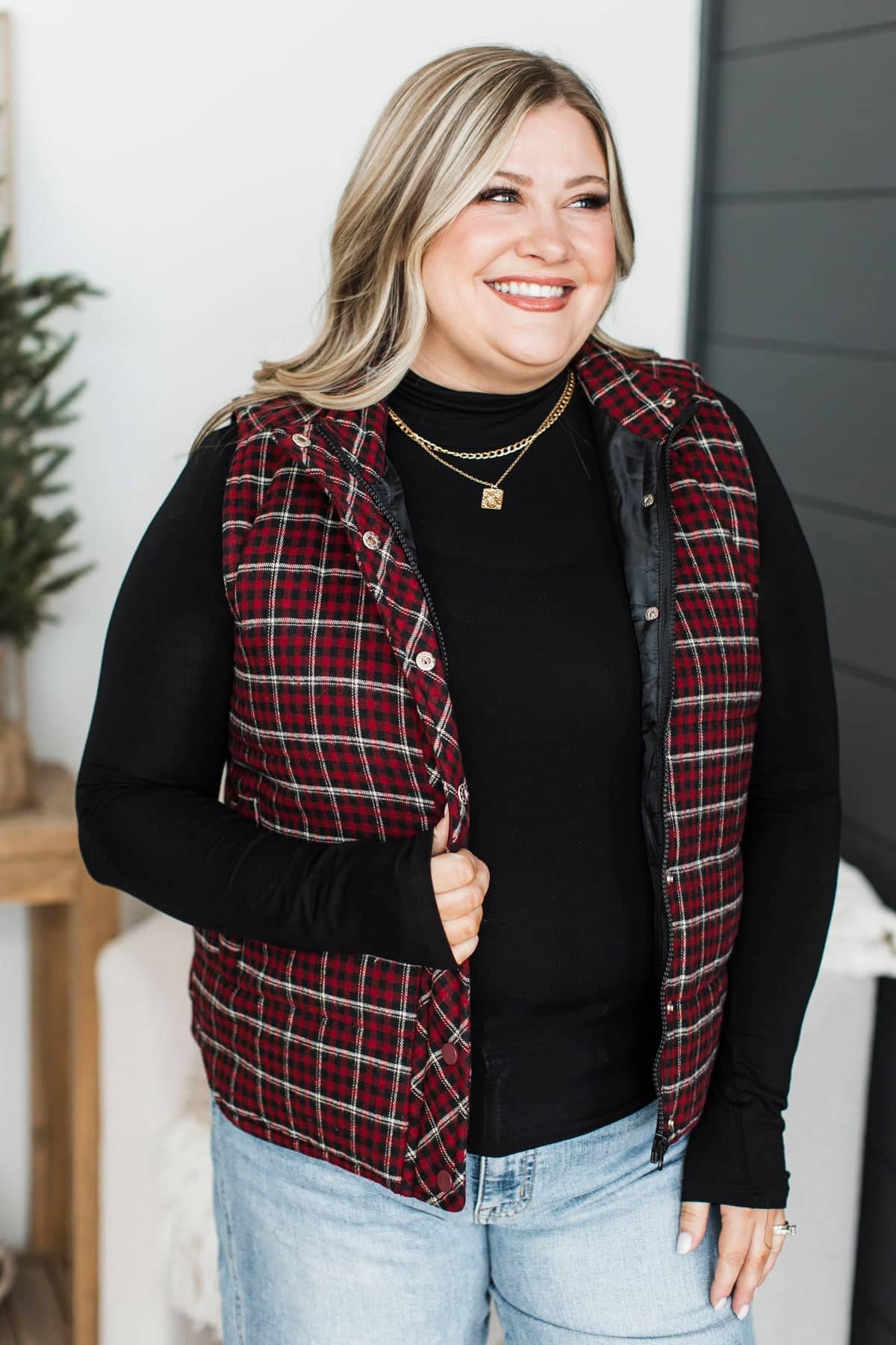 Enjoy The Views Plaid Puffer Vest- Red & Black