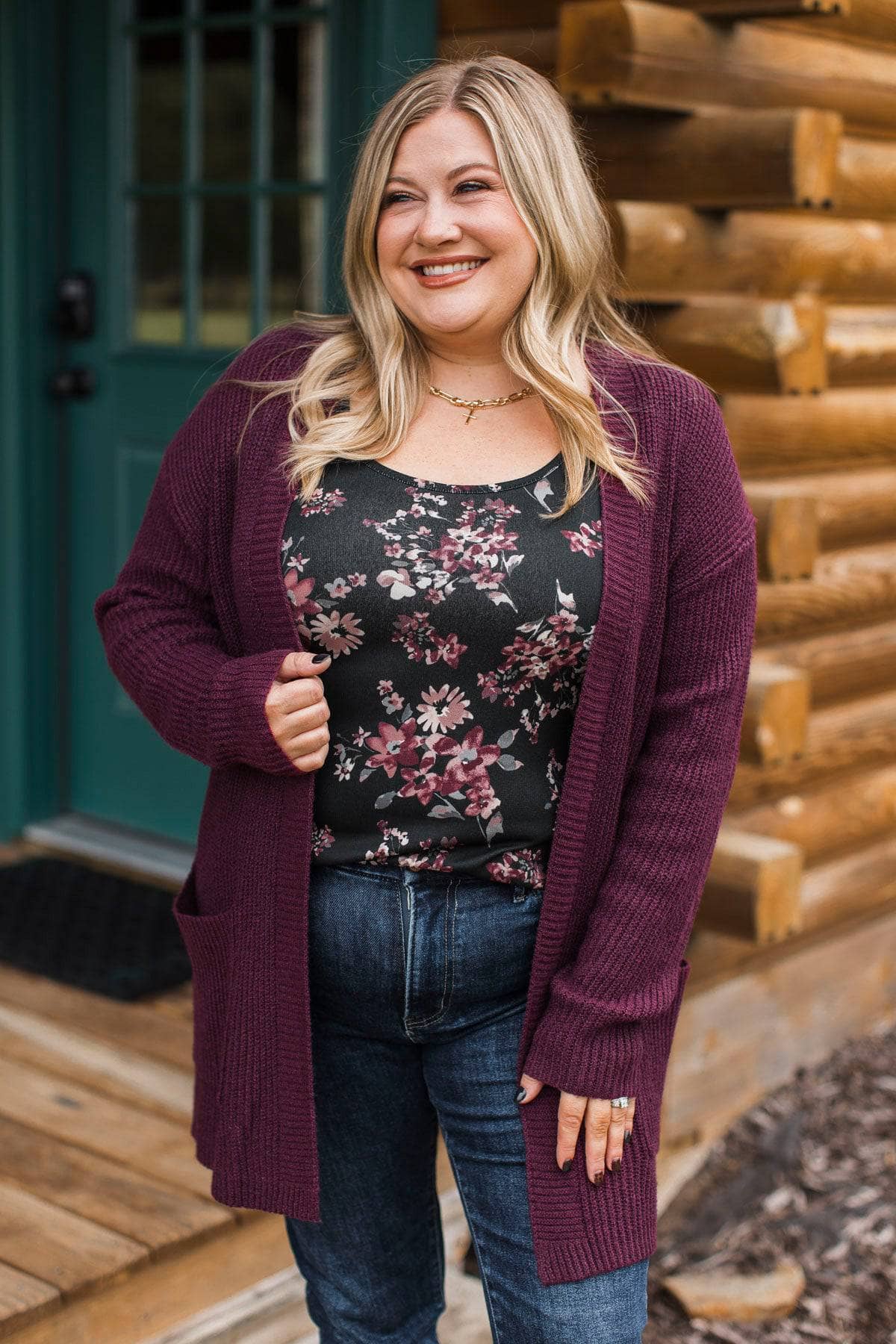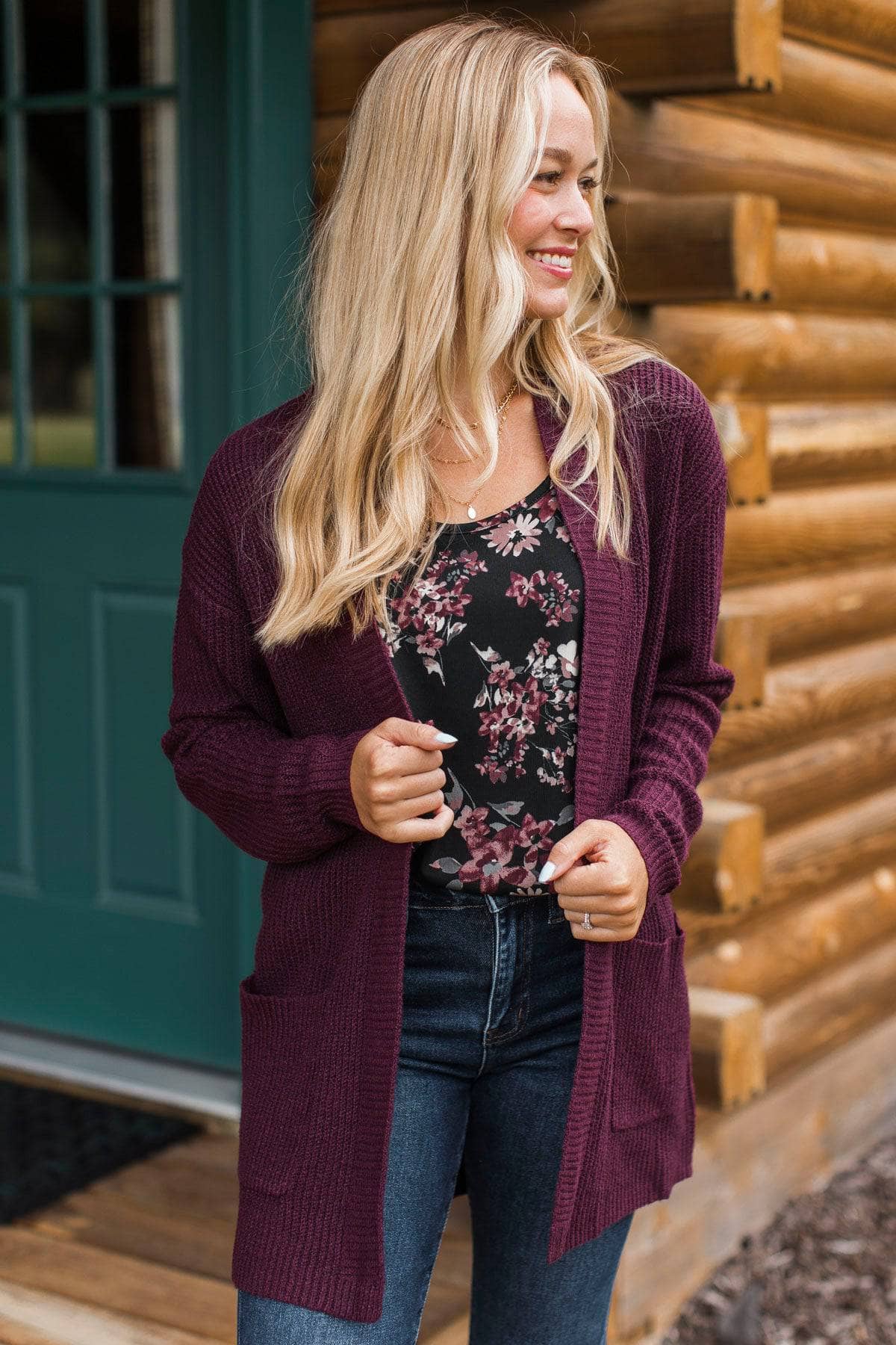 Create Magic Open Front Knit Cardigan- Dark Plum