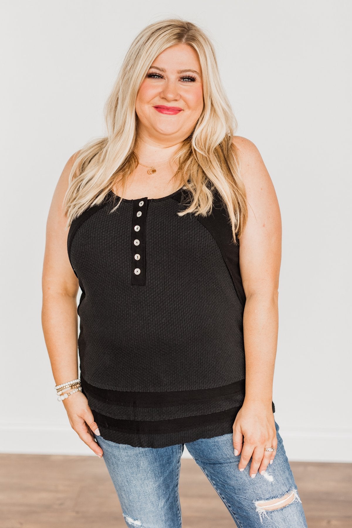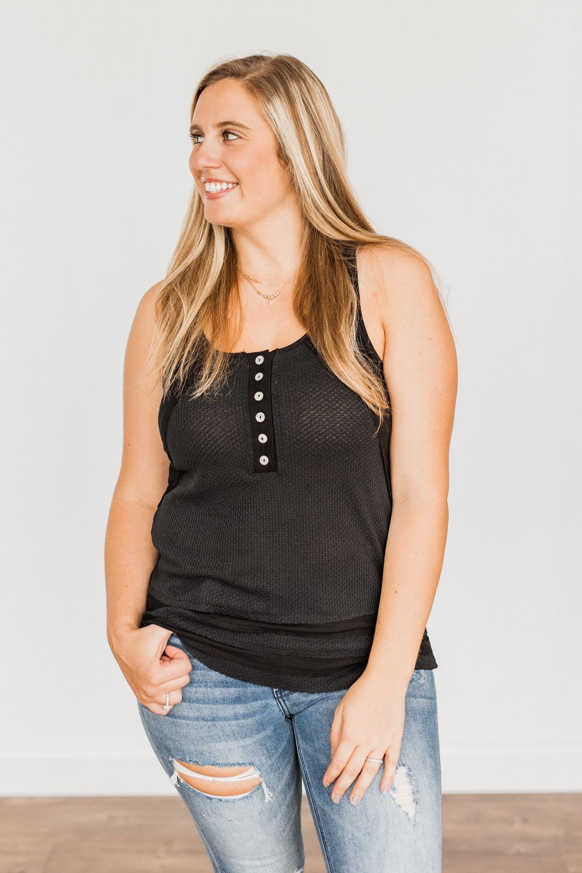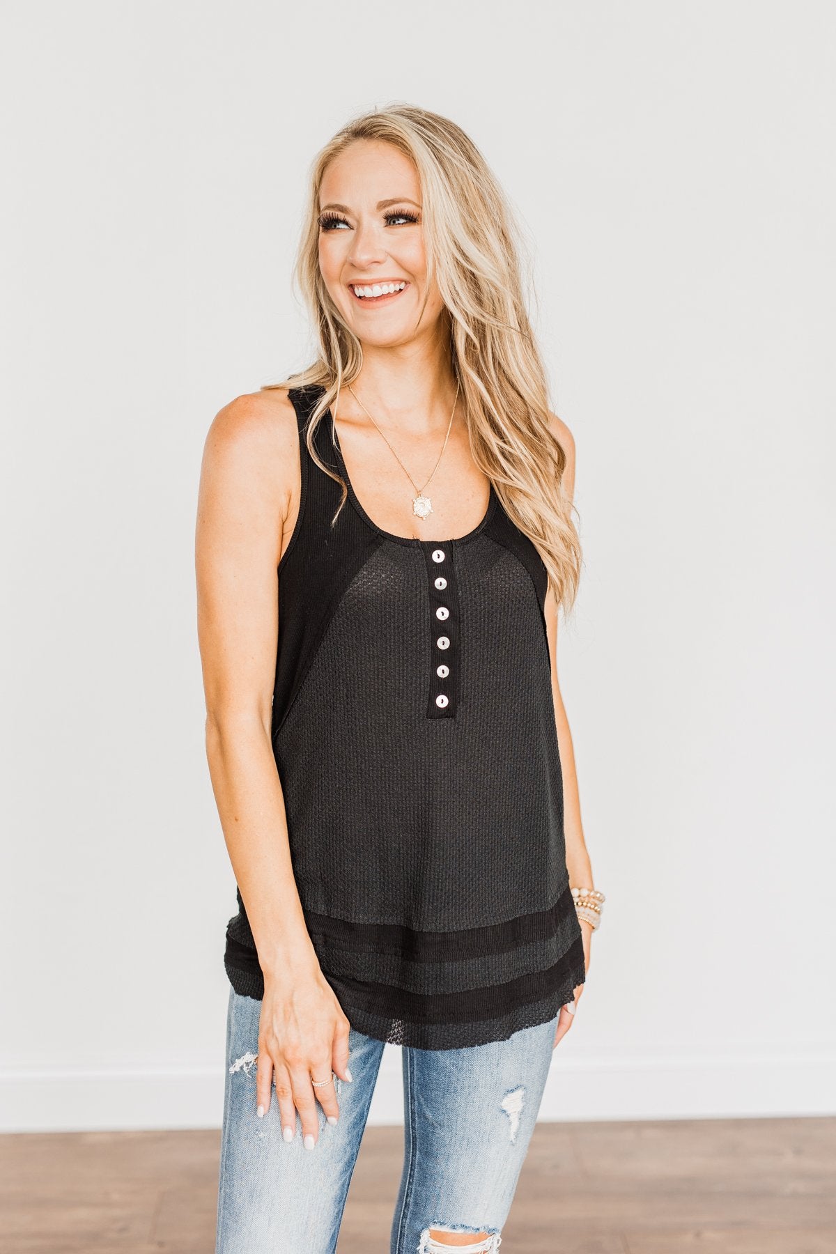 Express your style and look great while doing it with this simply splendid tank top! This tank exudes quality that never goes out of style with features like the waffle knit material, raw seam details along the body, crochet straps, and a button neckline! You're sure to keep your smile shining whenever you're in this stunning piece!