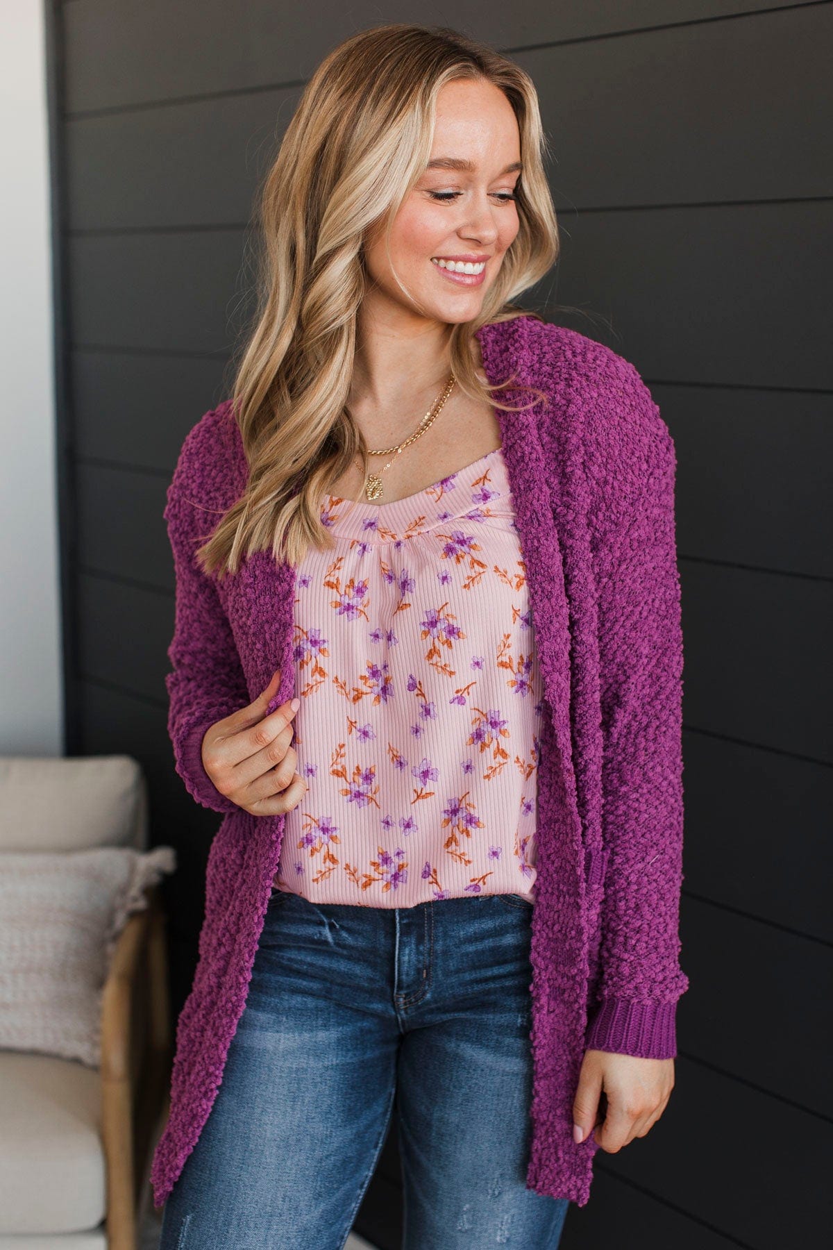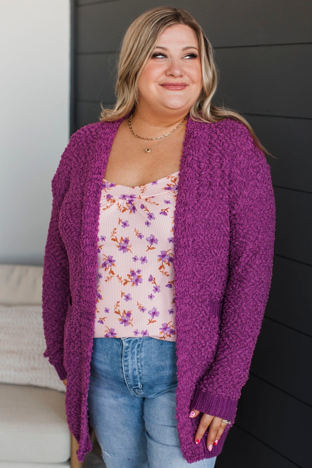 Movie Date Popcorn Knit Cardigan- Deep Orchid