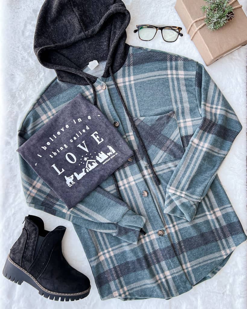This cute and colorful plaid top is such a great cozy piece for Winter! Style with our new graphic tee.