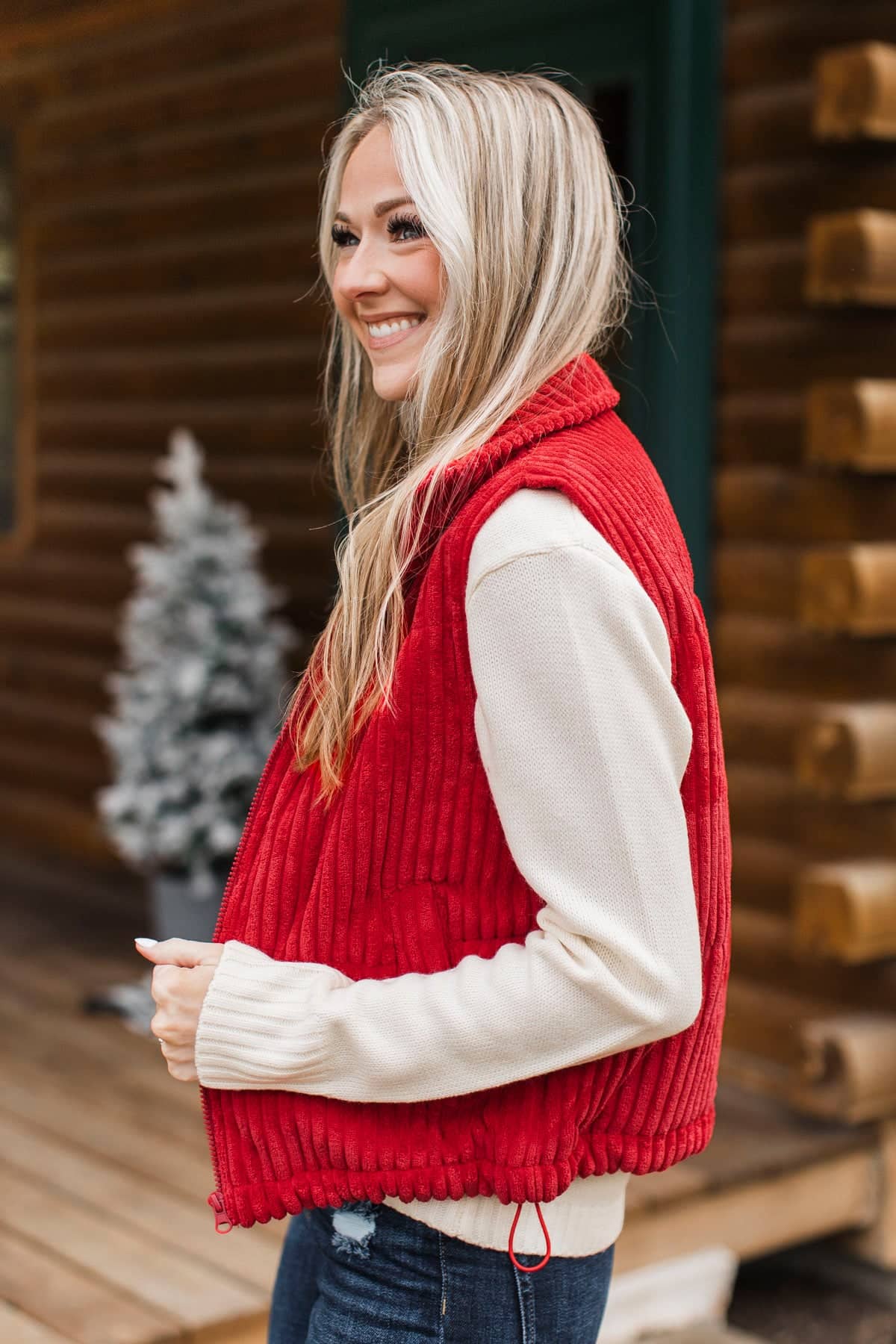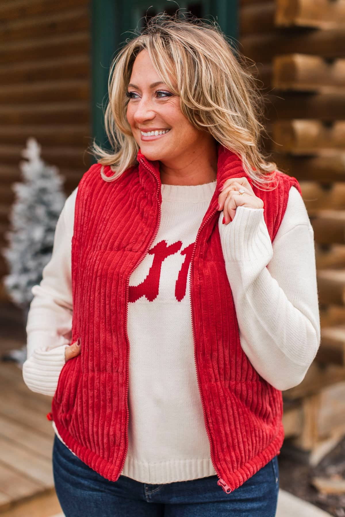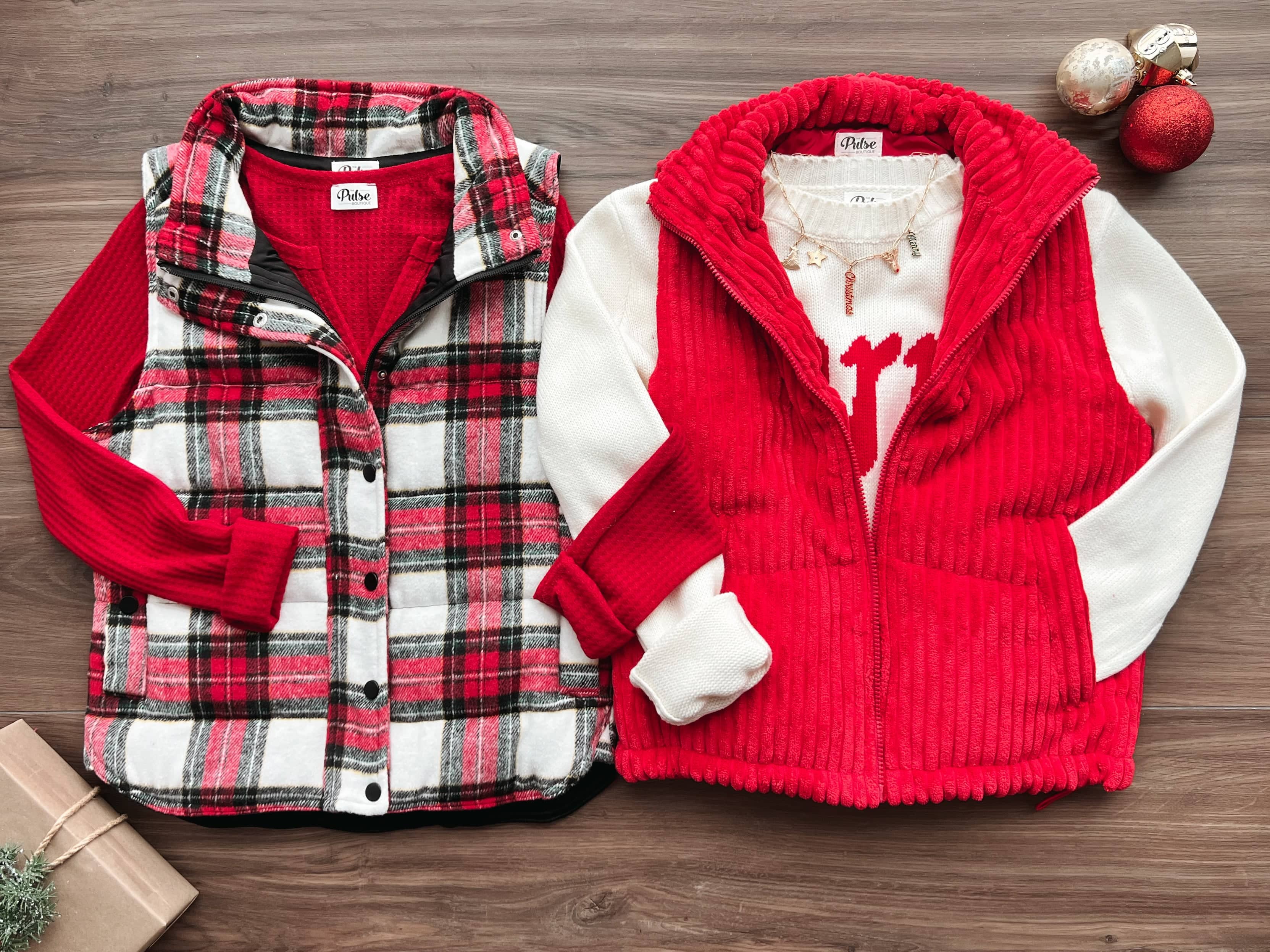 Vests are a must have for Winter! Both of these cozy puffer vests pair so well with our new long sleeve red notch top and "Merry" sweater.