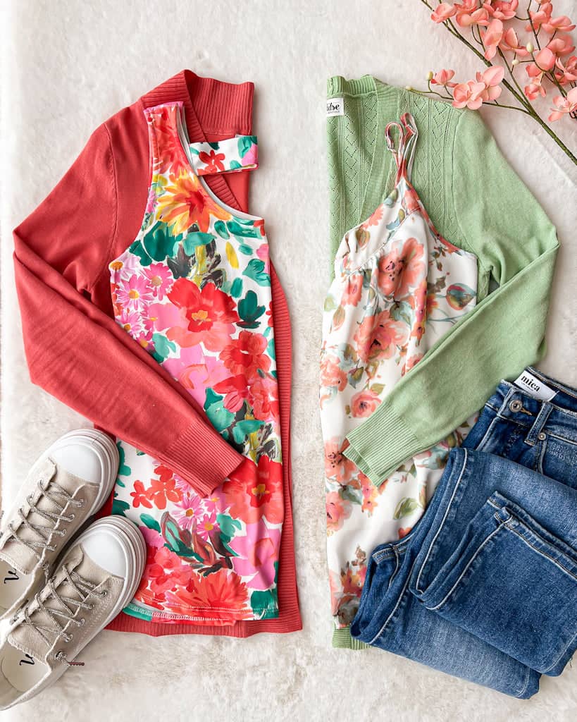 These floral tank tops are so fun and cute for the springtime! Pair with our coral or mint cardigans for a comfy everyday outfit.