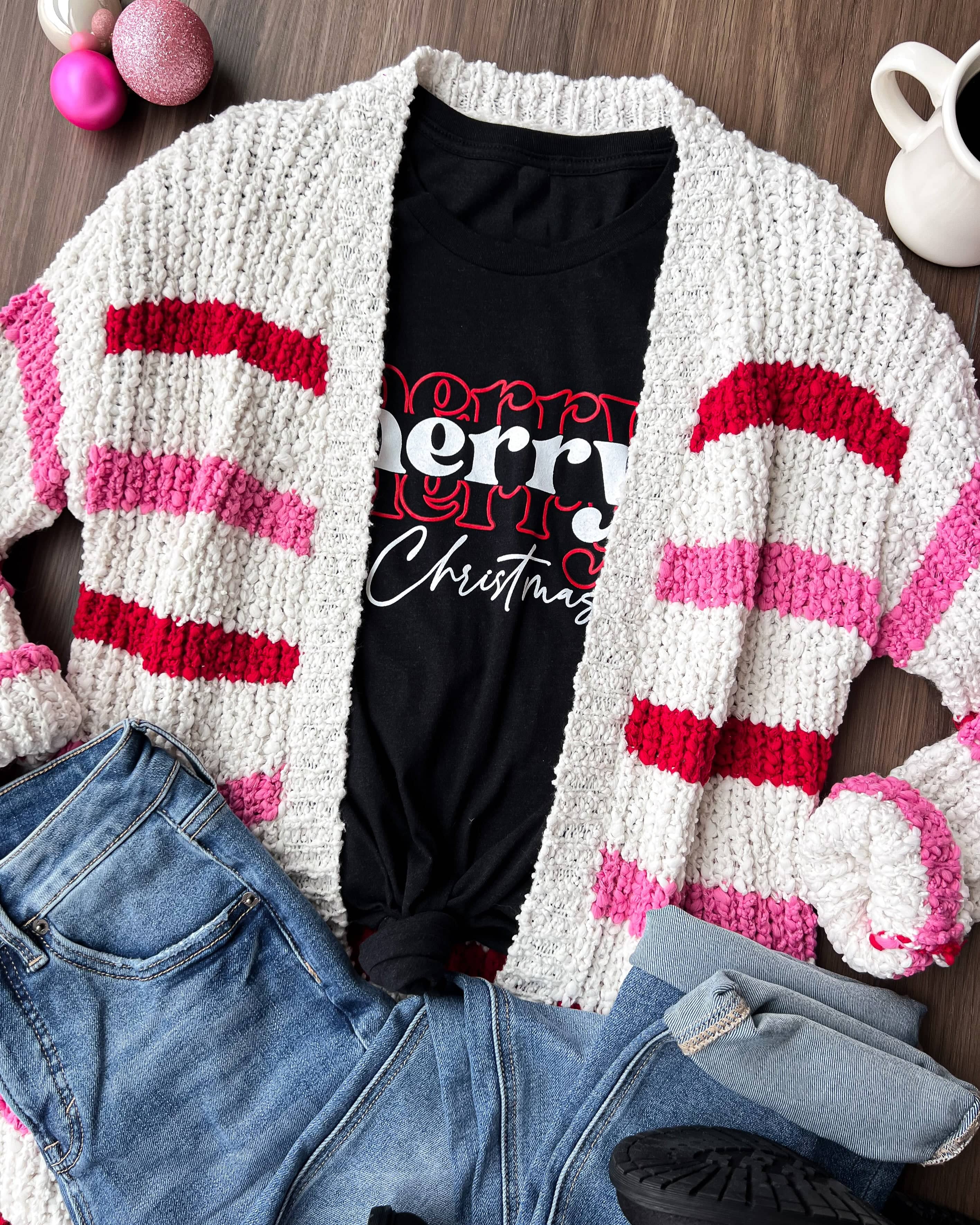 This cute and colorful striped cardigan is such a great cozy piece for Fall or Winter! Style with our favorite Christmas graphic tee.