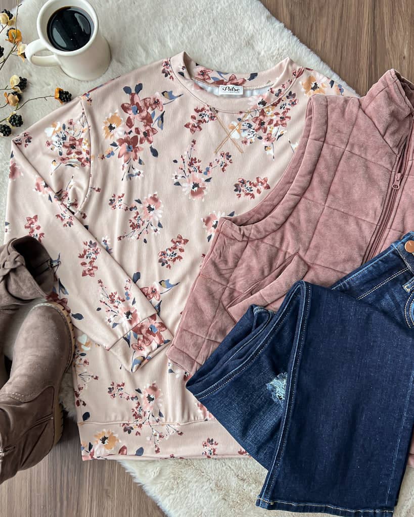 This pink puffer vest is the ultimate staple piece for your Winter wardrobe! Style with jeans, booties and this floral print long sleeve top.