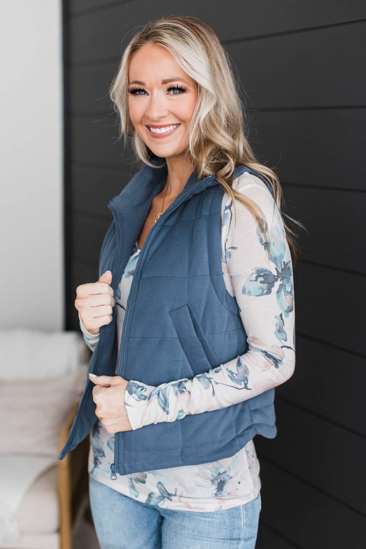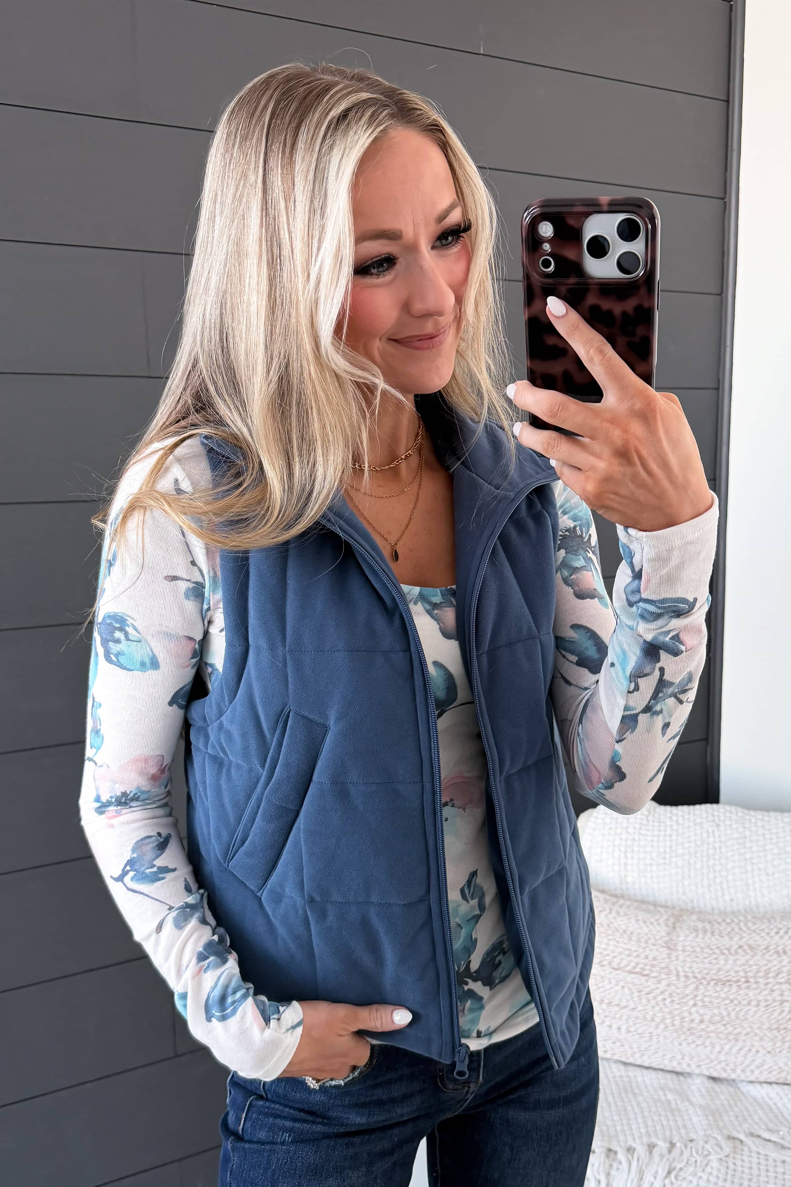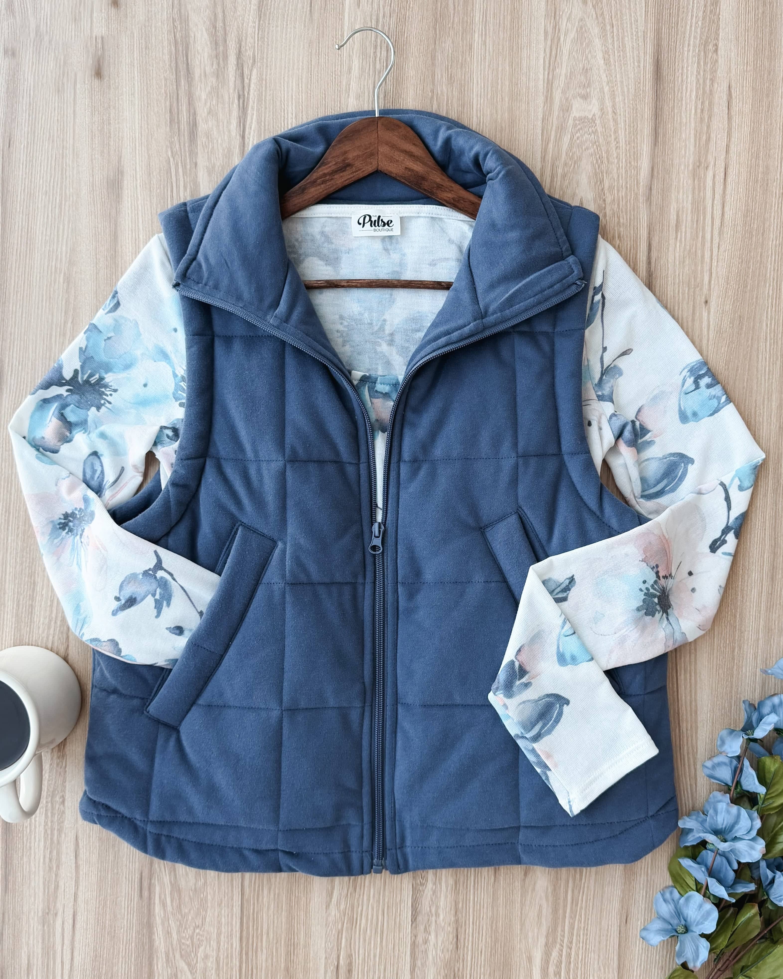 This adorable blue vest pairs so beautifully with this floral print long sleeve top! Add it to your closet for anytime of the year.