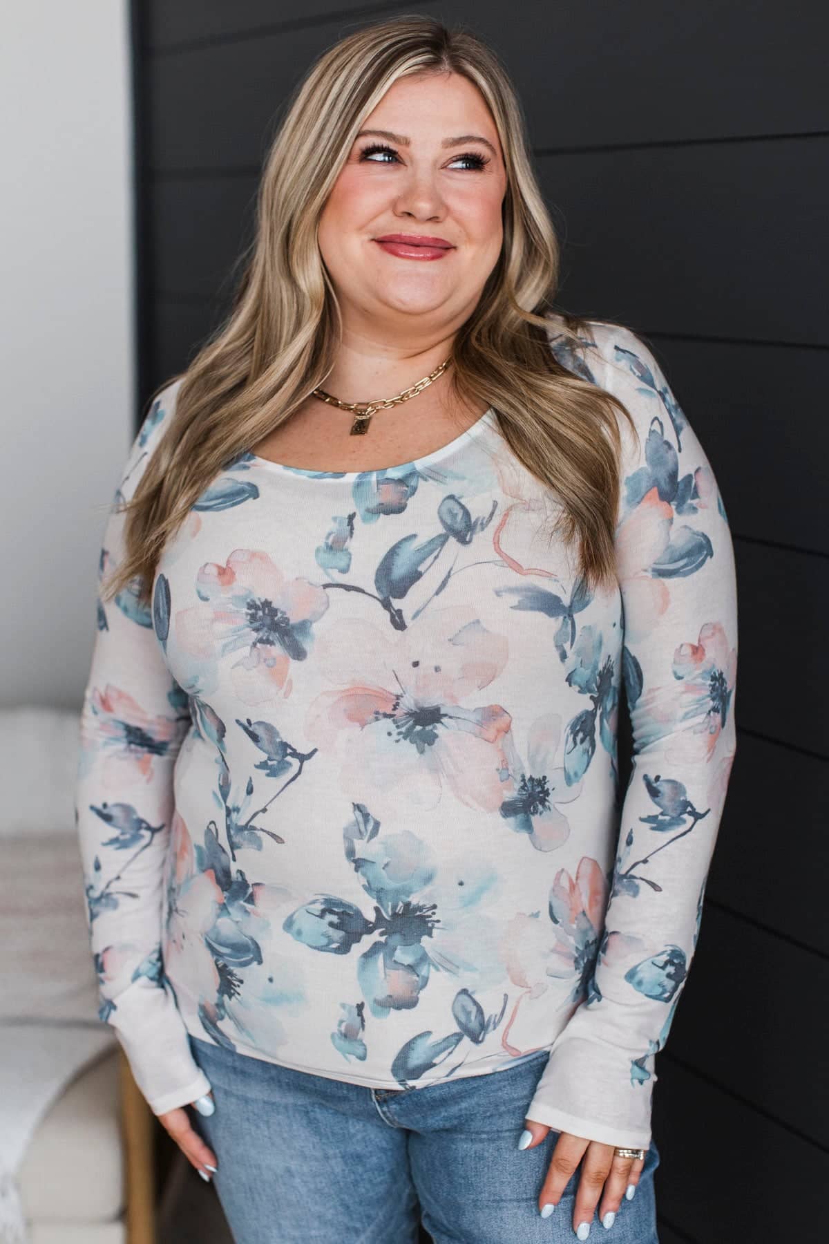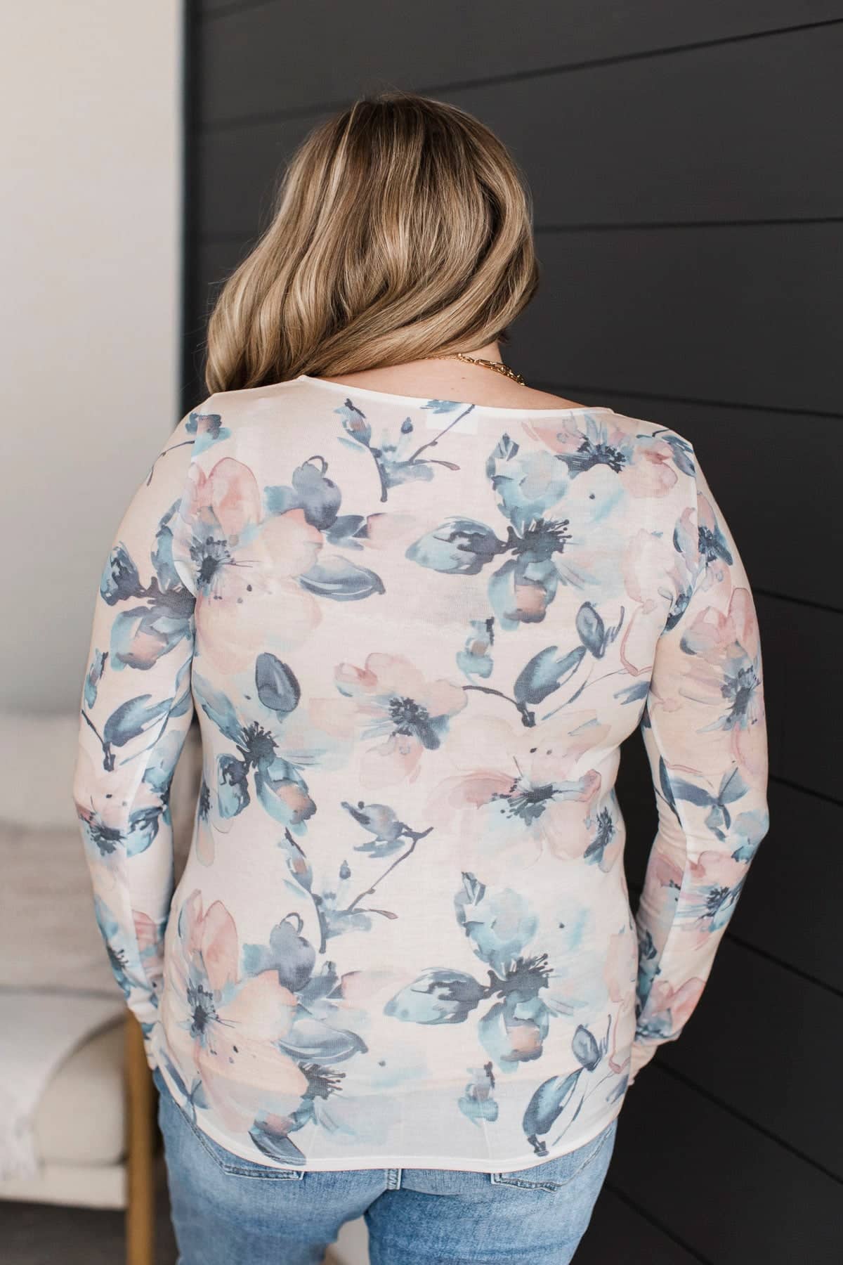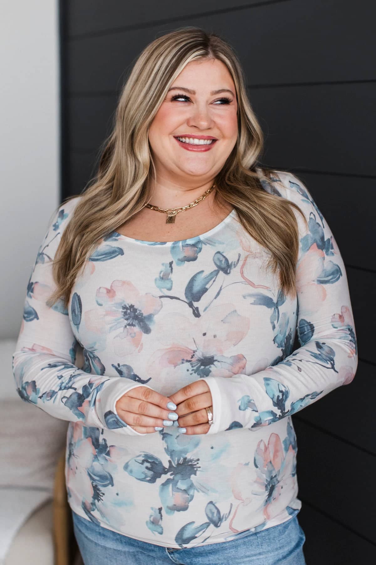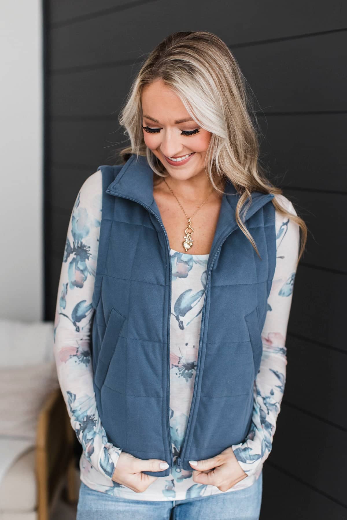 This adorable blue vest pairs so beautifully with this floral print long sleeve top! Add it to your closet for anytime of the year.