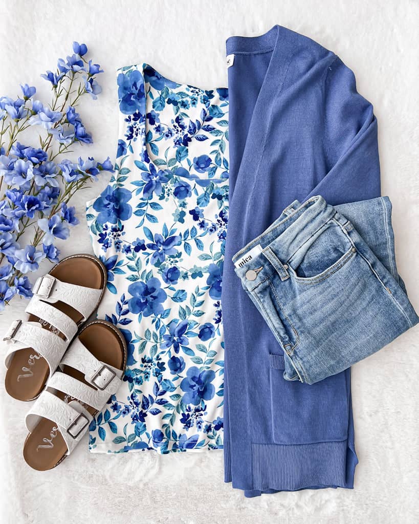 This gorgeous blue floral print tank top is perfect to style with our denim cardigan! Pair with jeans and sandals for a cute Spring transition outfit.