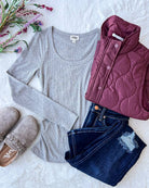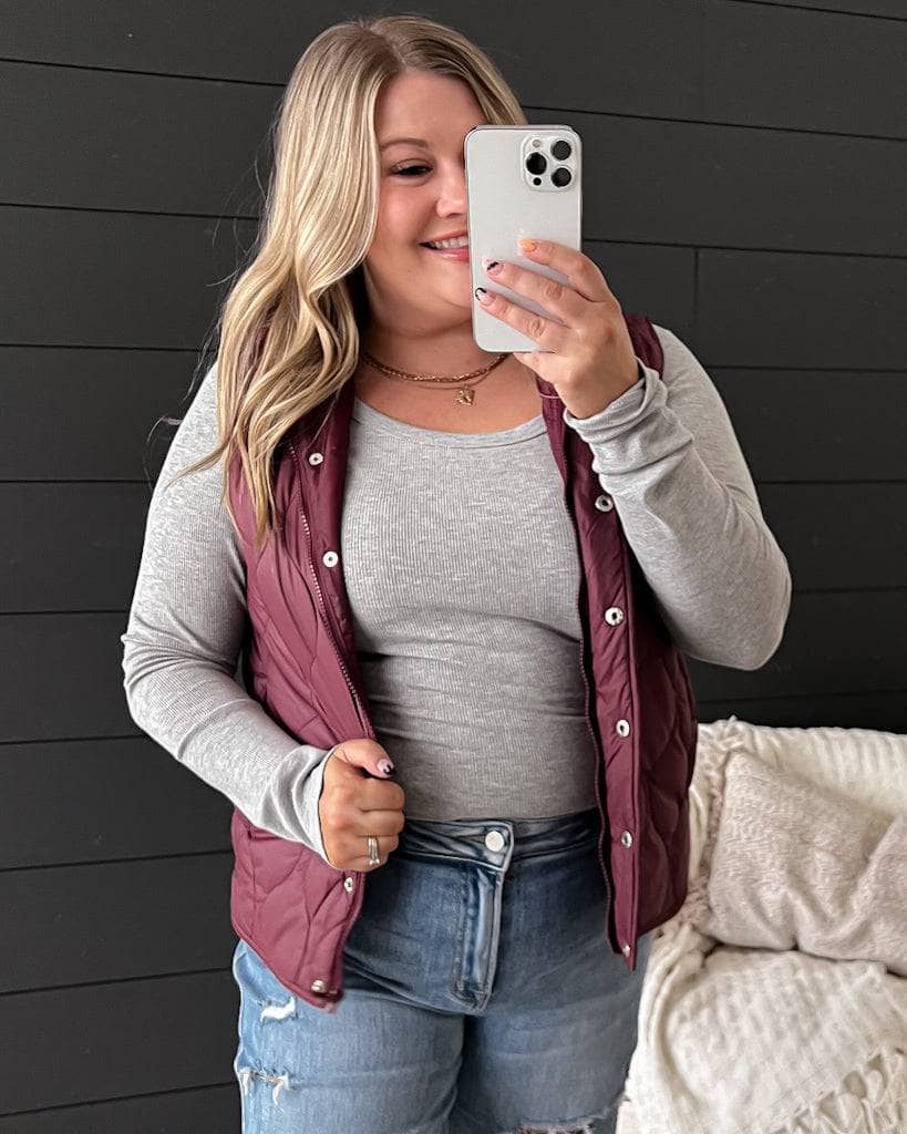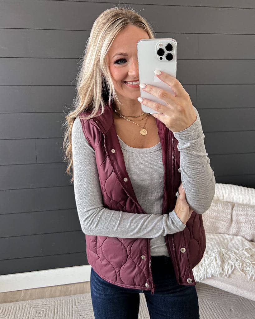 This adorable burgundy puffer vest is so easy to style with a long sleeve henley and dark wash bootcut jeans for any Fall day!