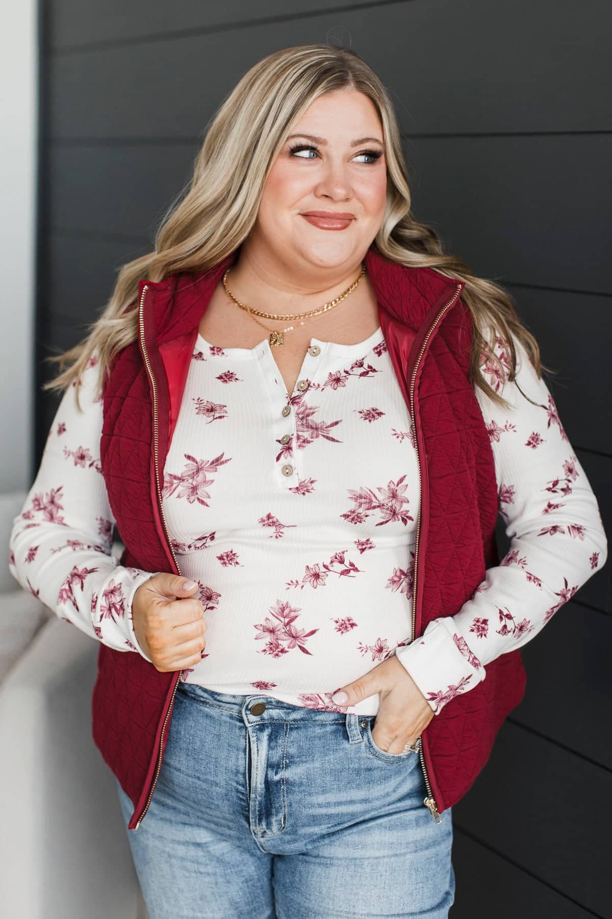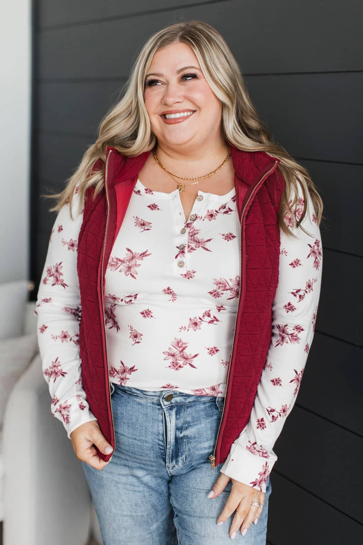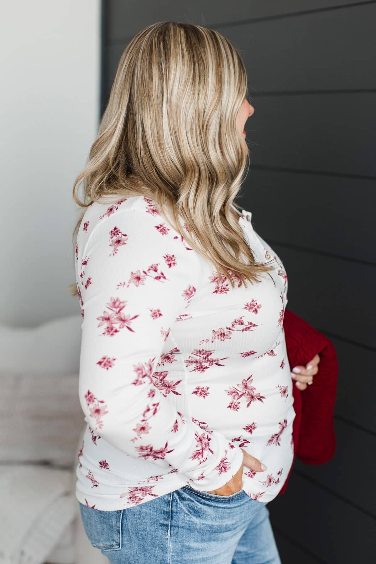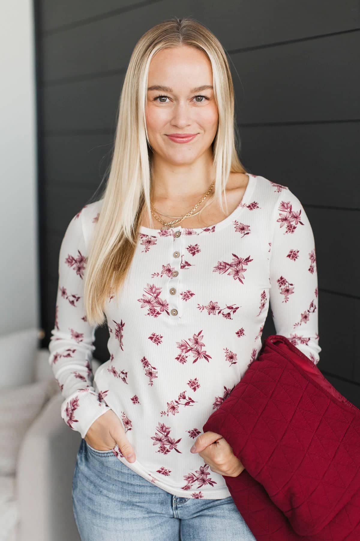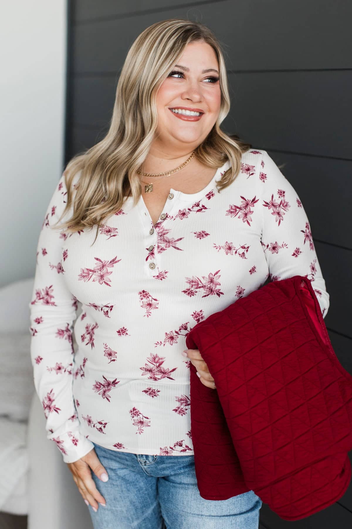 Call Me Lovely Floral Henley Top- White & Burgundy