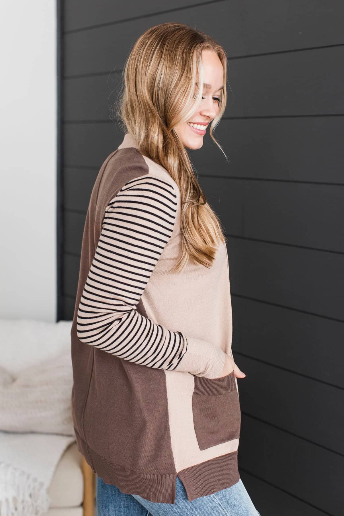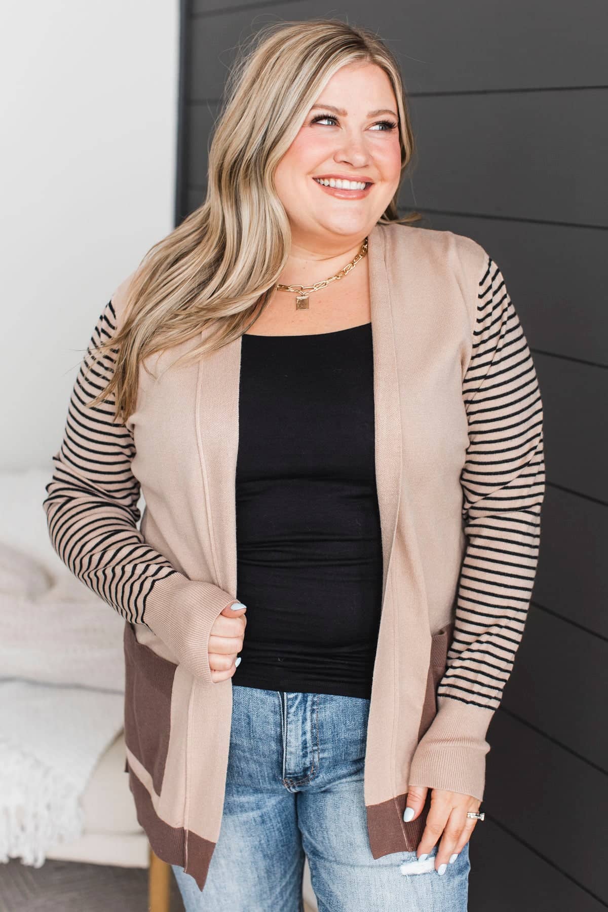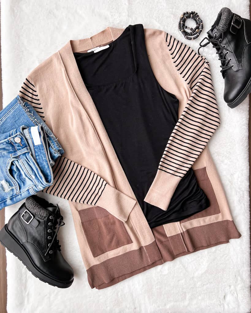This comfy and neutral striped cardigan is perfect to style with a black tank top and jeans for any day.