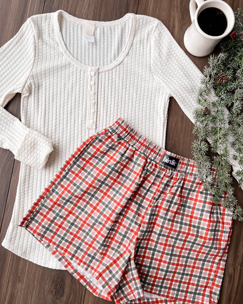 This cozy henley top and plaid boxer shorts pair so well together! Pair with slippers for an adorable Christmas morning outfit.