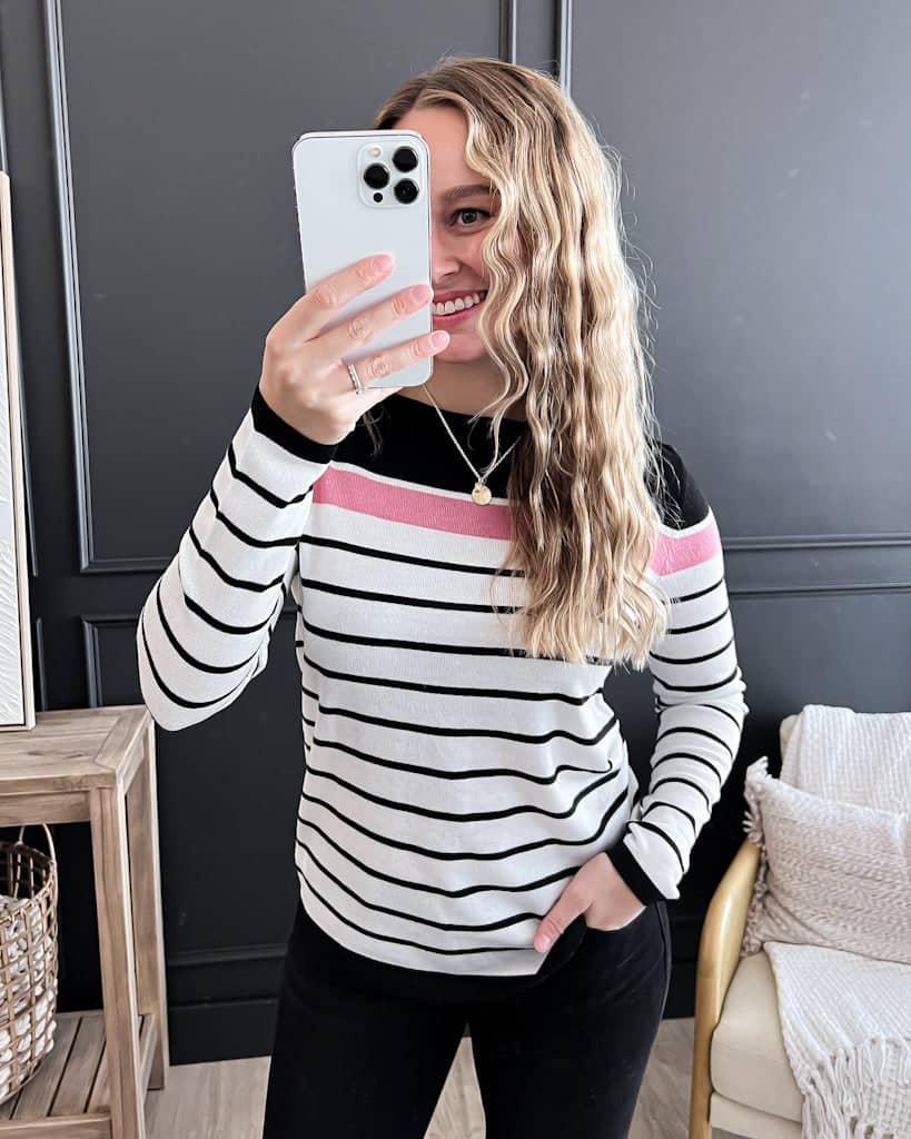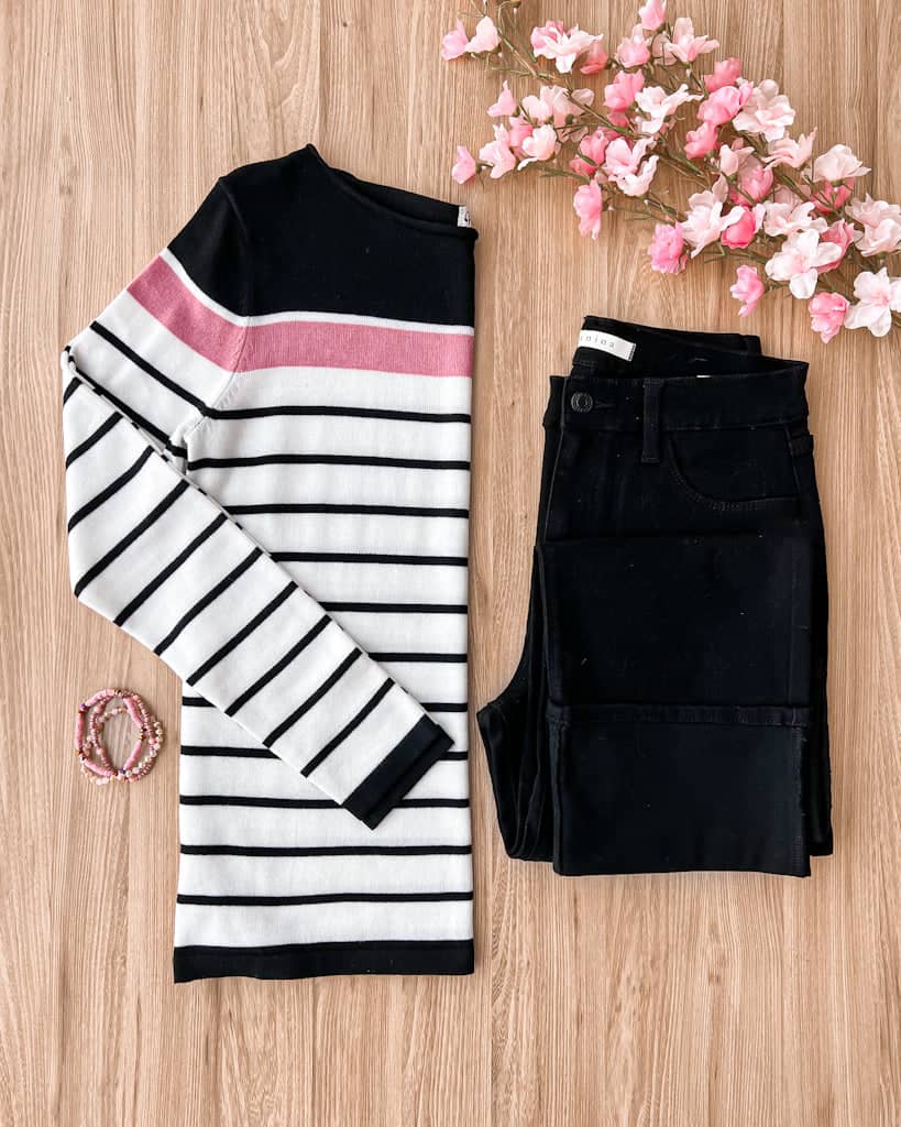This comfy and chic striped sweater is a best-seller! We love pairing it with black jeans and booties for stylish outfit you can wear in the Winter or Spring.