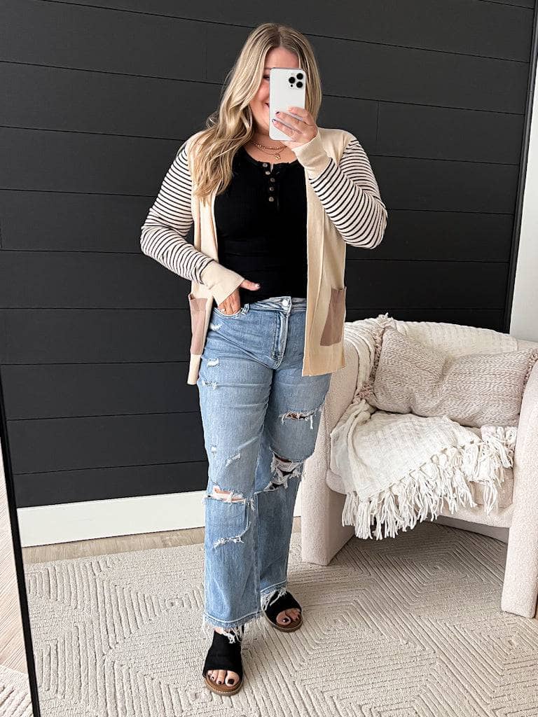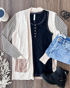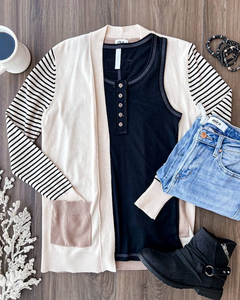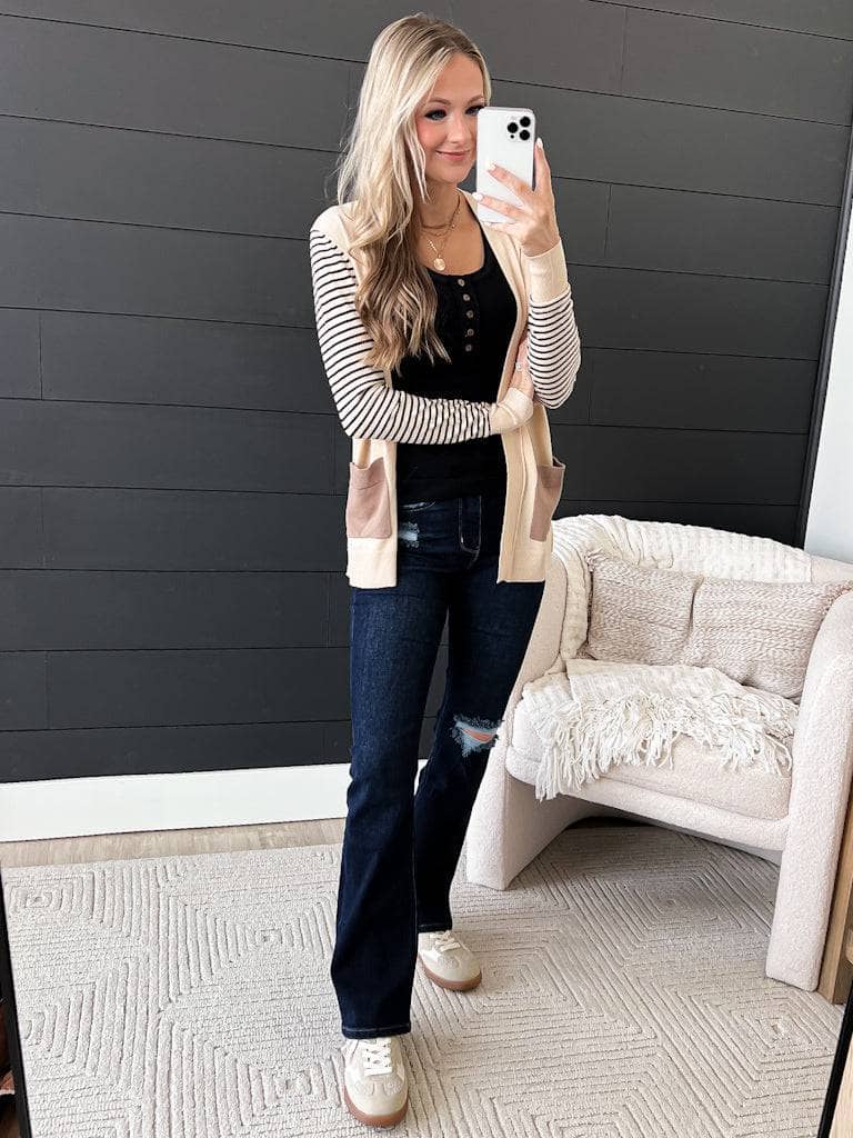 This adorable striped cardigan is the perfect mix of stylish and comfy! Dress it up or down for any Fall day. Pair with our henley tank top and light wash jeans for a cute & causal outfit.