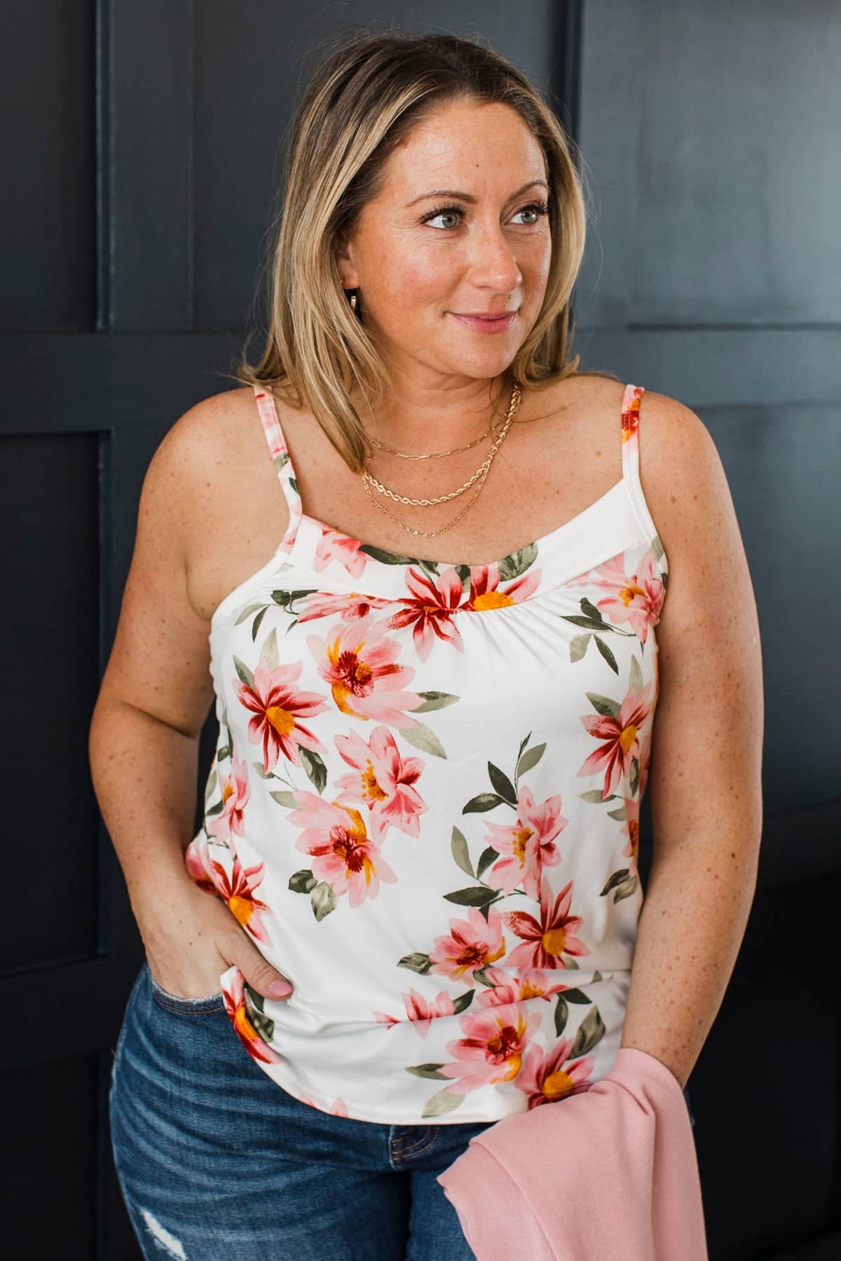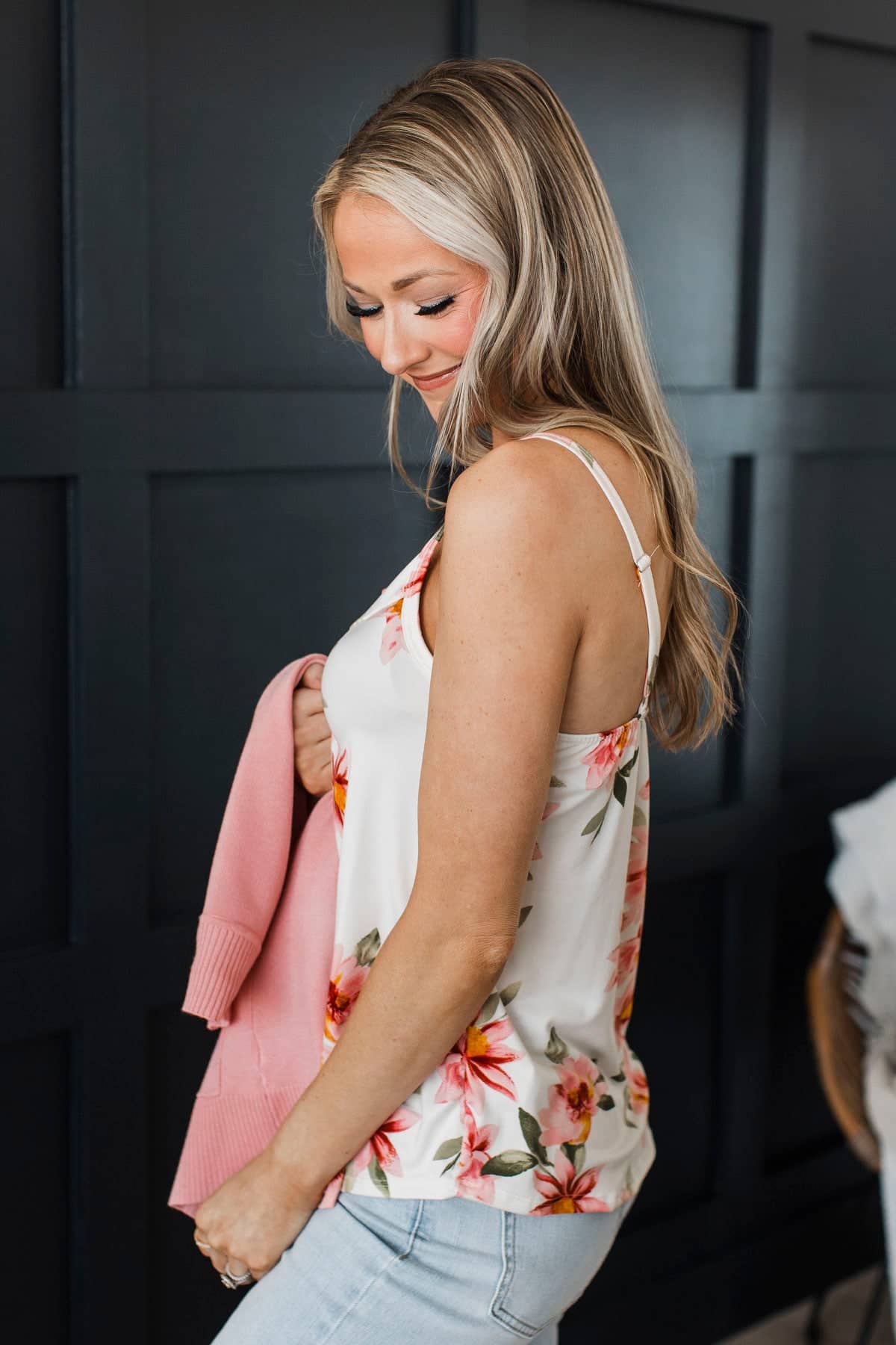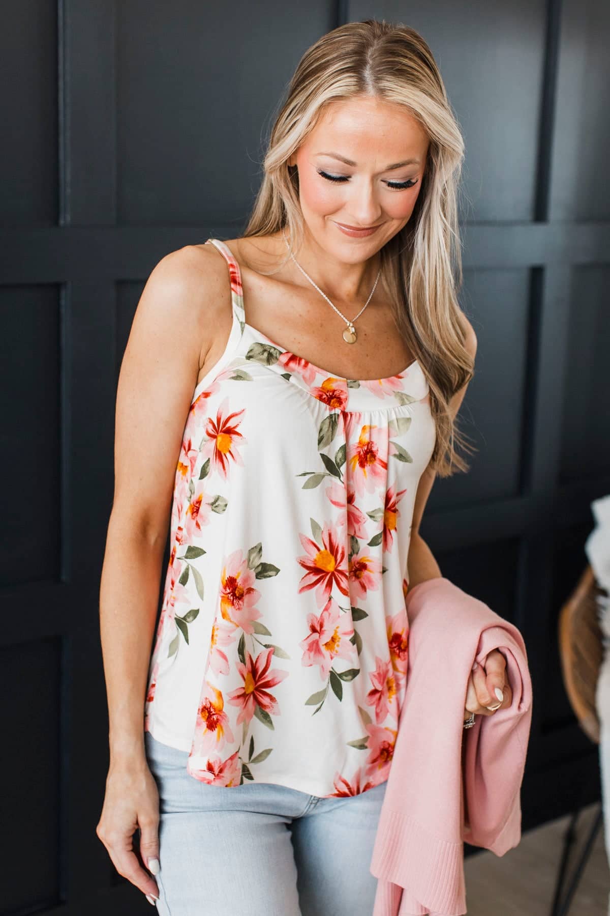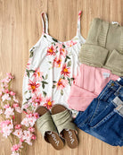 This gorgeous floral print tank top is so gorgeous when paired with either our pink or olive cardigans! Wear with your favorite jeans and sneakers for a casual and cute Spring look.
