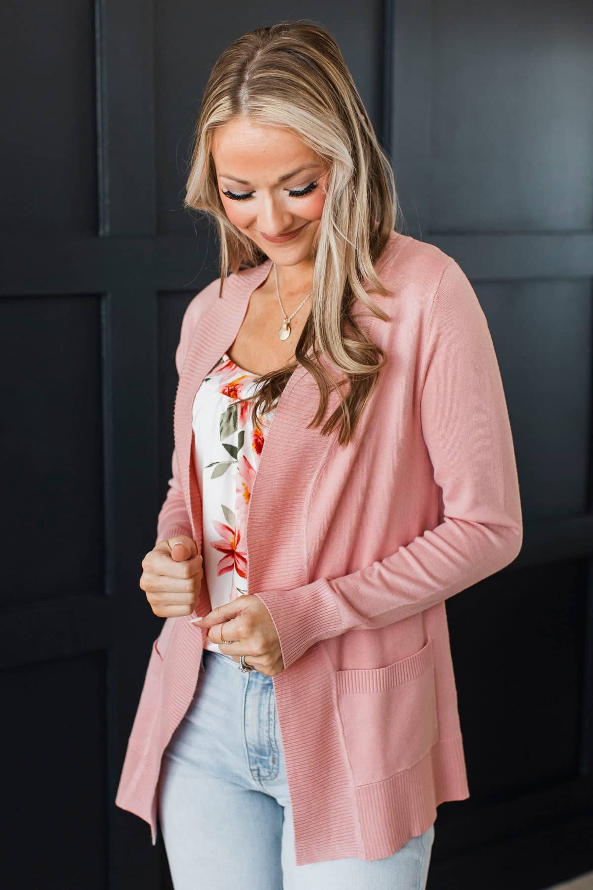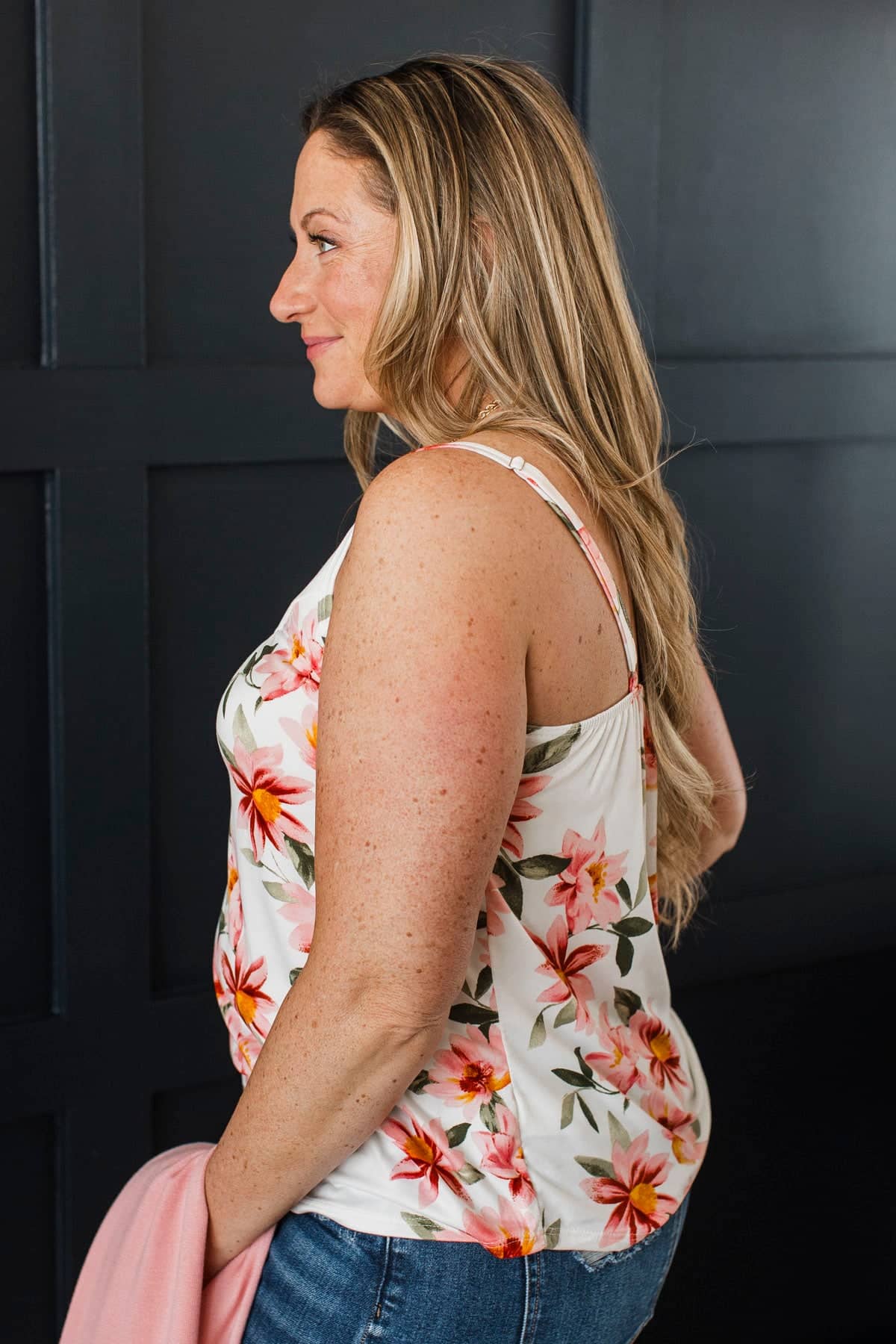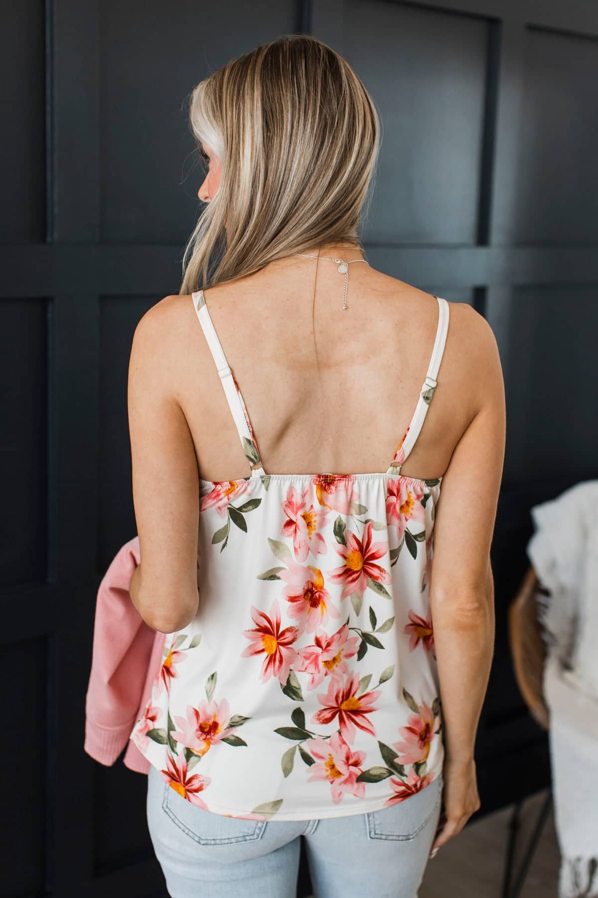 This gorgeous floral print tank top is so gorgeous when paired with either our pink or olive cardigans! Wear with your favorite jeans and sneakers for a casual and cute Spring look.