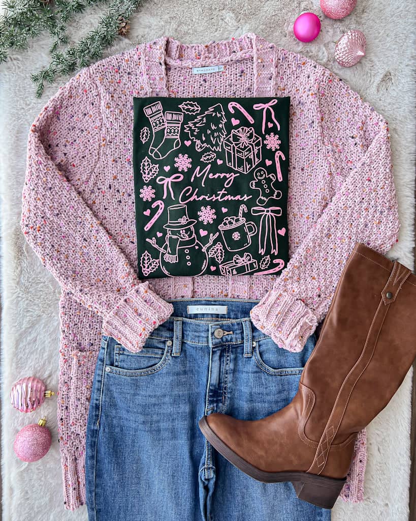 How adorable is this Christmas graphic tee? Pair with our matching pink cardigan and your favorite pair of boots for the perfect holiday outfit!