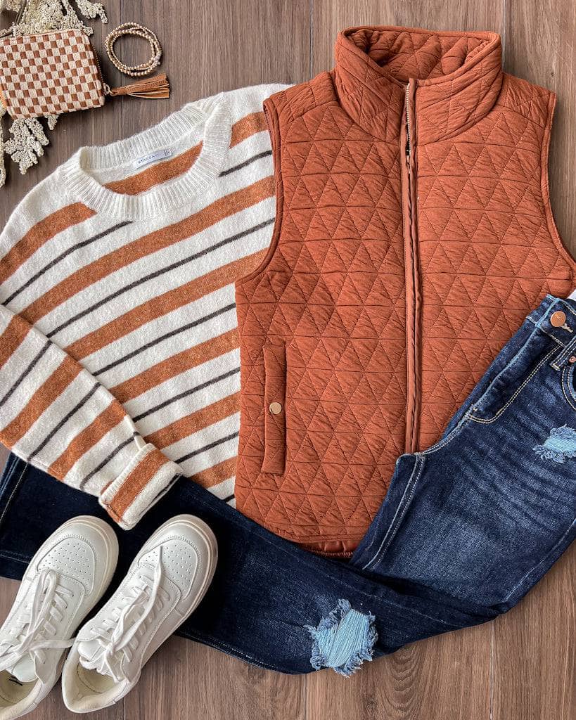 This gorgeous striped sweater pairs so well with our favorite quilted puffer vest for any Fall day! Style with jeans and sneakers for a cute and casual outfit.