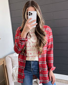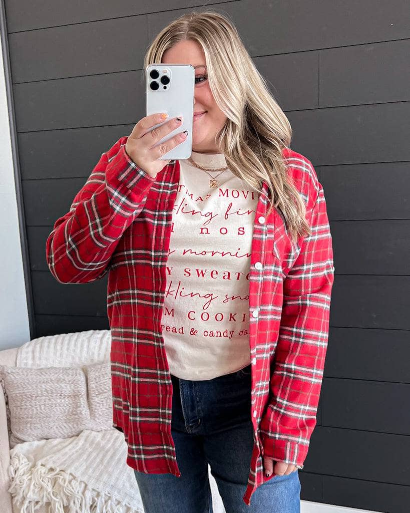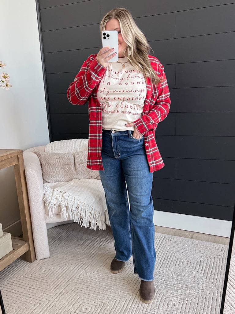 This holiday graphic tee is perfect to style with our plaid button down for a festive outfit! Pair with jeans and booties.