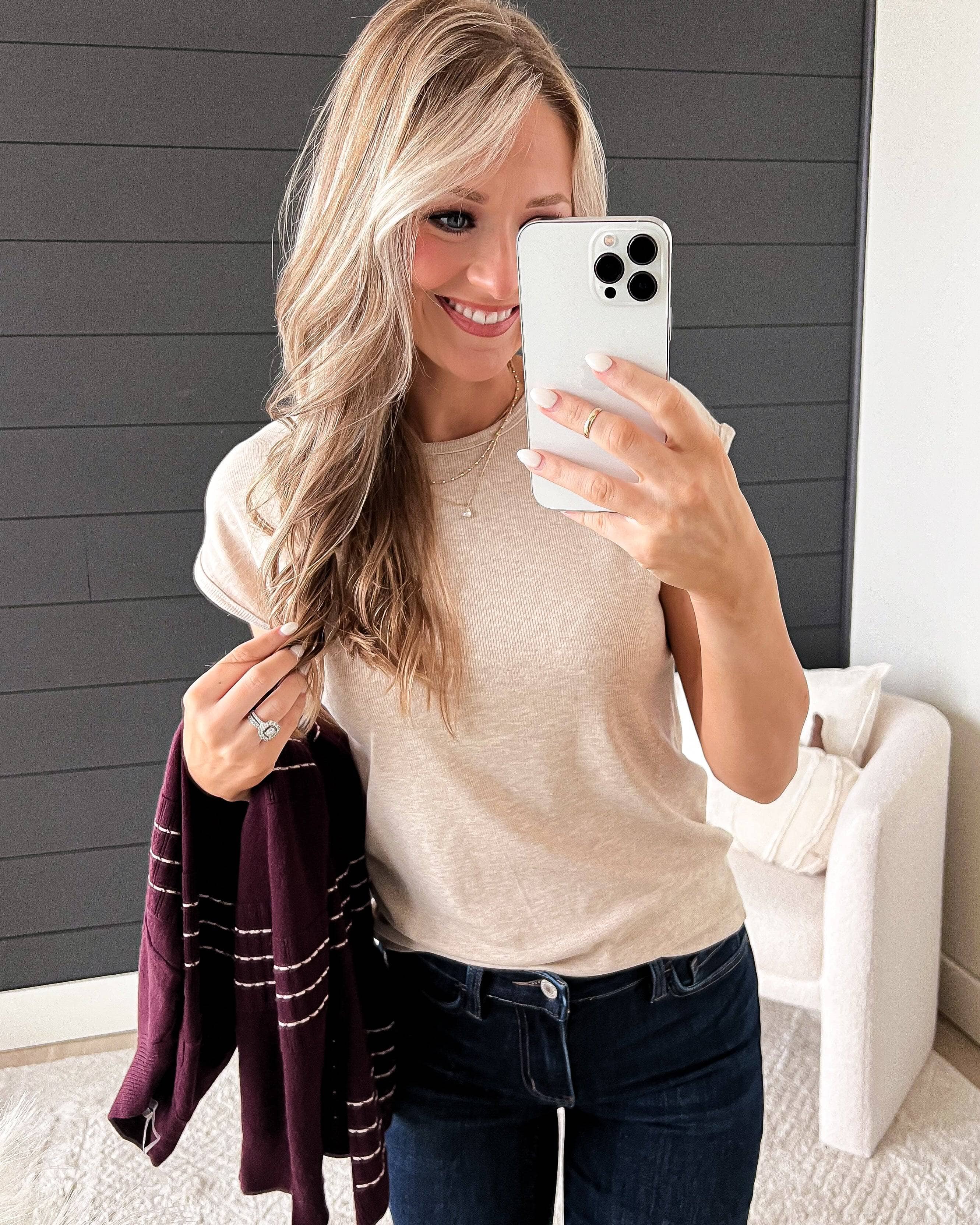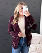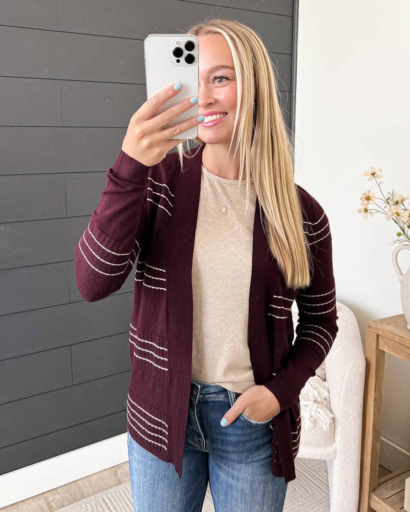 This fig colored striped cardigan is back in stock! Style with our neutral ribbed top and jeans for the cutest Fall outfit.