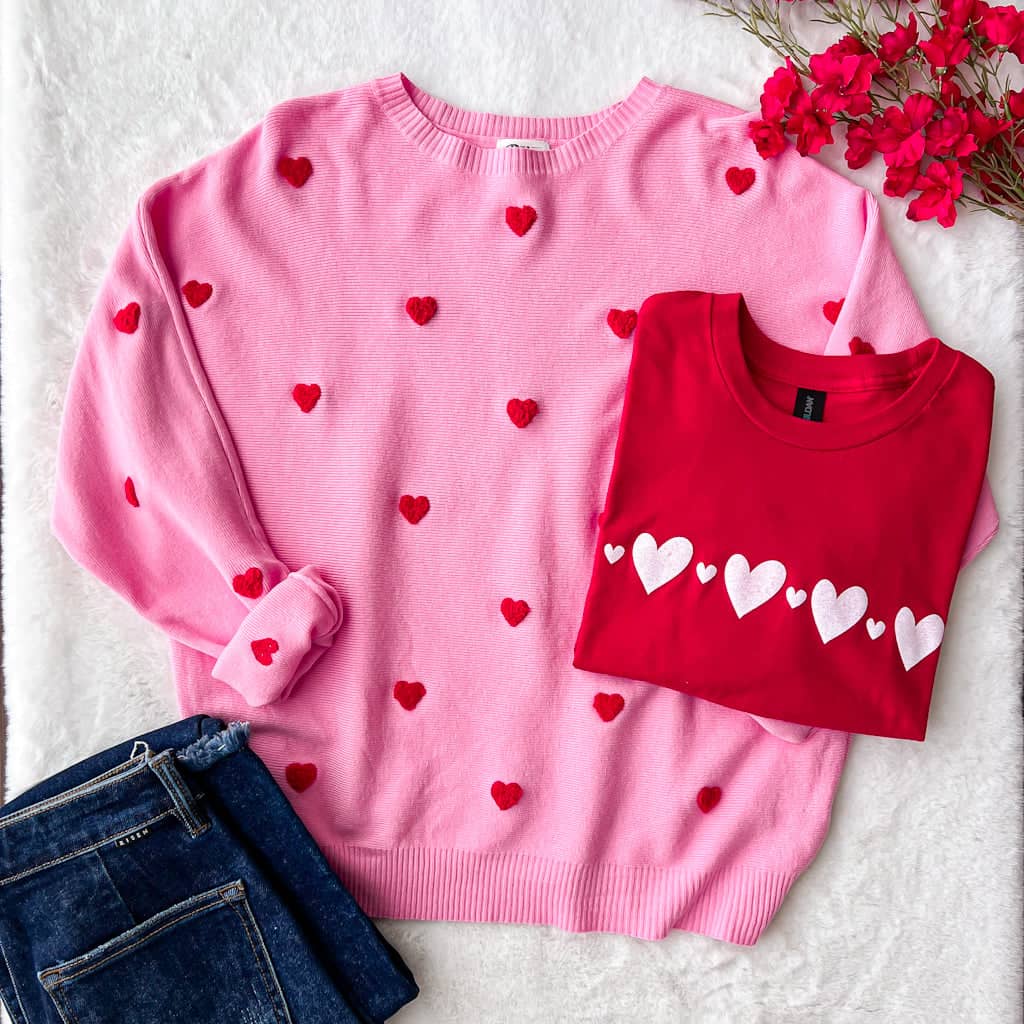 This adorable heart printed sweater is perfect to pair with jeans or leggings for a cute Valentine's Day outfit!