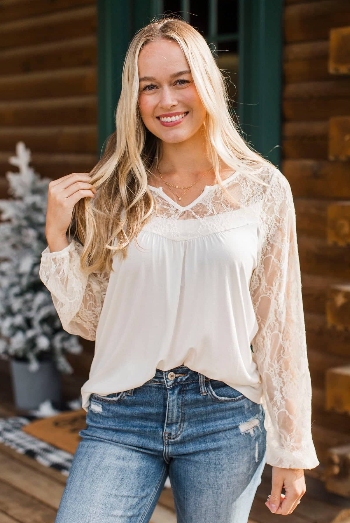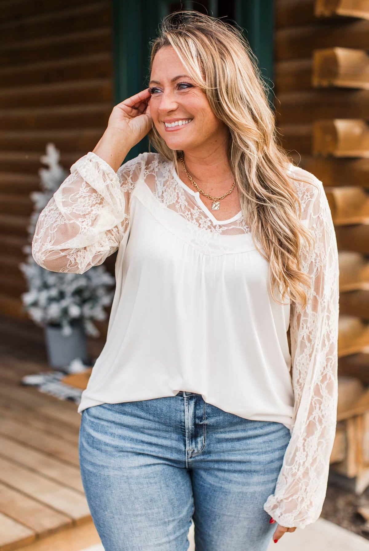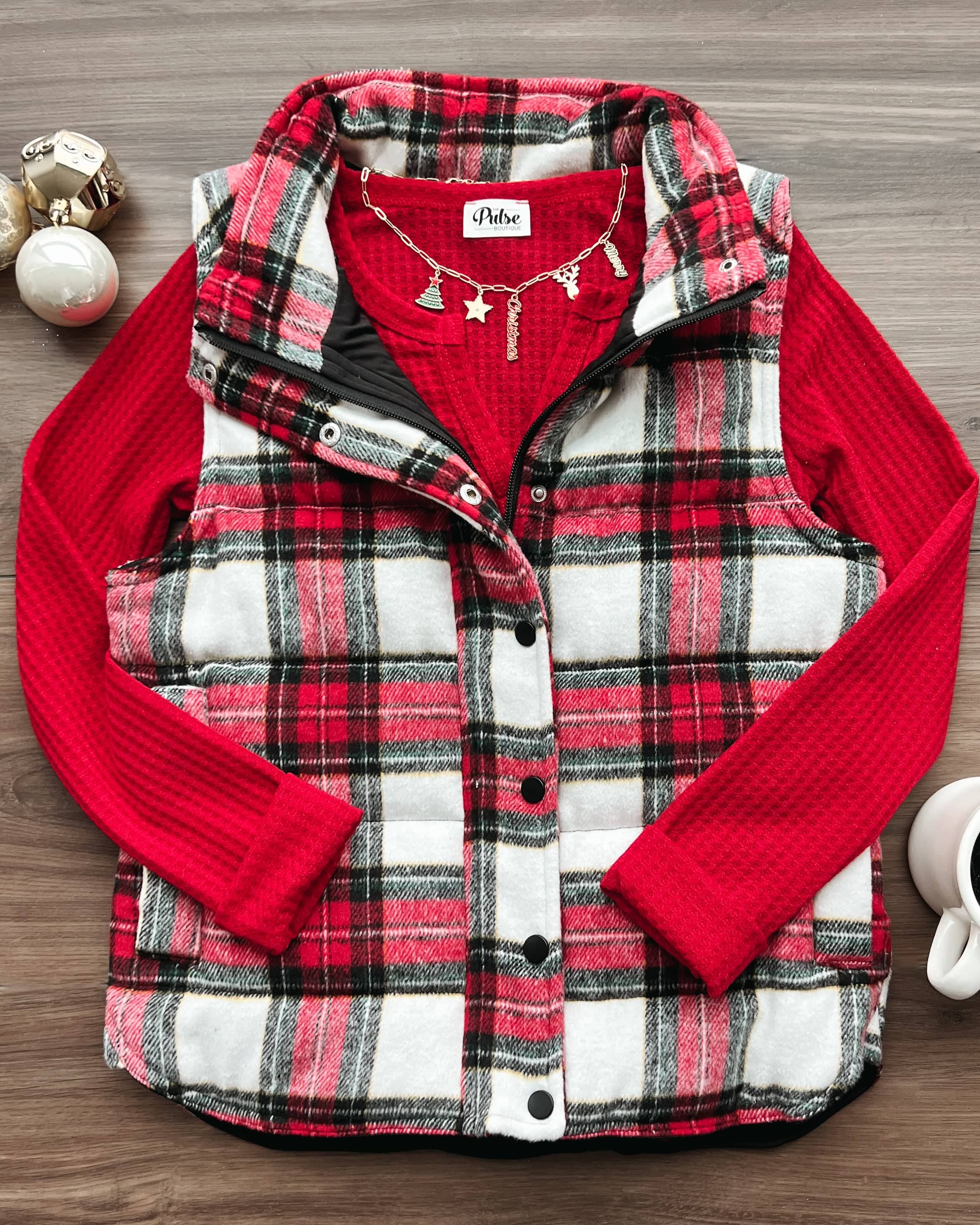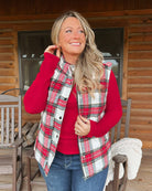 This beautiful red notch long sleeve top is such a great staple piece to pair with our cozy plaid vest! Style with jeans and boots for a perfect Winter outfit.