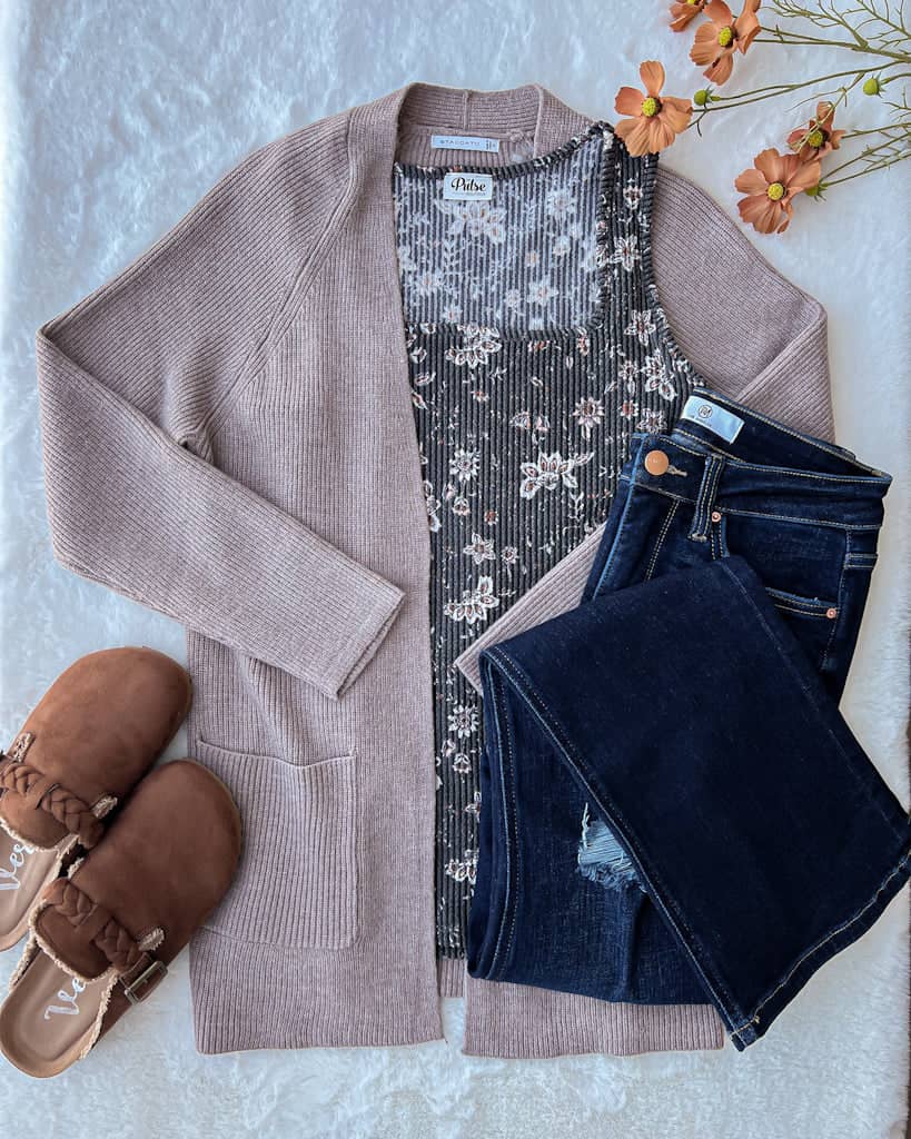 This adorable cardigan is perfect to style with your favorite tops. We love how it looks paired with this floral print ribbed knit tank top. Style with dark wash jeans to complete the look.