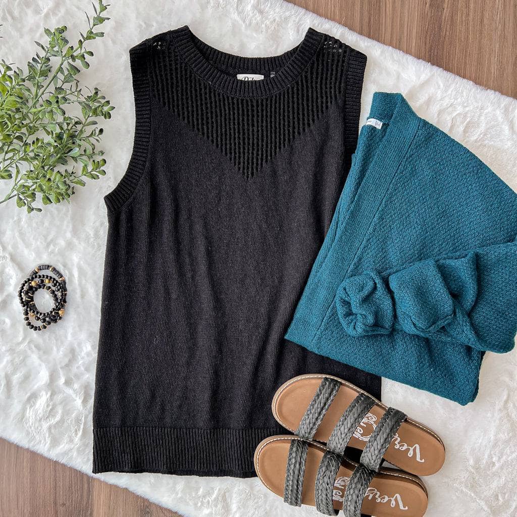 This adorable black knit tank top is great to style with or without a cardigan! But if you do want to pair it with a cardigan, we have the perfect style for that! Teal and black look so great together.