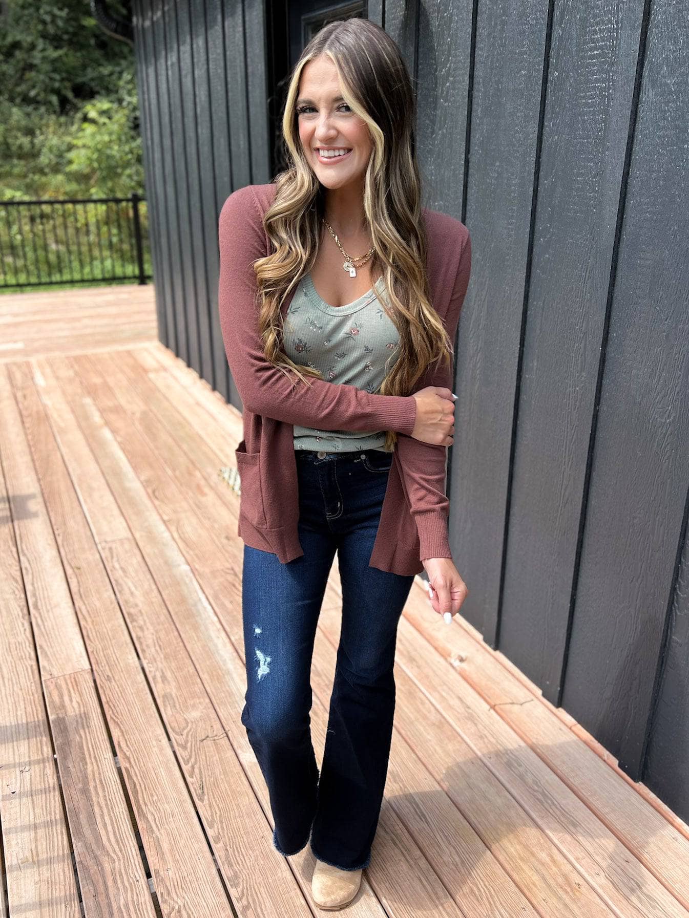 This adorable tank top is such a great staple piece for transitioning into the Fall! Style with a brown cardigan and flared denim.