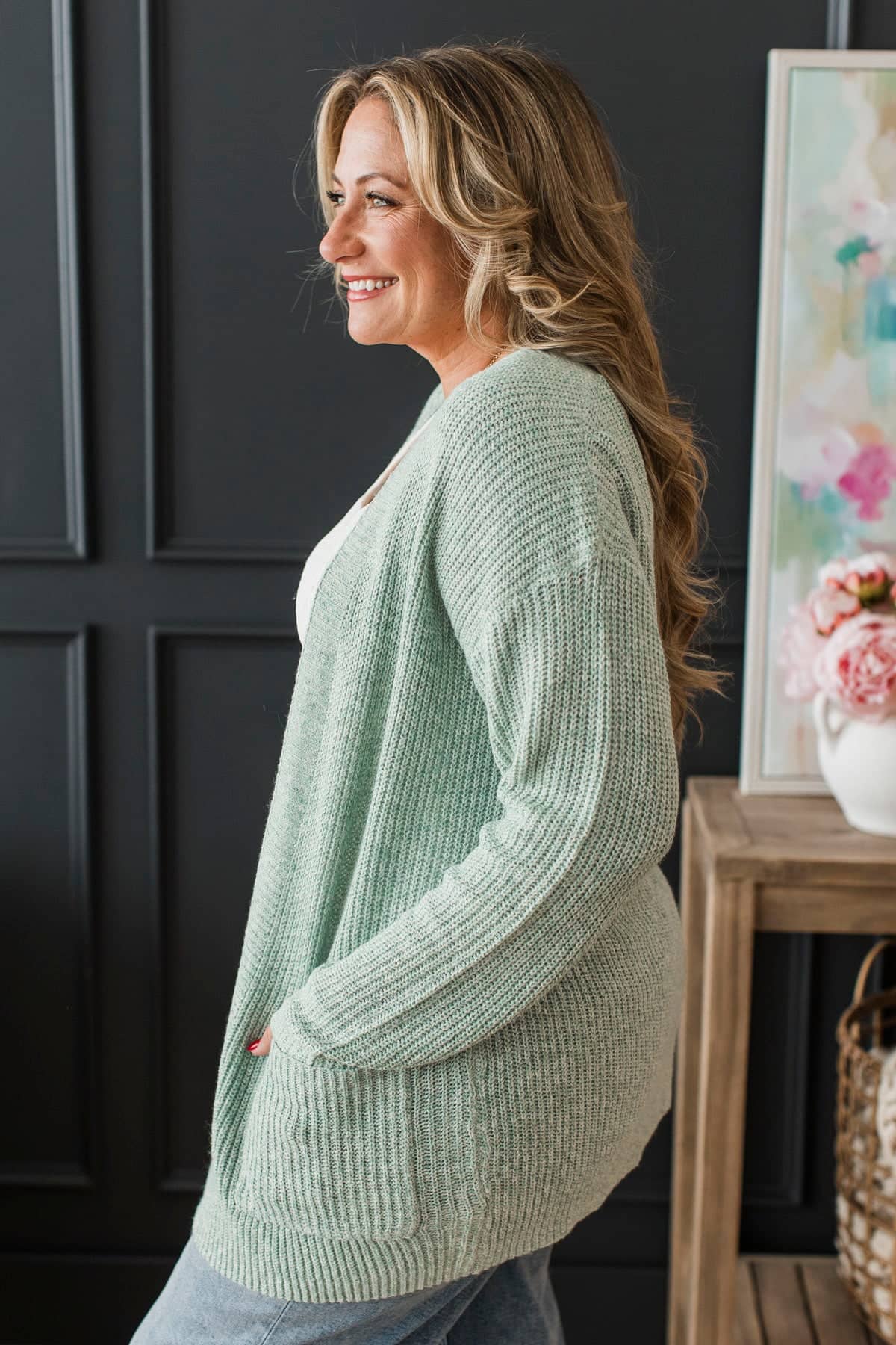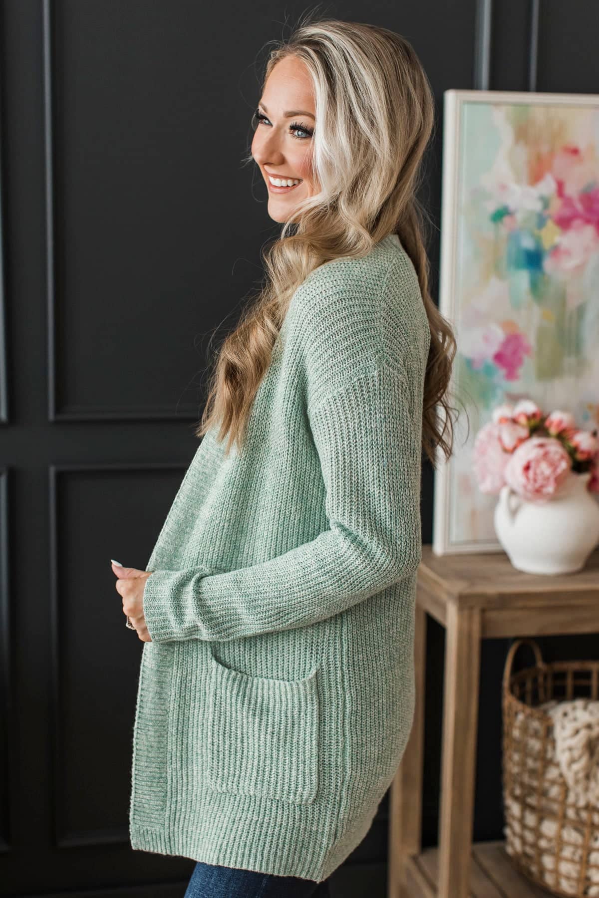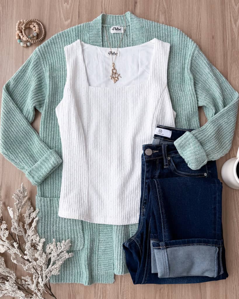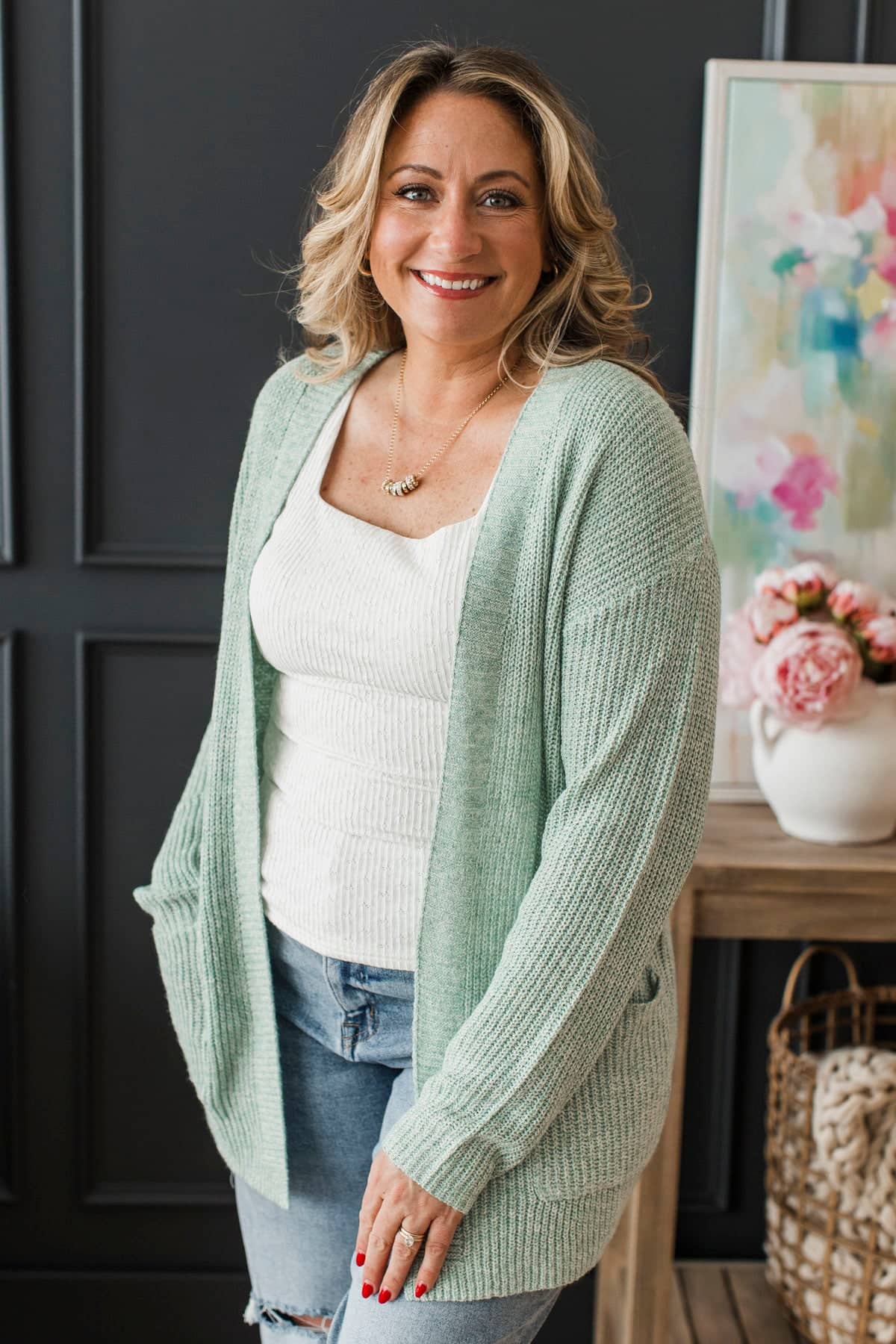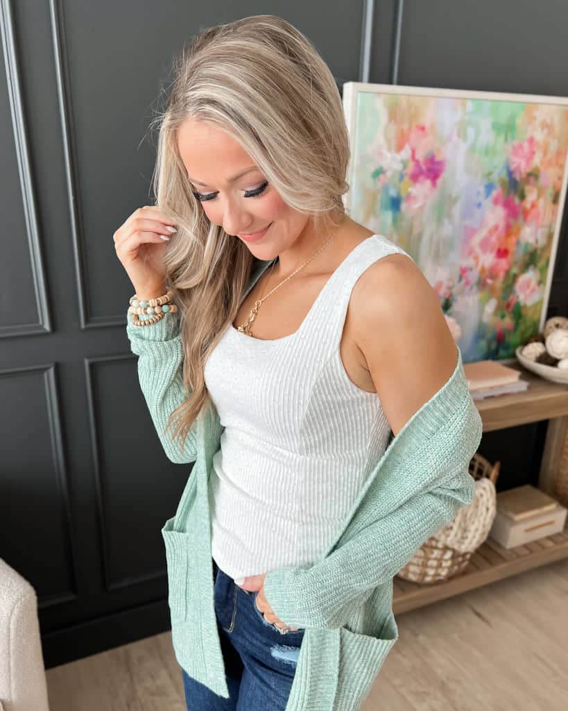 This beautiful mint green cardigan is such a great staple piece for cozy season! Style with your favorite tank tops and more.