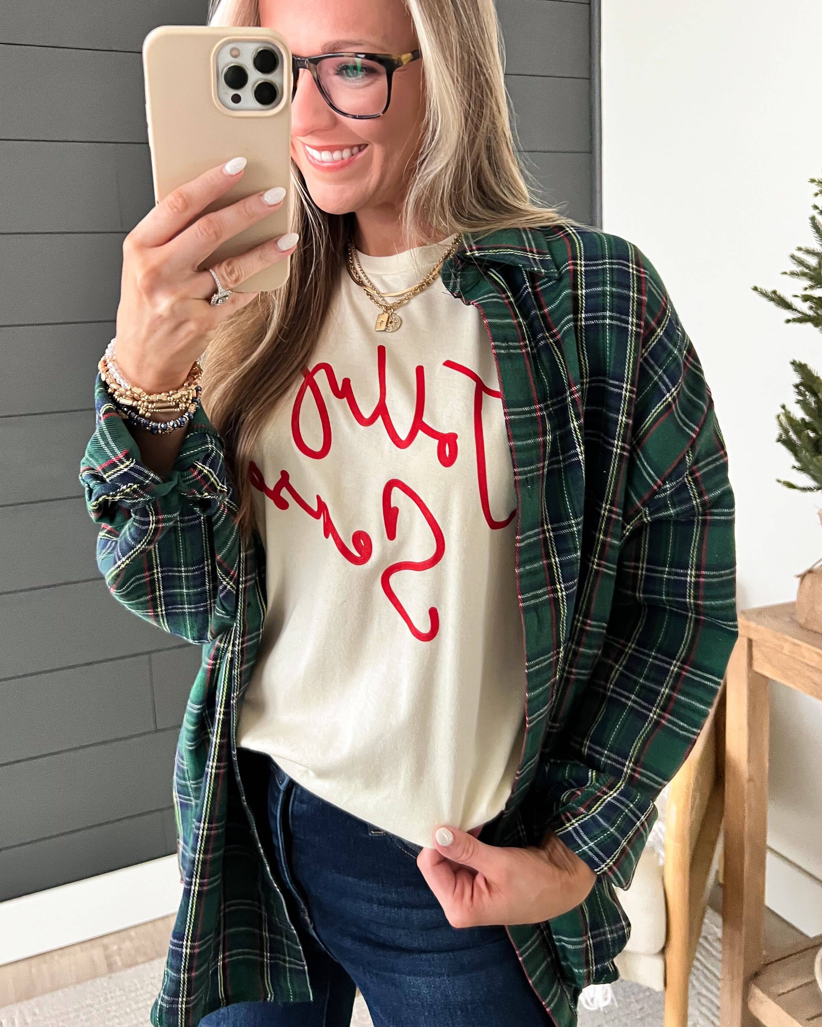 This graphic tee and plaid top combo is the perfect mix of festive and comfy! Pair with leggings for a cozy outfit or jeans for a more casual holiday look.