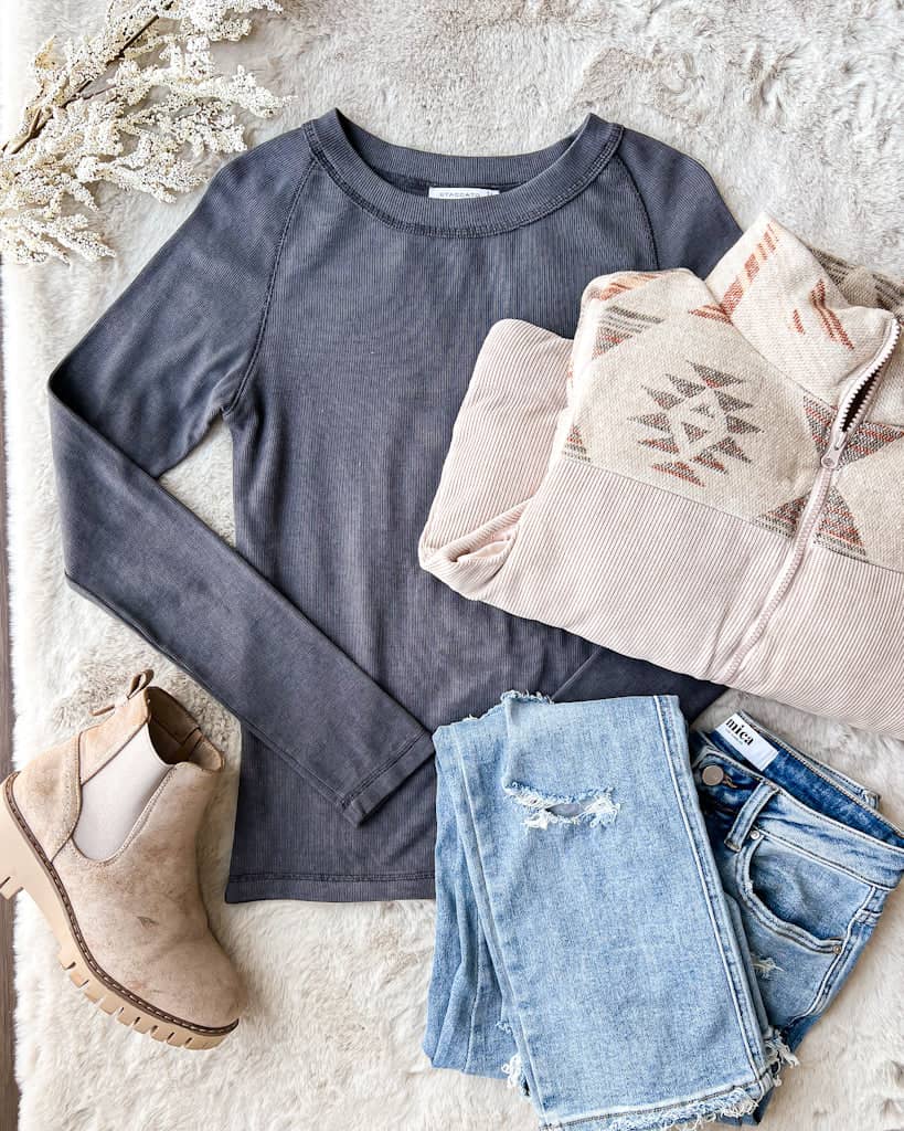 This adorable long sleeve top is great to style with puffer vests or jackets in the Winter! Pair with jeans and booties.